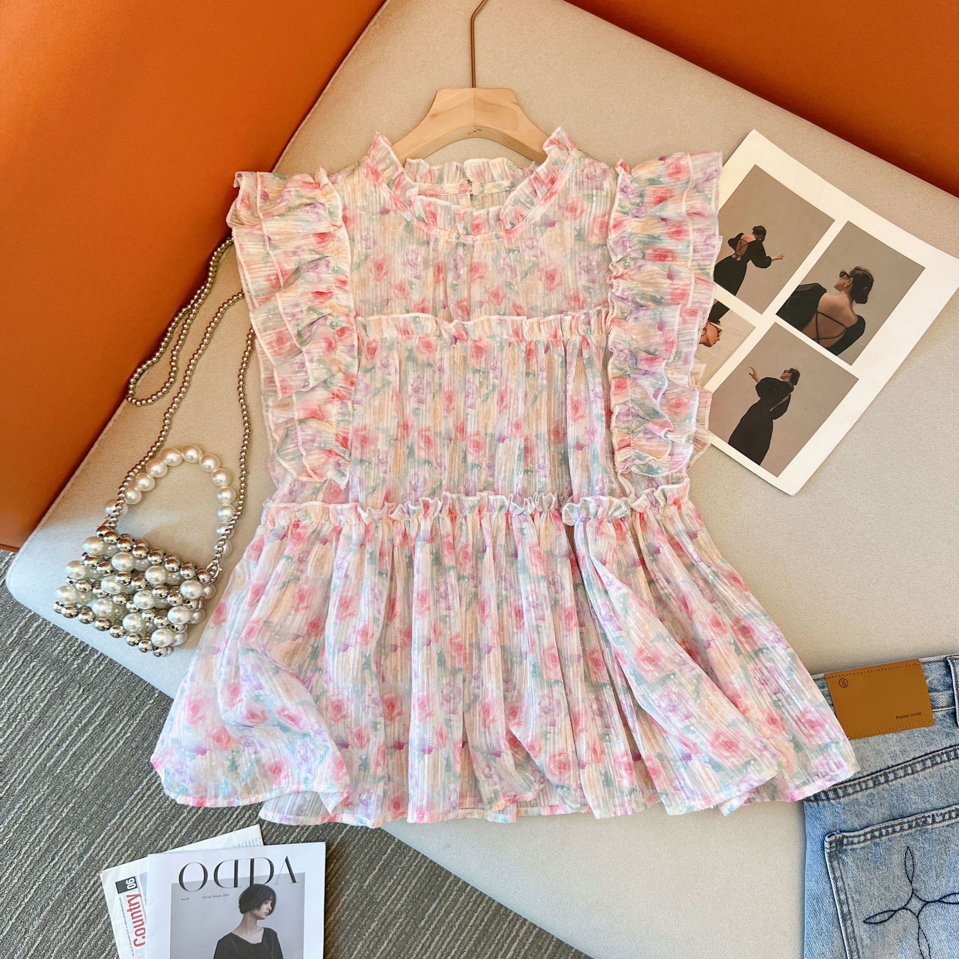 작은 신선한 스타일 여름 인형 셔츠 쉬폰 탑 여름 여자의 한국 스타일 달콤한 디자인 감각 작은 비행 소매 꽃 셔츠 2023스토어 가기
