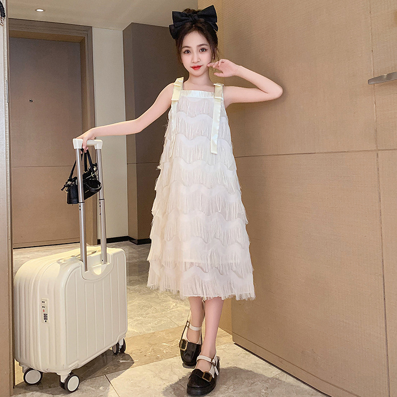 여아 여름 원피스 2023 새로운 고등학교 어린이 인터넷 연예인 여름 흰색 조끼 술 홀터 스커트 공주 치마