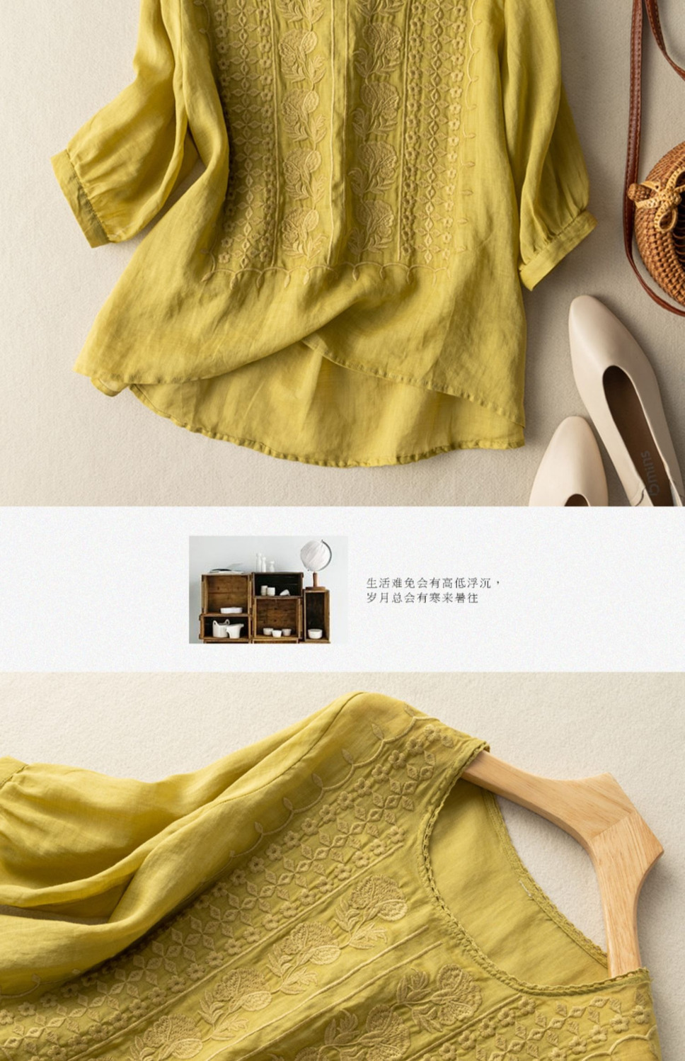 여름 얇은 자수 탑 여성의 예술적 복고풍 통기성 면과 린넨 반팔 티셔츠 라운드 칼라