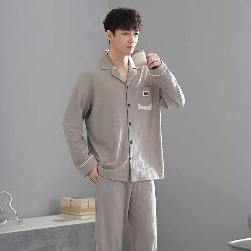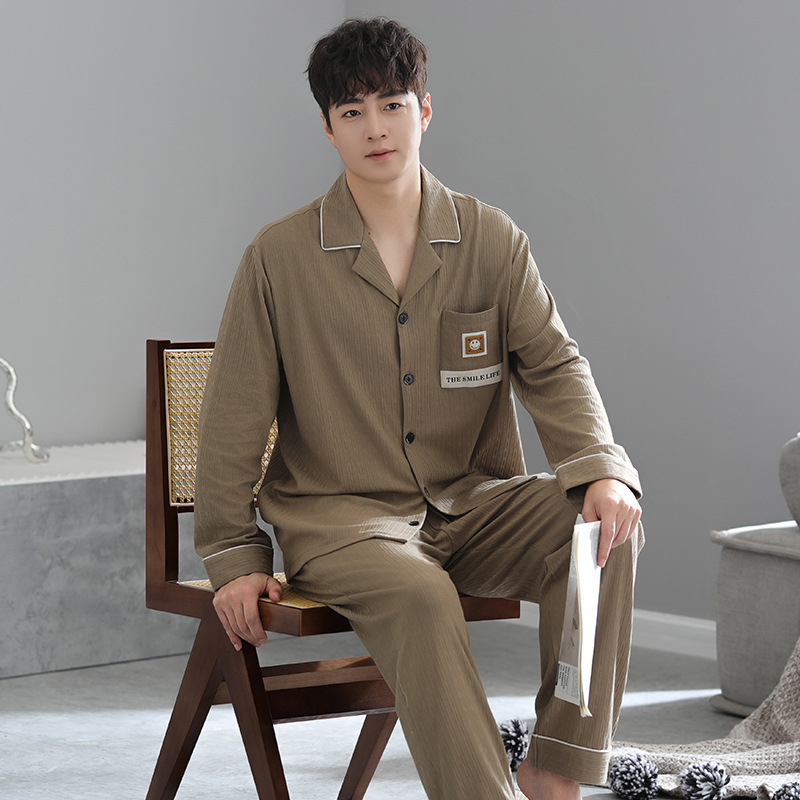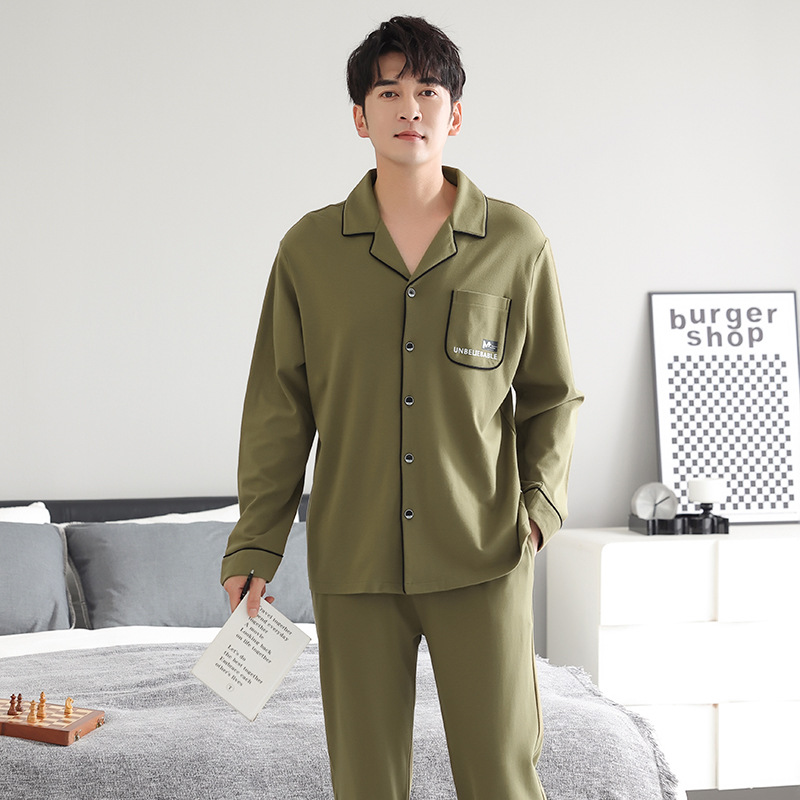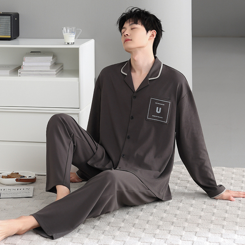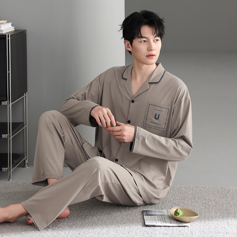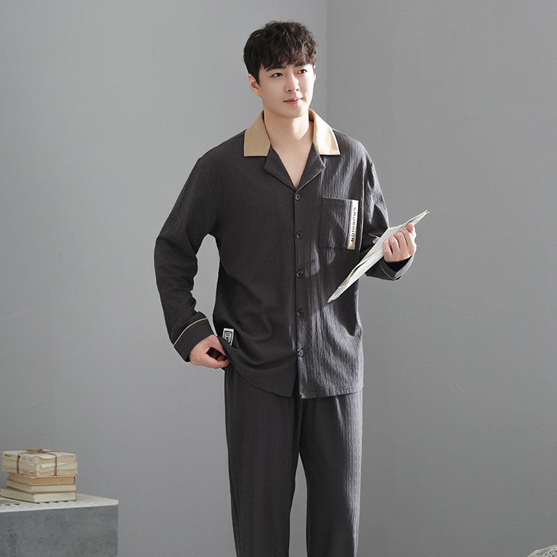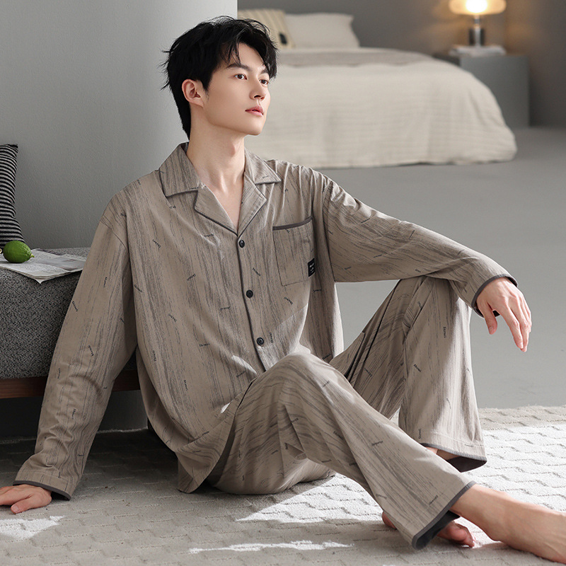 봄가을 시원한 면 카라 가디건 긴팔 긴바지 잠옷 남성용 가을 루즈핏 외출 가능 중년 홈웨어 세트