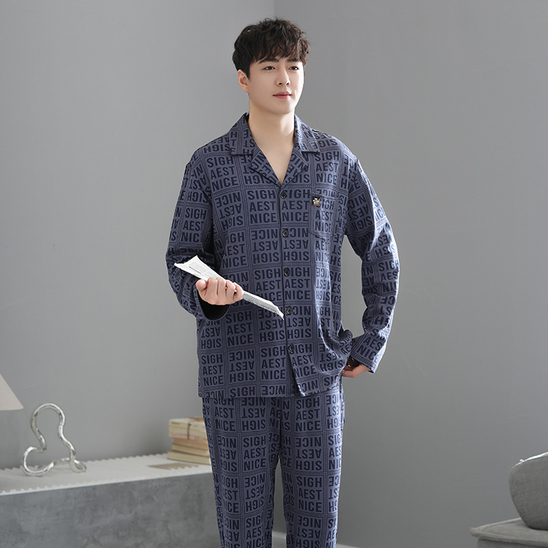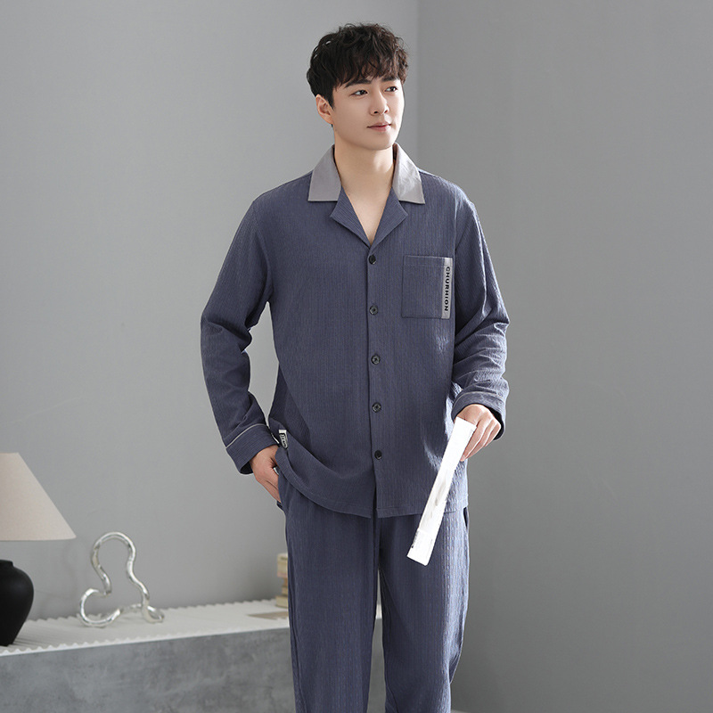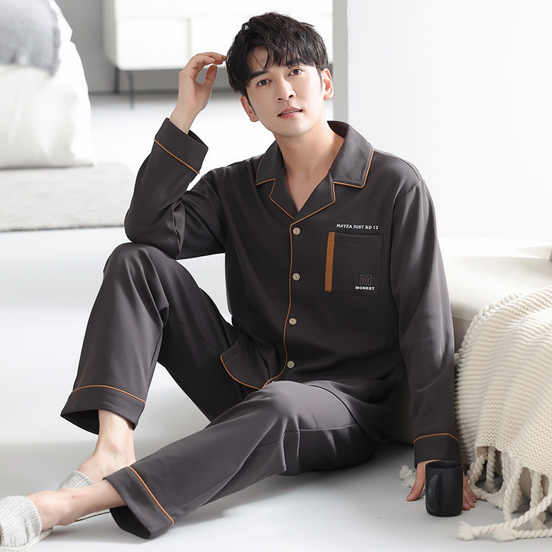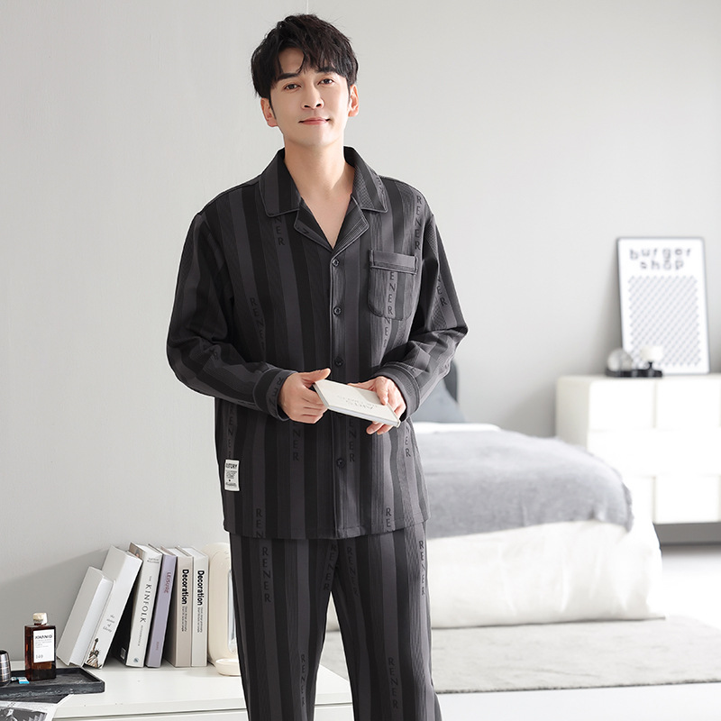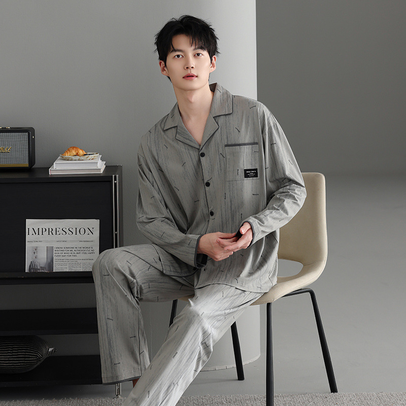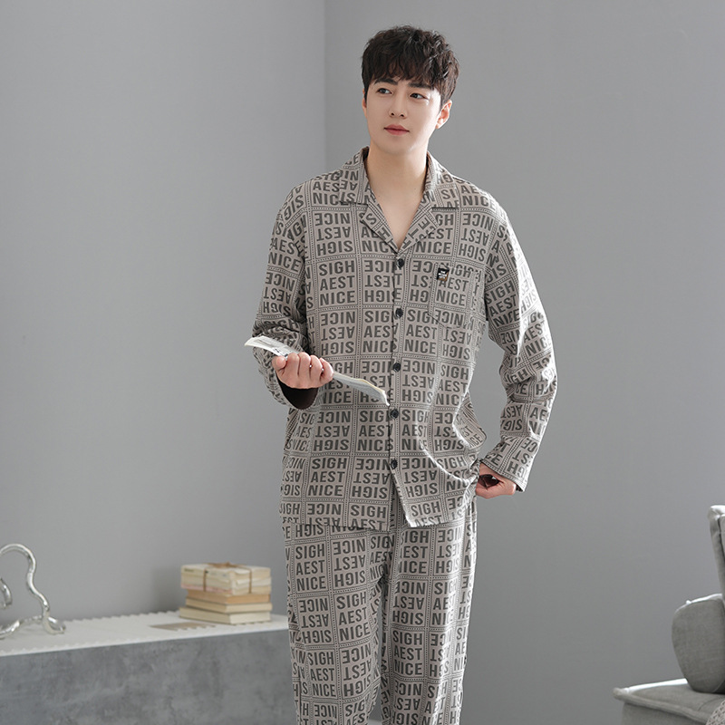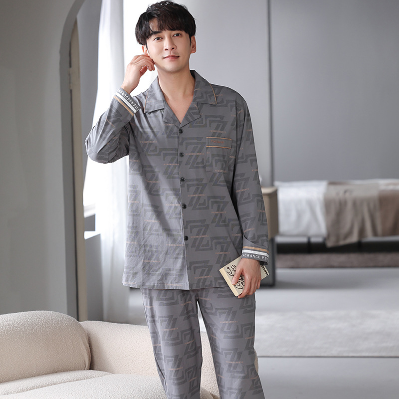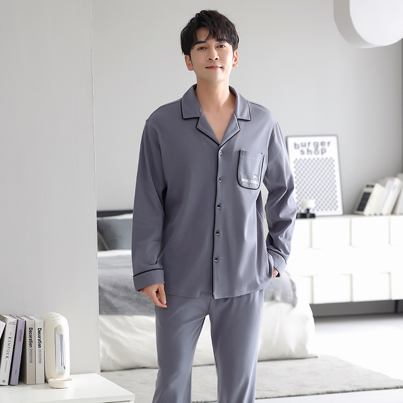 봄가을 시원한 면 카라 가디건 긴팔 긴바지 잠옷 남성용 가을 루즈핏 외출 가능 중년 홈웨어 세트스토어 가기