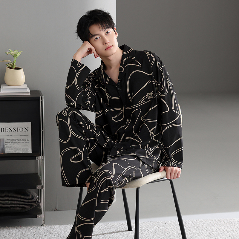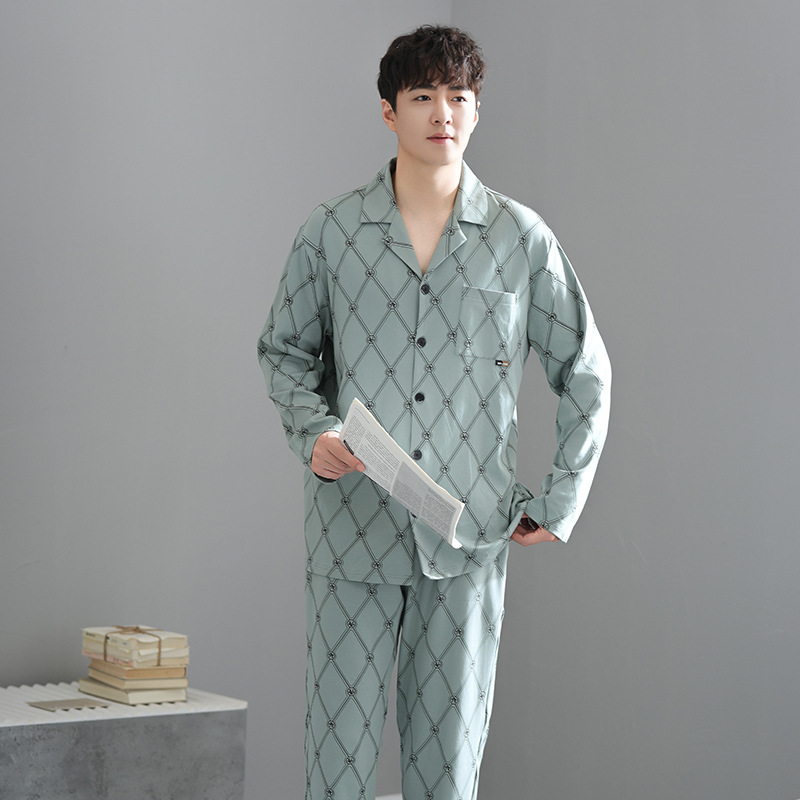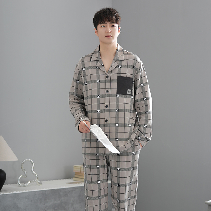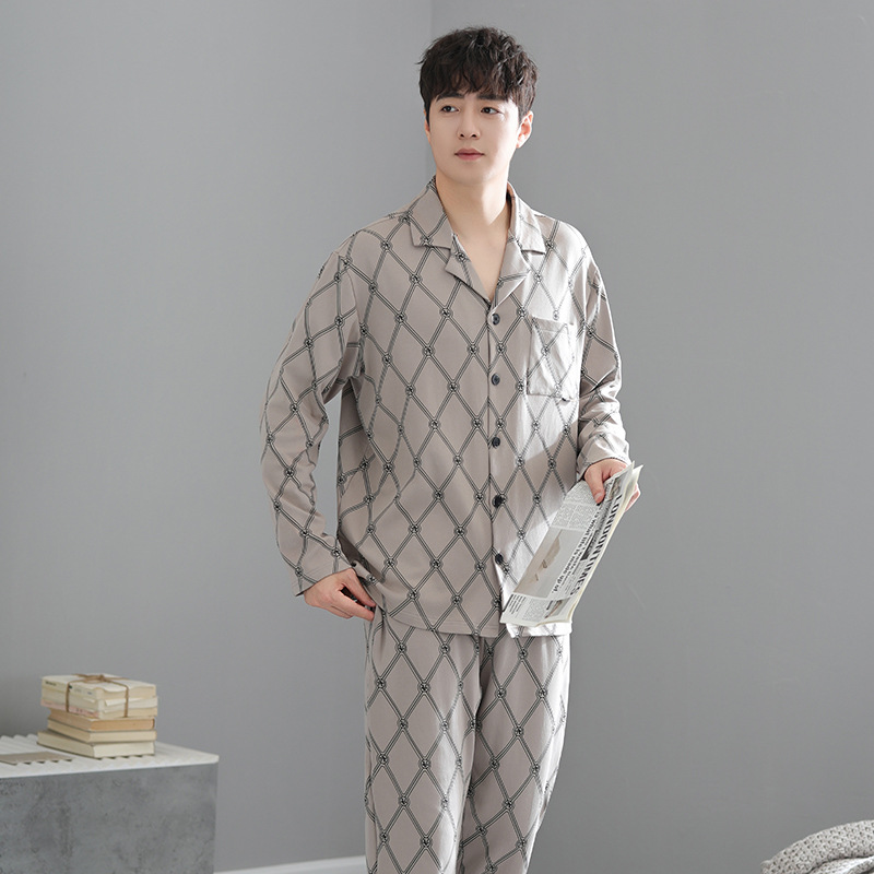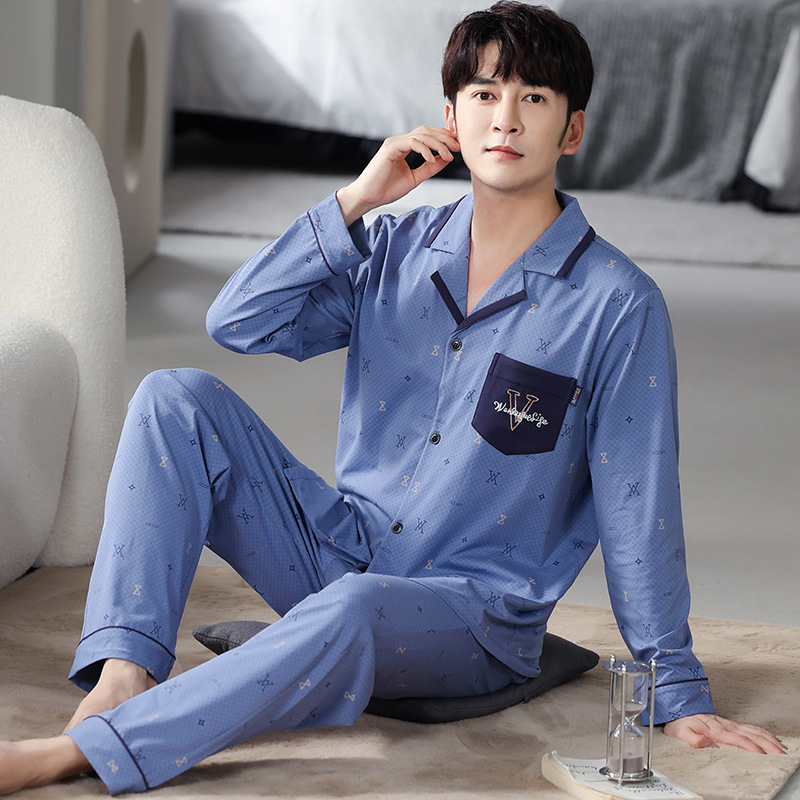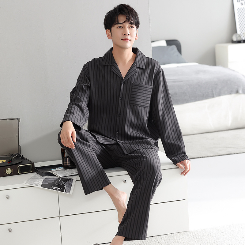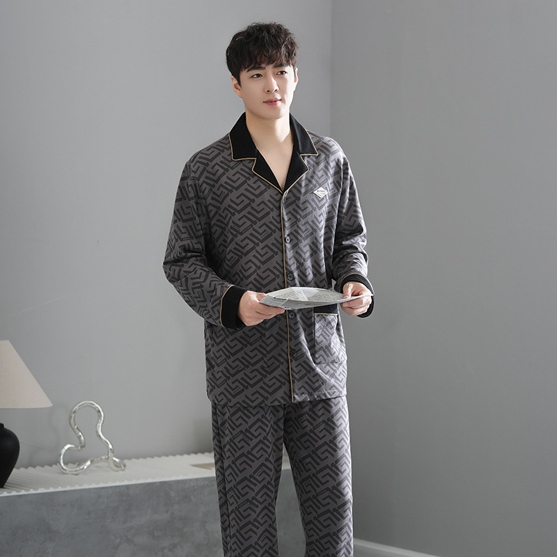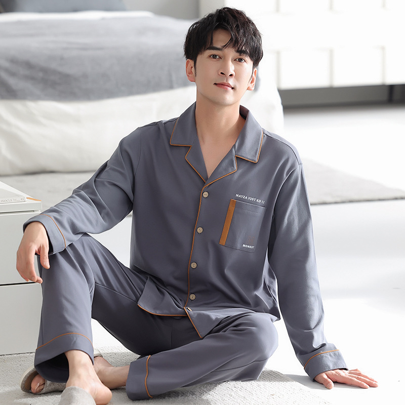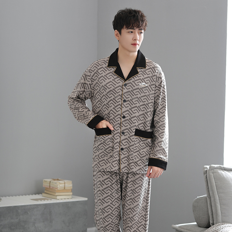 봄가을 시원한 면 카라 가디건 긴팔 긴바지 잠옷 남성용 가을 루즈핏 외출 가능 중년 홈웨어 세트스토어 가기