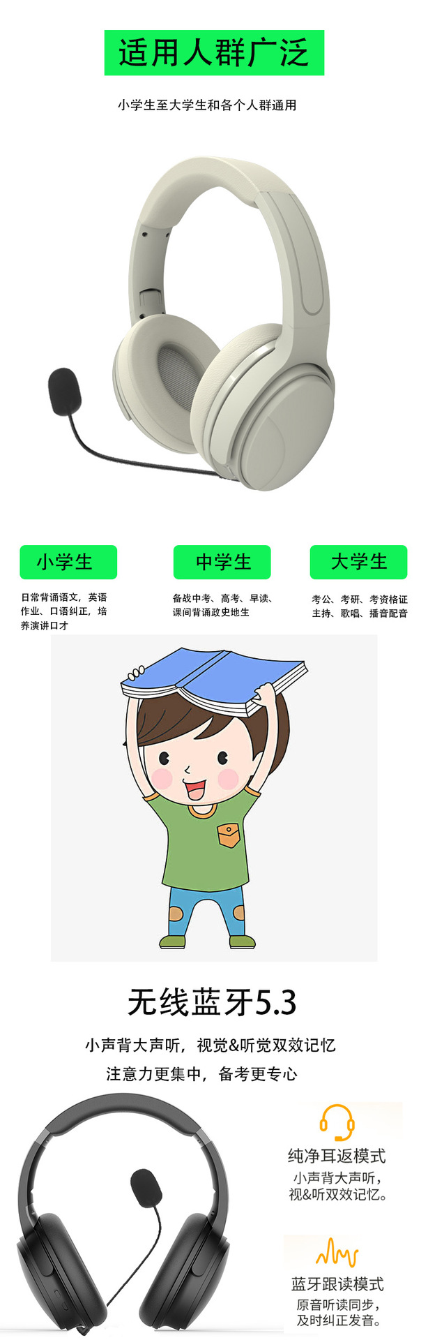 이어폰 학습을위한 이어폰 듣기 무선 블루투스 기능 귀 다시 이어폰을 가르치는 독서 메모리