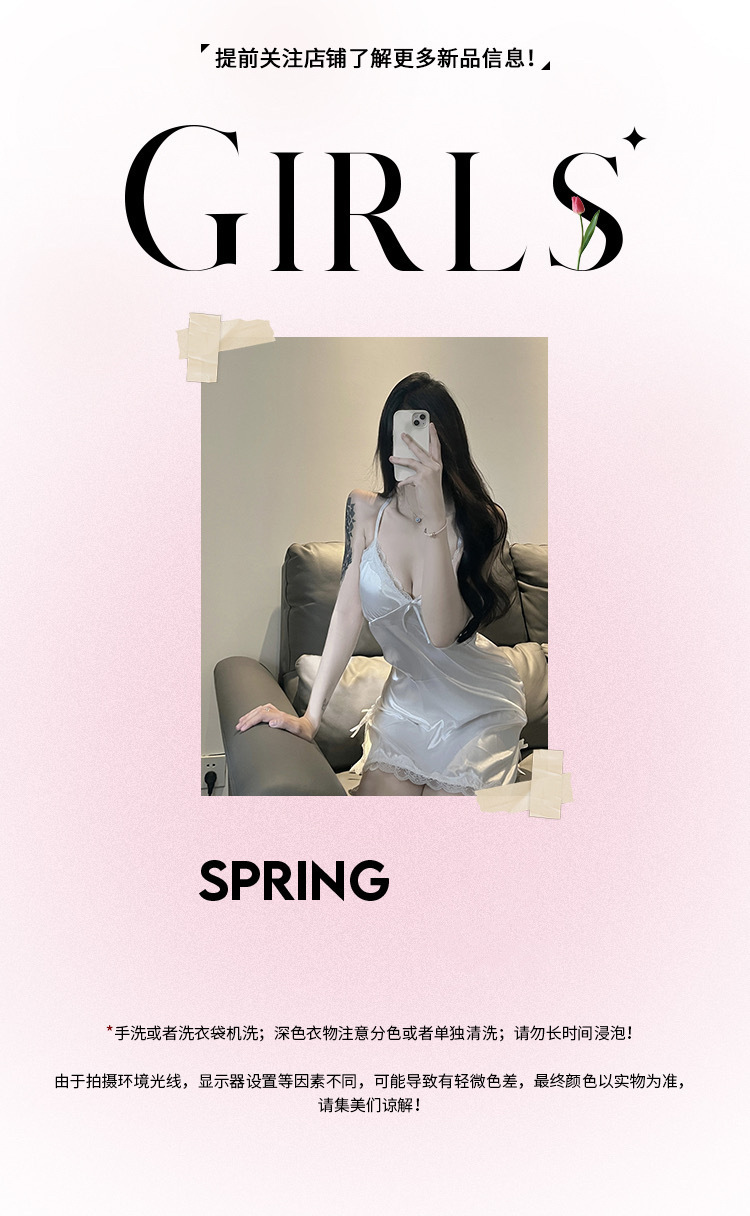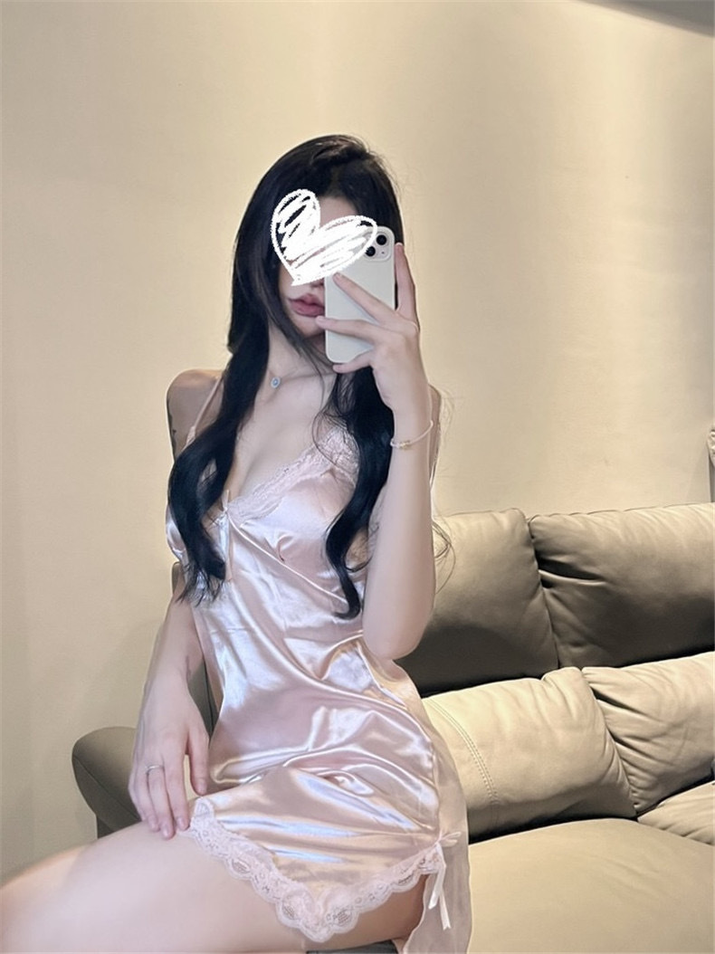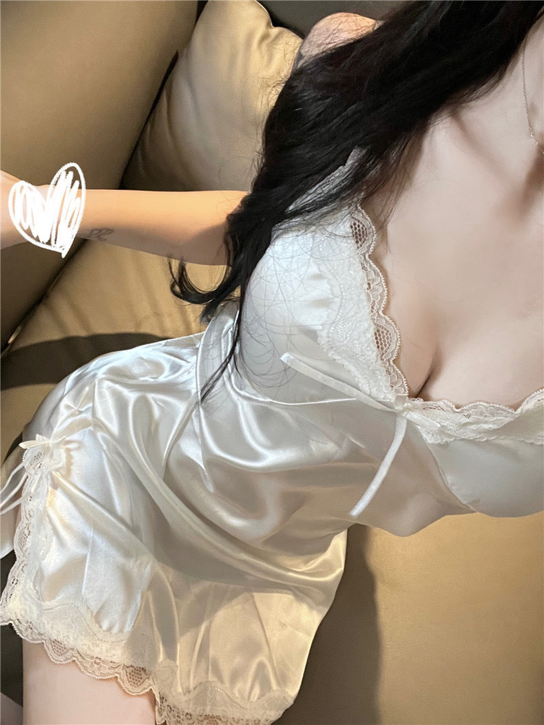 섹시한 잠옷 여성의 여름 새로운 아이스 실크 유혹 슬링 나이트 가운 가슴 패드 고급 레이스 홈 옷스토어 가기