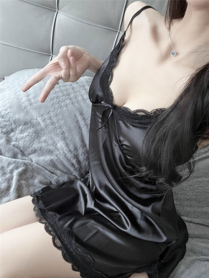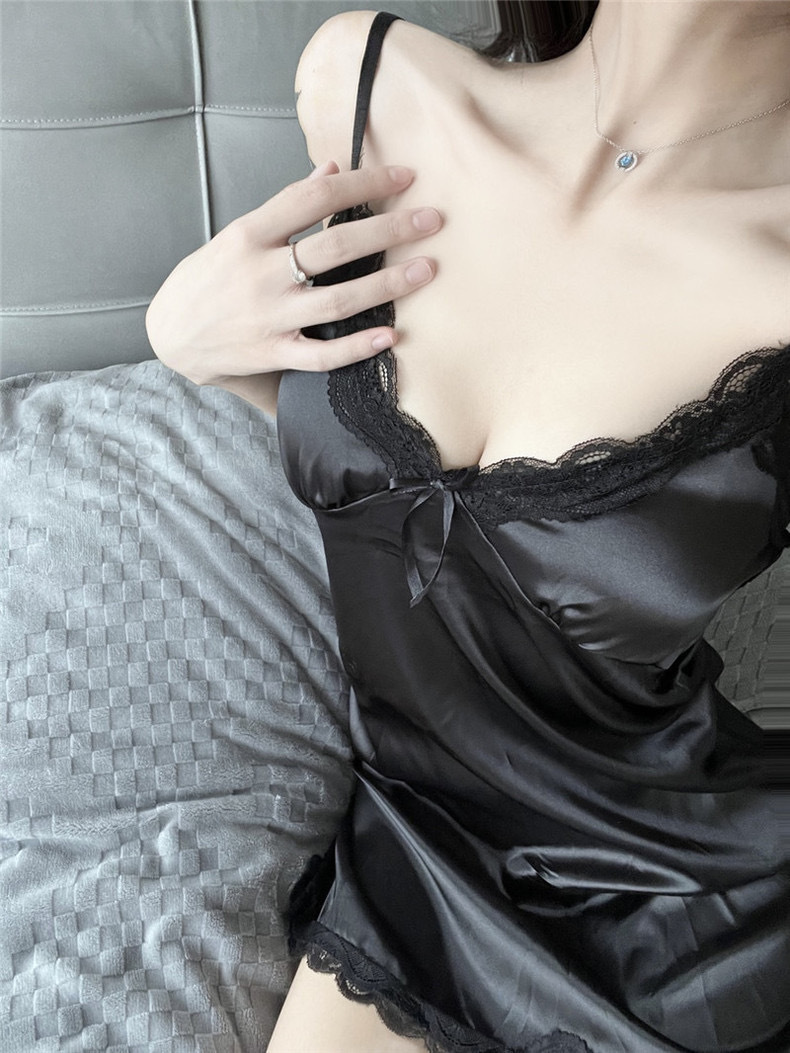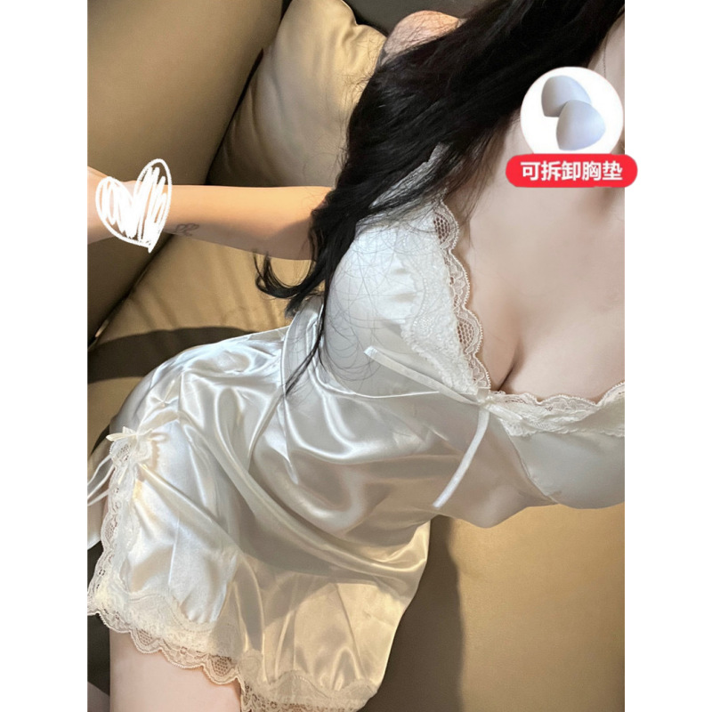 섹시한 잠옷 여성의 여름 새로운 아이스 실크 유혹 슬링 나이트 가운 가슴 패드 고급 레이스 홈 옷
