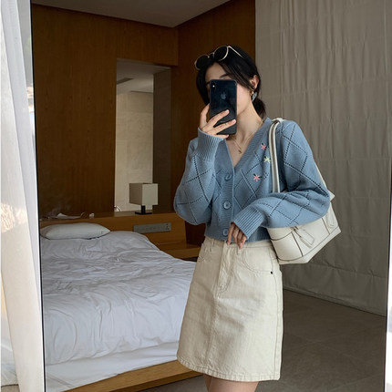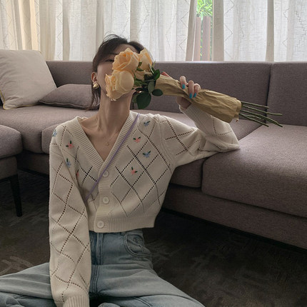 2024 봄 가을 신상 여성용 V넥 니트 탑, 레이지 스타일, 다용도, 루즈핏, 자수 가디건, 숏 자켓스토어 가기