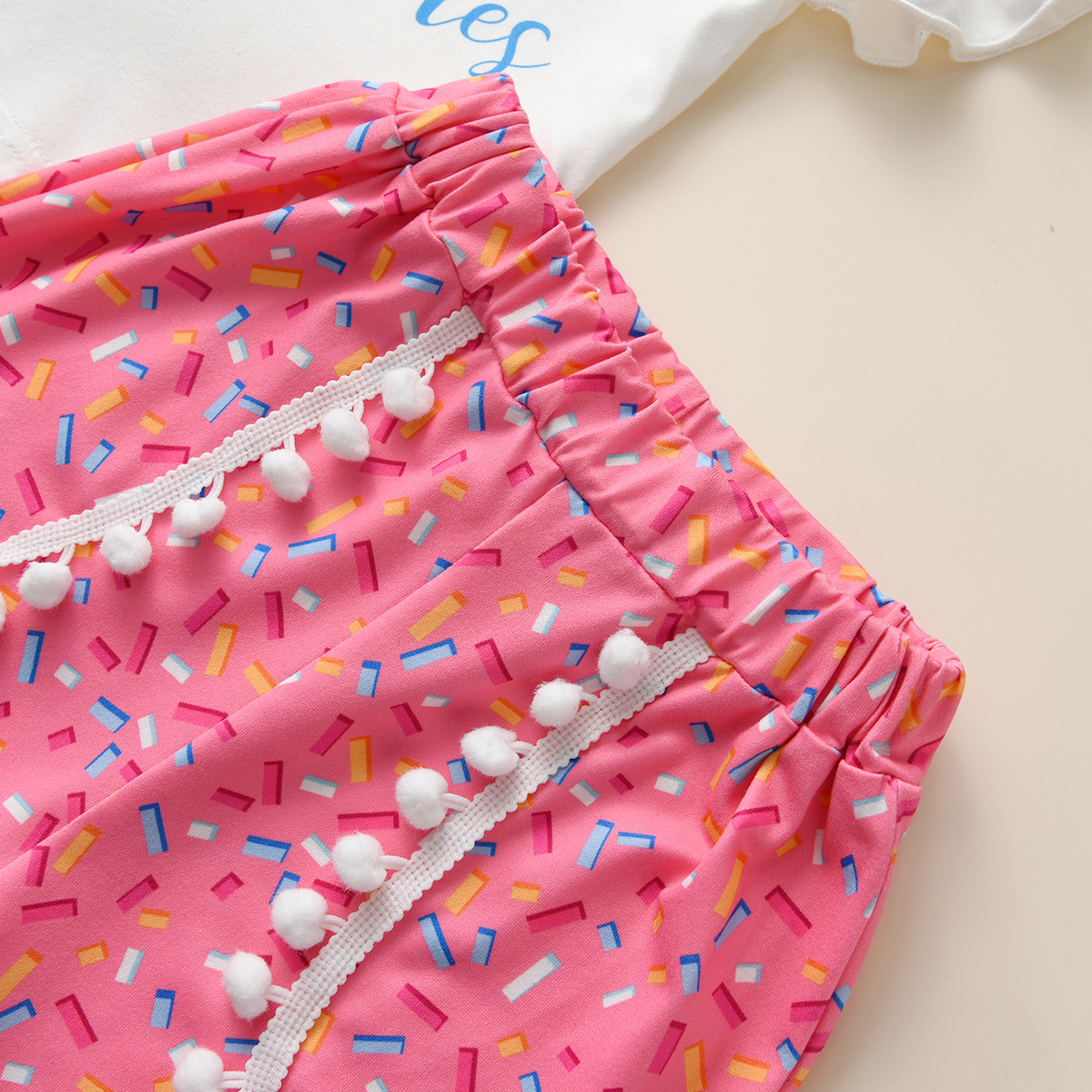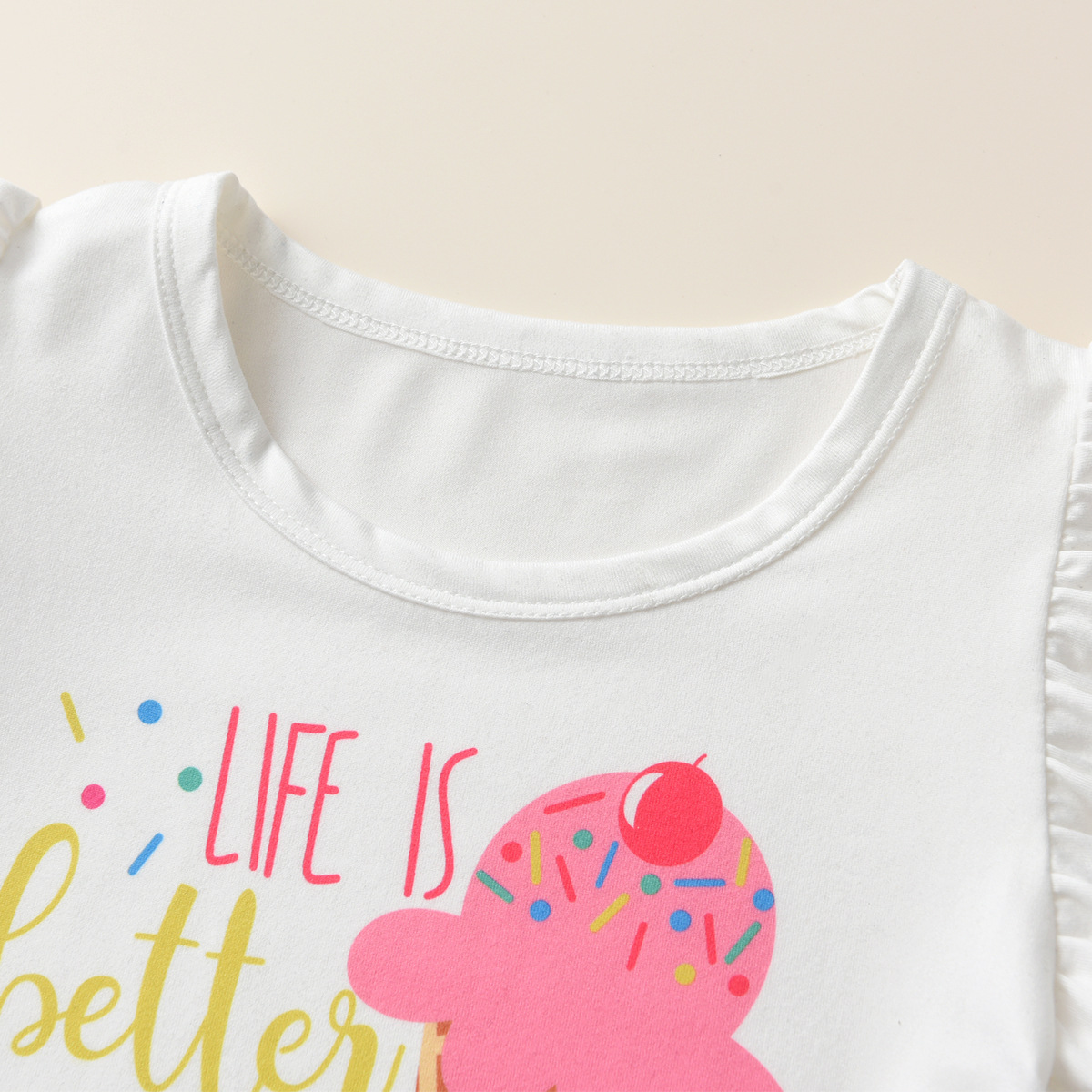 새로운 유럽과 미국 소녀 어린이 비행 슬리브 아이스크림 프린트 티셔츠 짧은 소매 세트 귀여운 티셔츠 반바지 투피스 세트