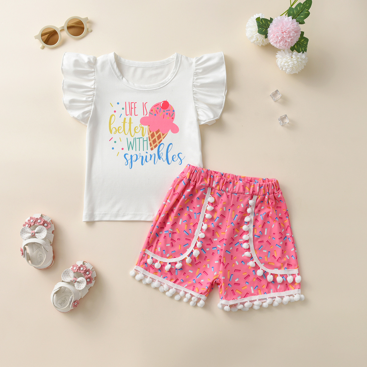 새로운 유럽과 미국 소녀 어린이 비행 슬리브 아이스크림 프린트 티셔츠 짧은 소매 세트 귀여운 티셔츠 반바지 투피스 세트스토어 가기