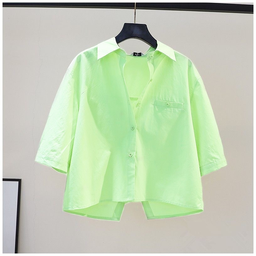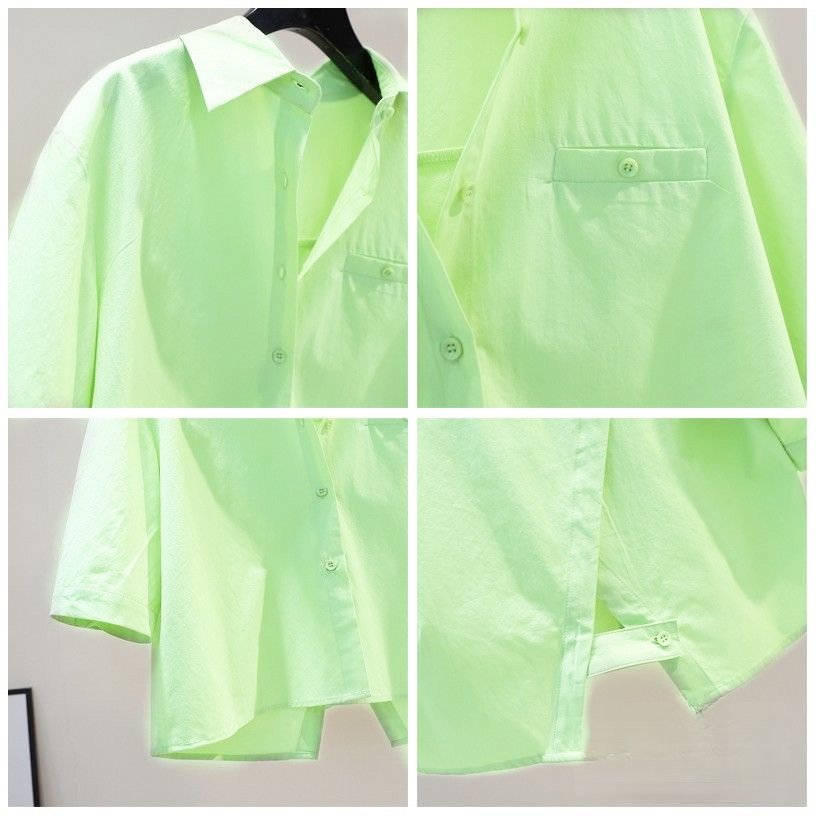 뒷면에 슬릿이 있는 짧은 스타일의 2023 여름 과일 그린 루즈핏 슬리밍 미디엄 슬리브 탑 셔츠 여성용 얇은 일본 및 한국 스타일