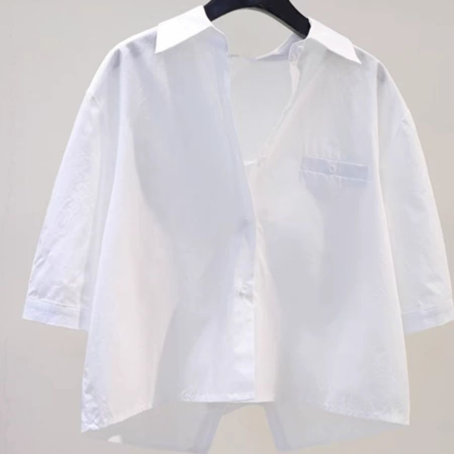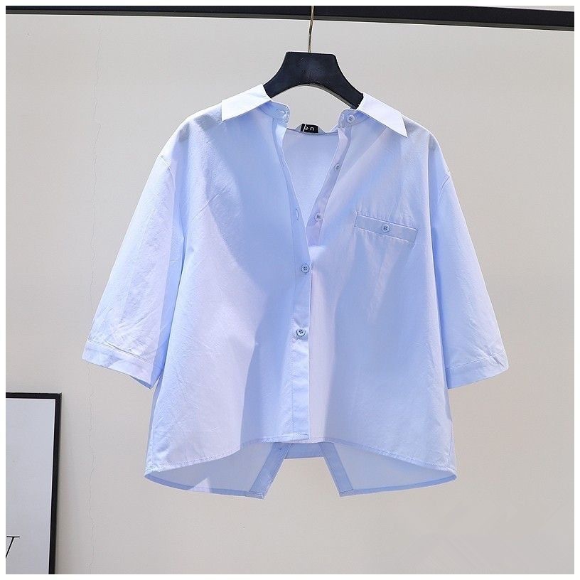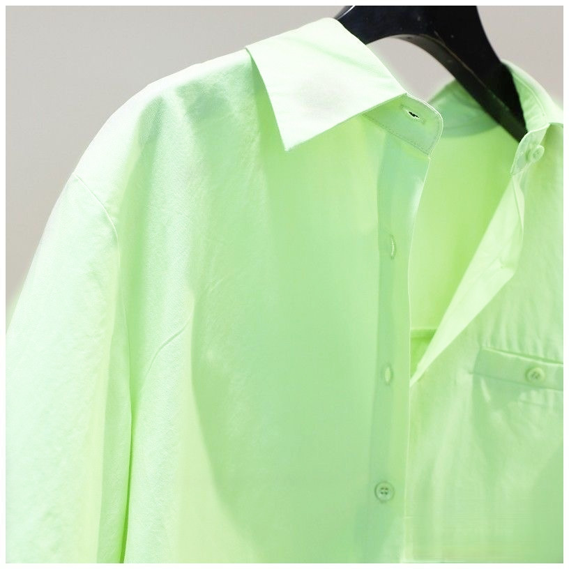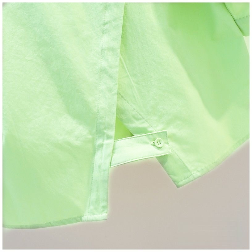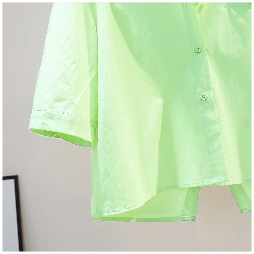 뒷면에 슬릿이 있는 짧은 스타일의 2023 여름 과일 그린 루즈핏 슬리밍 미디엄 슬리브 탑 셔츠 여성용 얇은 일본 및 한국 스타일스토어 가기