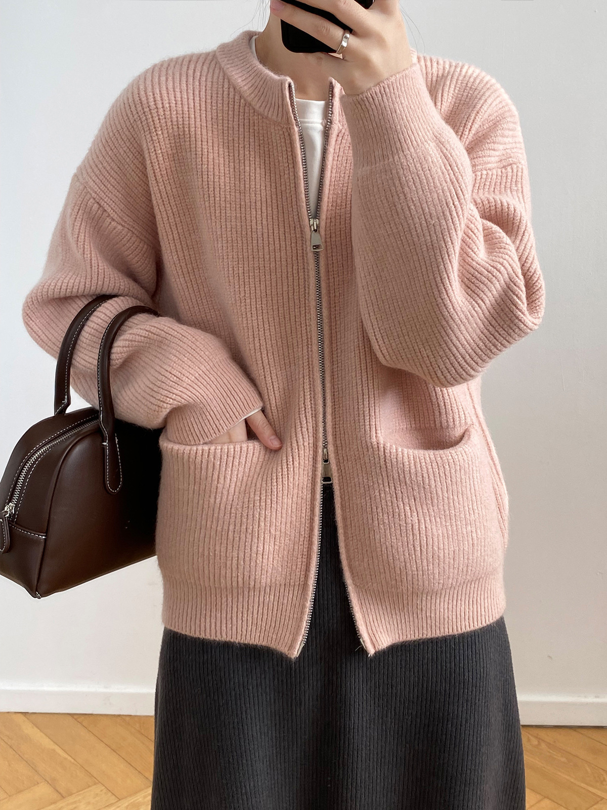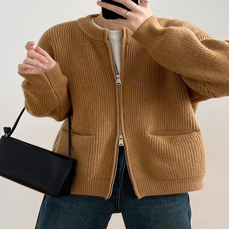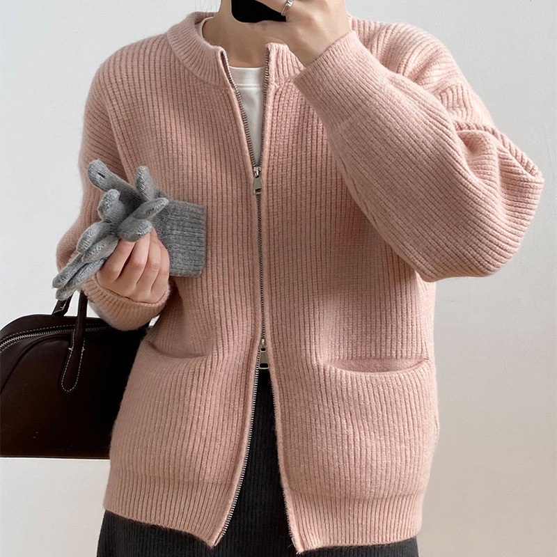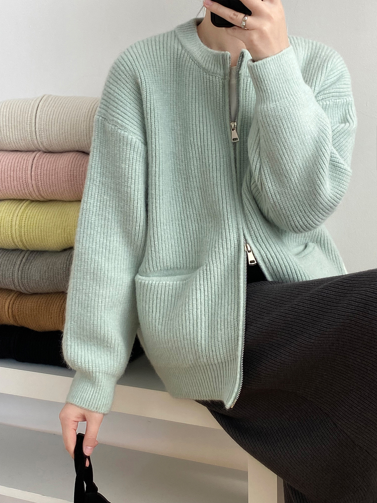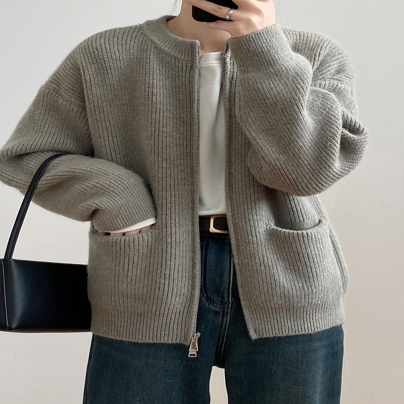 빈티지 솔리드 컬러 게으른 스타일 고급 피트 더블 지퍼 니트 가디건 여성용 느슨한 부드러운 왁스 우아한 스웨터 재킷