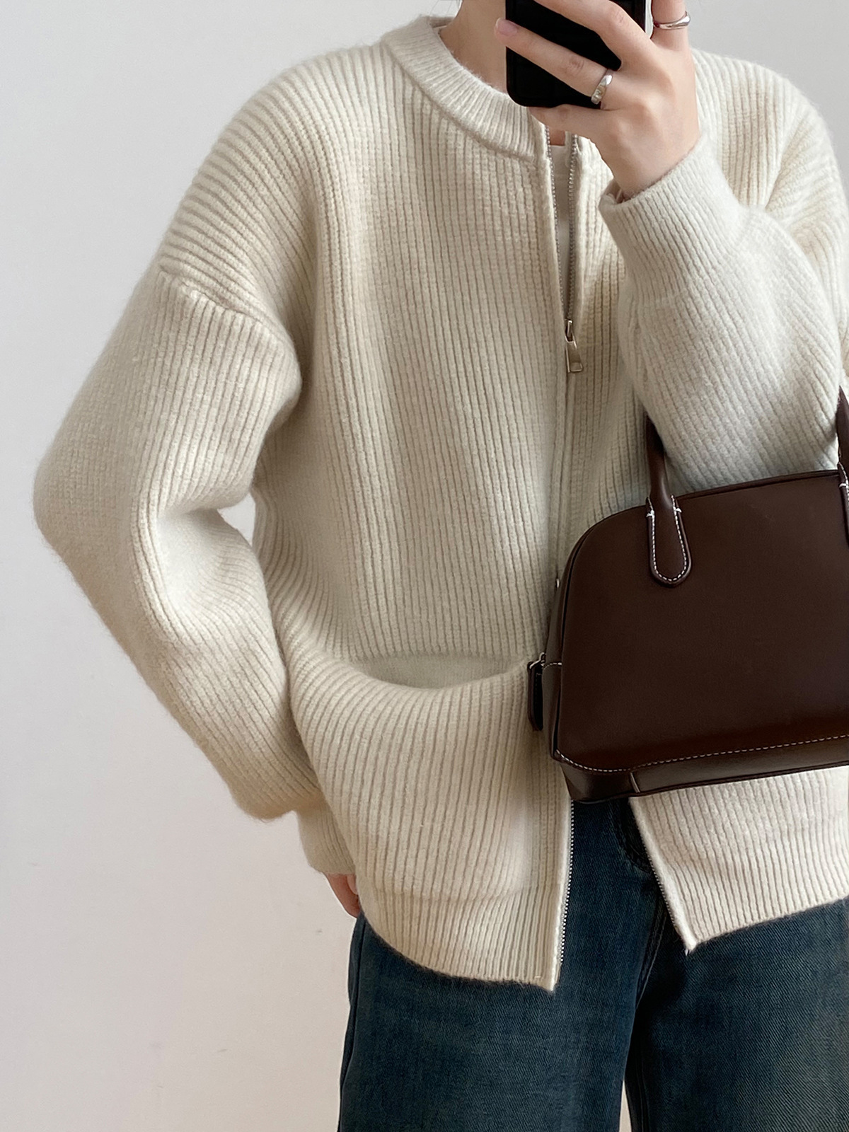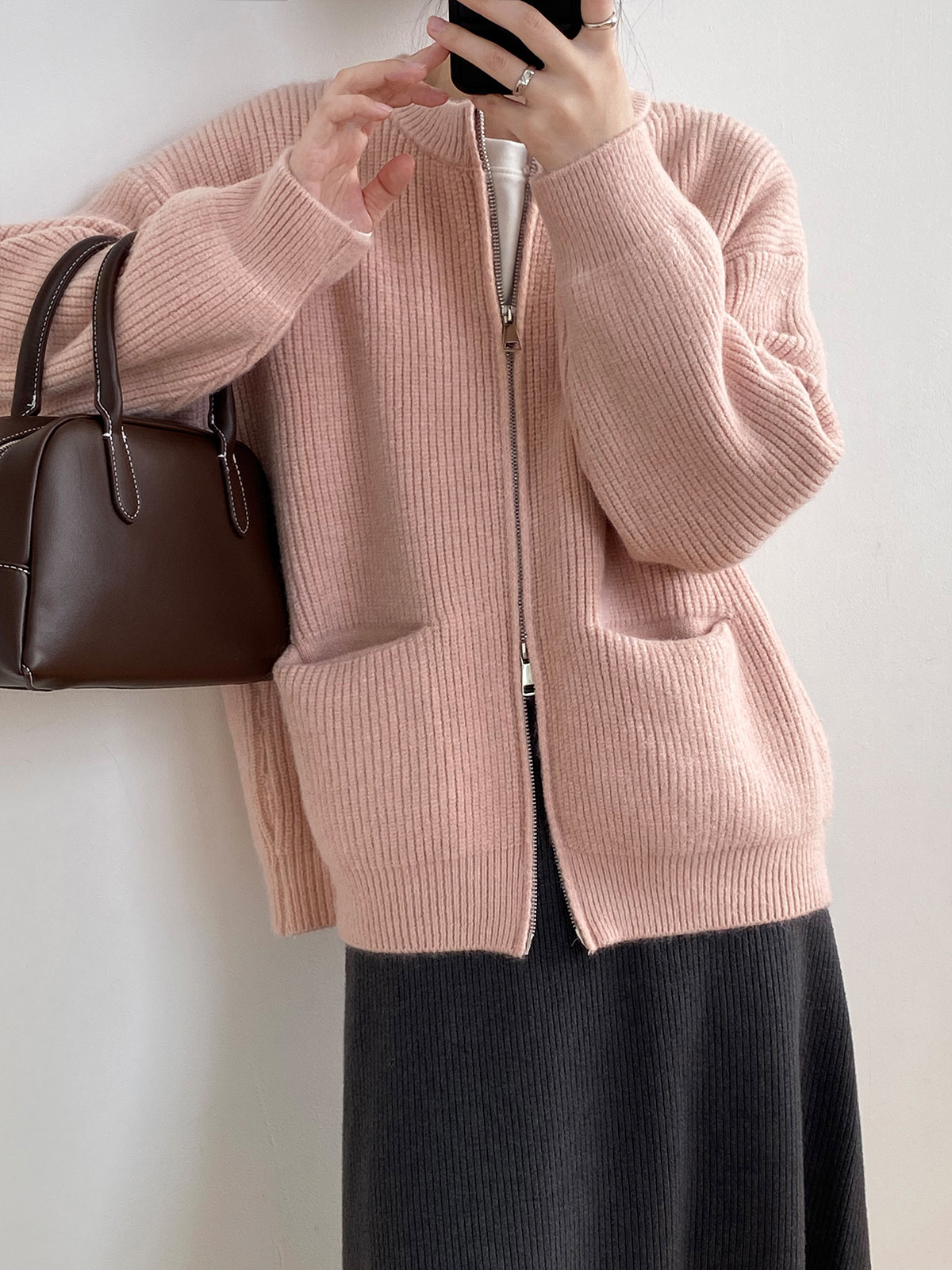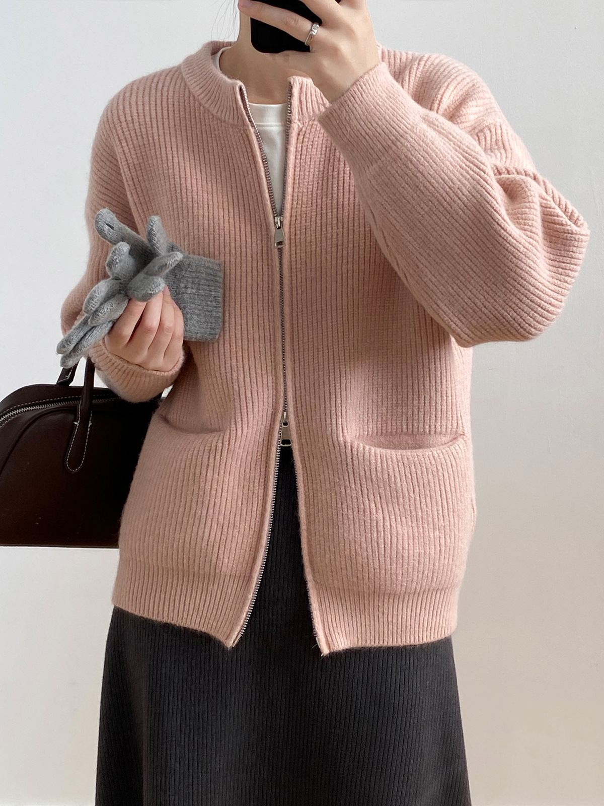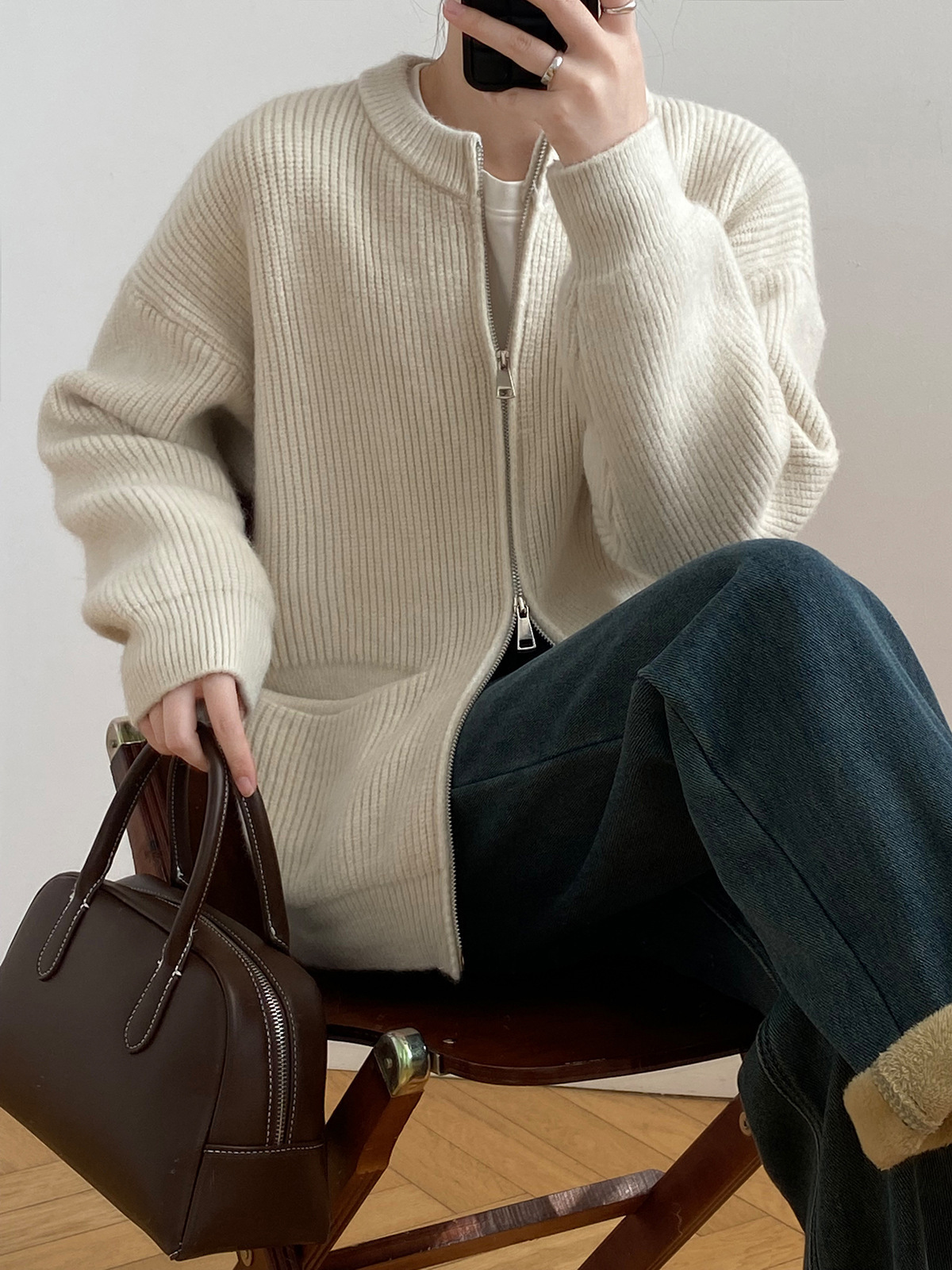 빈티지 솔리드 컬러 게으른 스타일 고급 피트 더블 지퍼 니트 가디건 여성용 느슨한 부드러운 왁스 우아한 스웨터 재킷