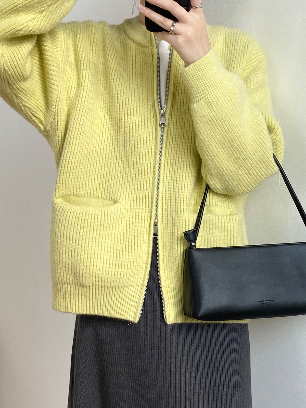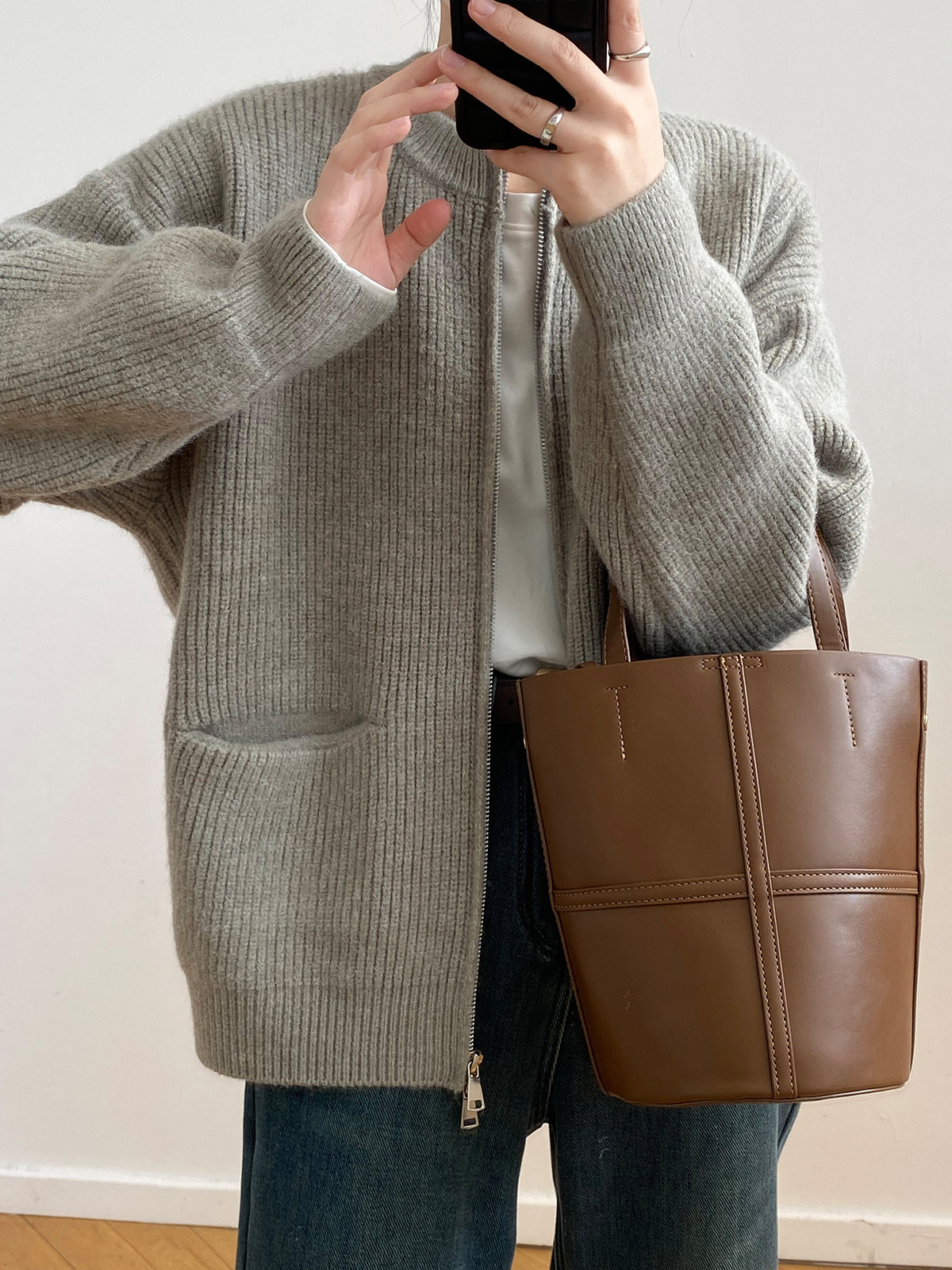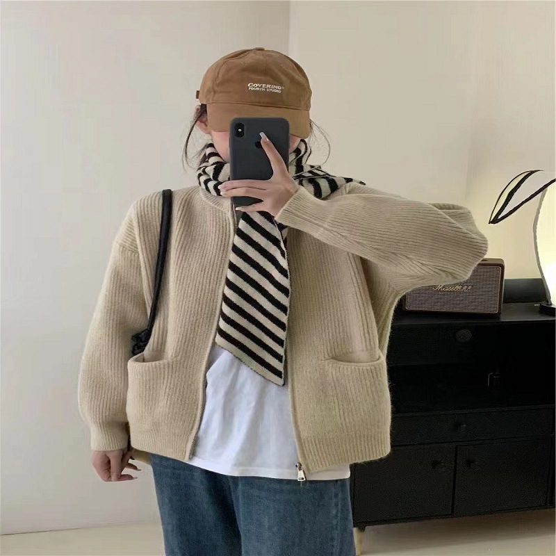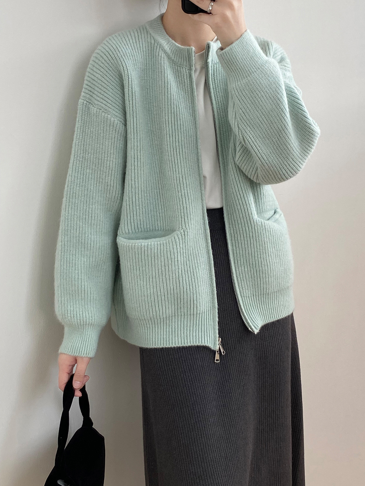 빈티지 솔리드 컬러 게으른 스타일 고급 피트 더블 지퍼 니트 가디건 여성용 느슨한 부드러운 왁스 우아한 스웨터 재킷