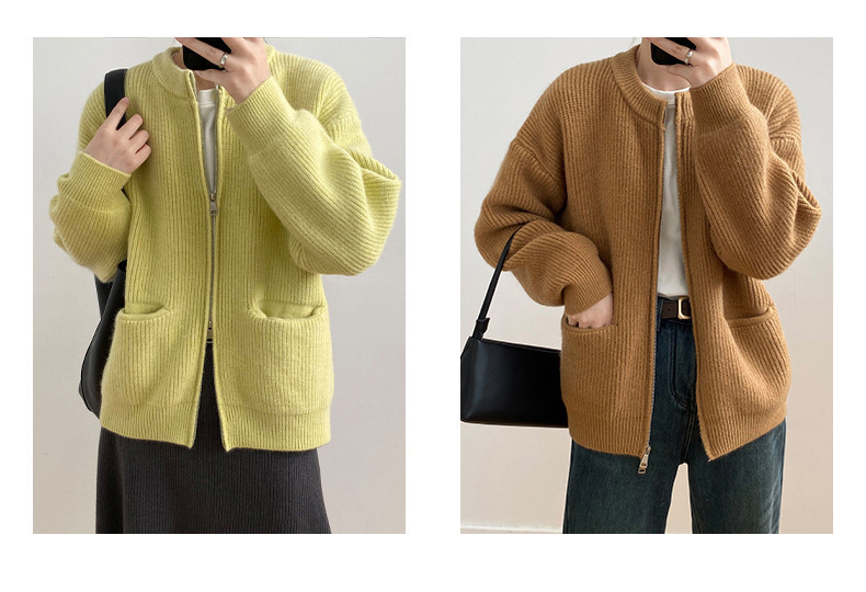 빈티지 솔리드 컬러 게으른 스타일 고급 피트 더블 지퍼 니트 가디건 여성용 느슨한 부드러운 왁스 우아한 스웨터 재킷스토어 가기