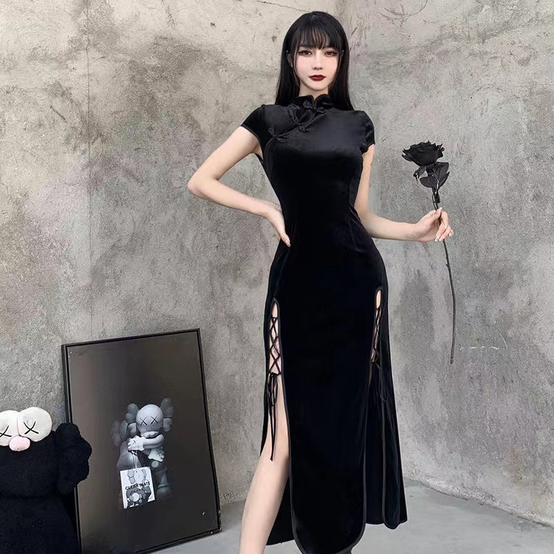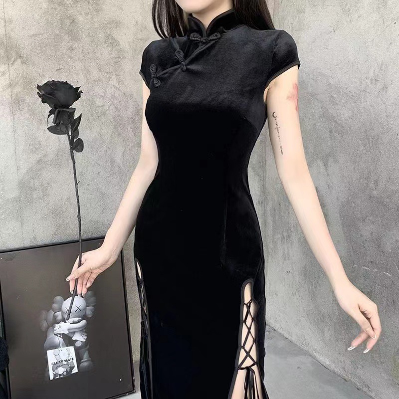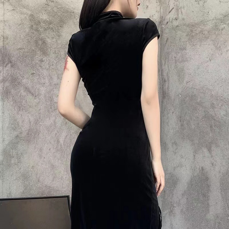 빈티지 중국 스타일 벨벳 치파오 개선 원피스 새로운 중국 스타일 스플릿 키 쿨 서우 블랙 우아한 긴 원피스
