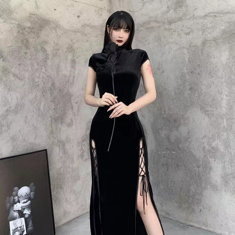빈티지 중국 스타일 벨벳 치파오 개선 원피스 새로운 중국 스타일 스플릿 키 쿨 서우 블랙 우아한 긴 원피스스토어 가기