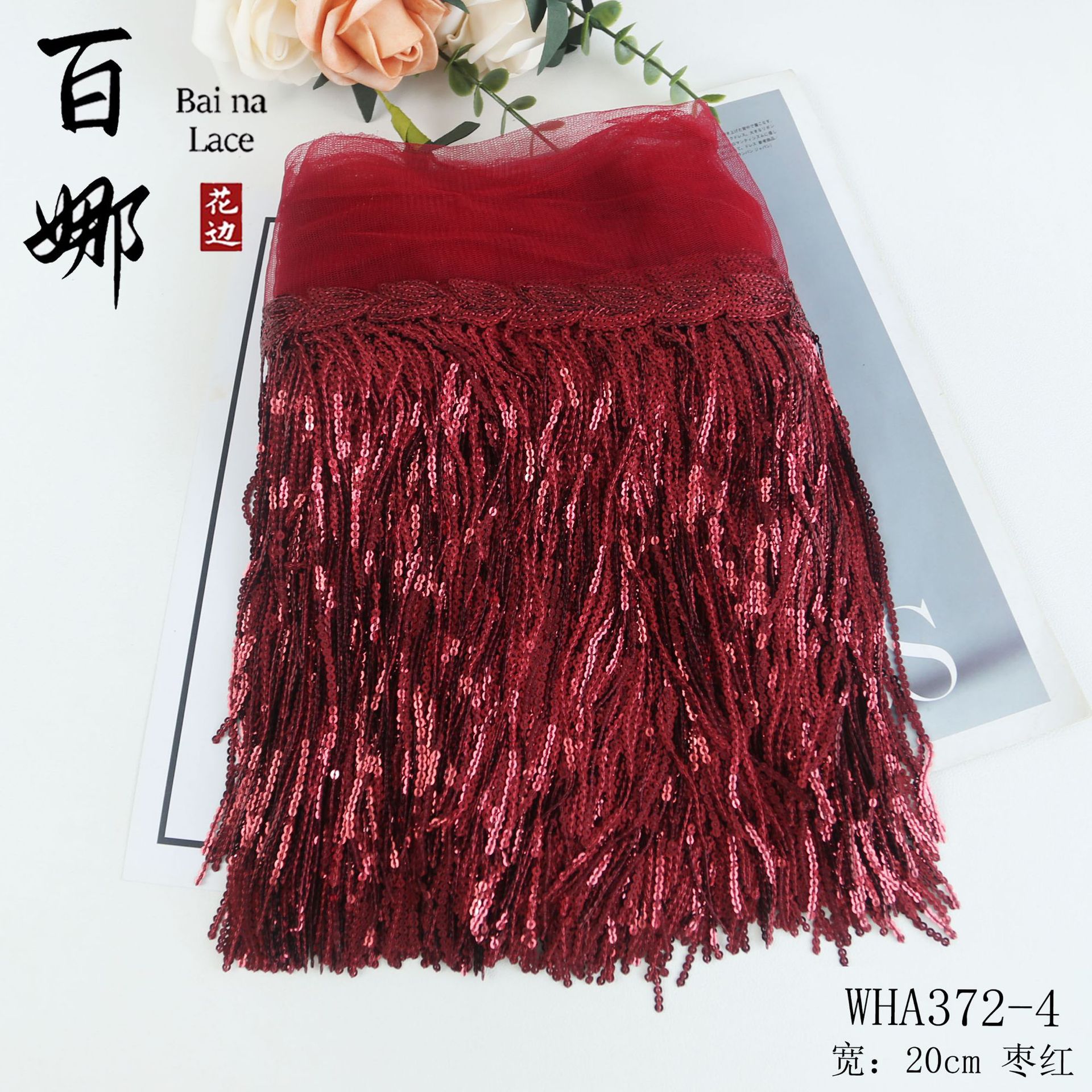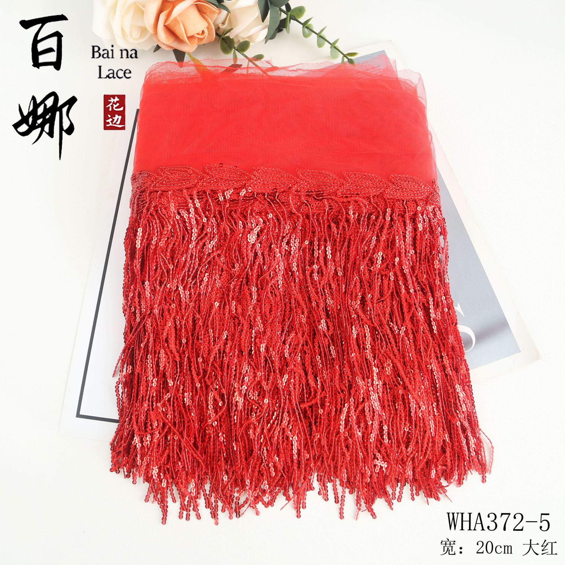 • 20cm*로즈 레드*스팽글 태슬 레이스 10야드/롤