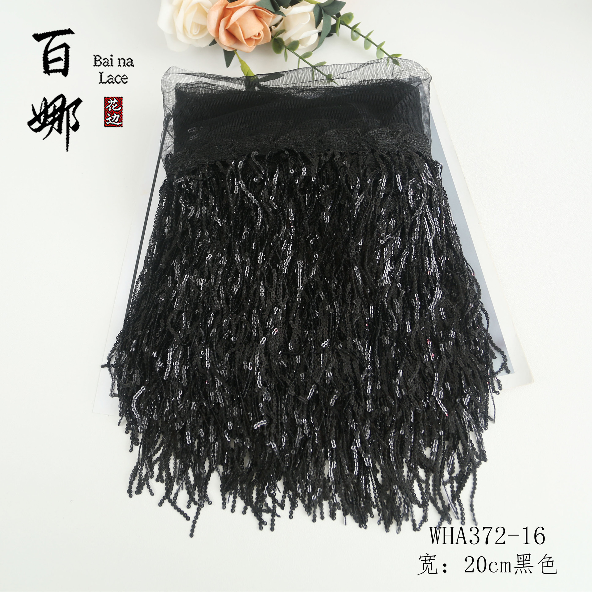 • 20cm 블랙 글리터 태슬 레이스, 10야드/롤