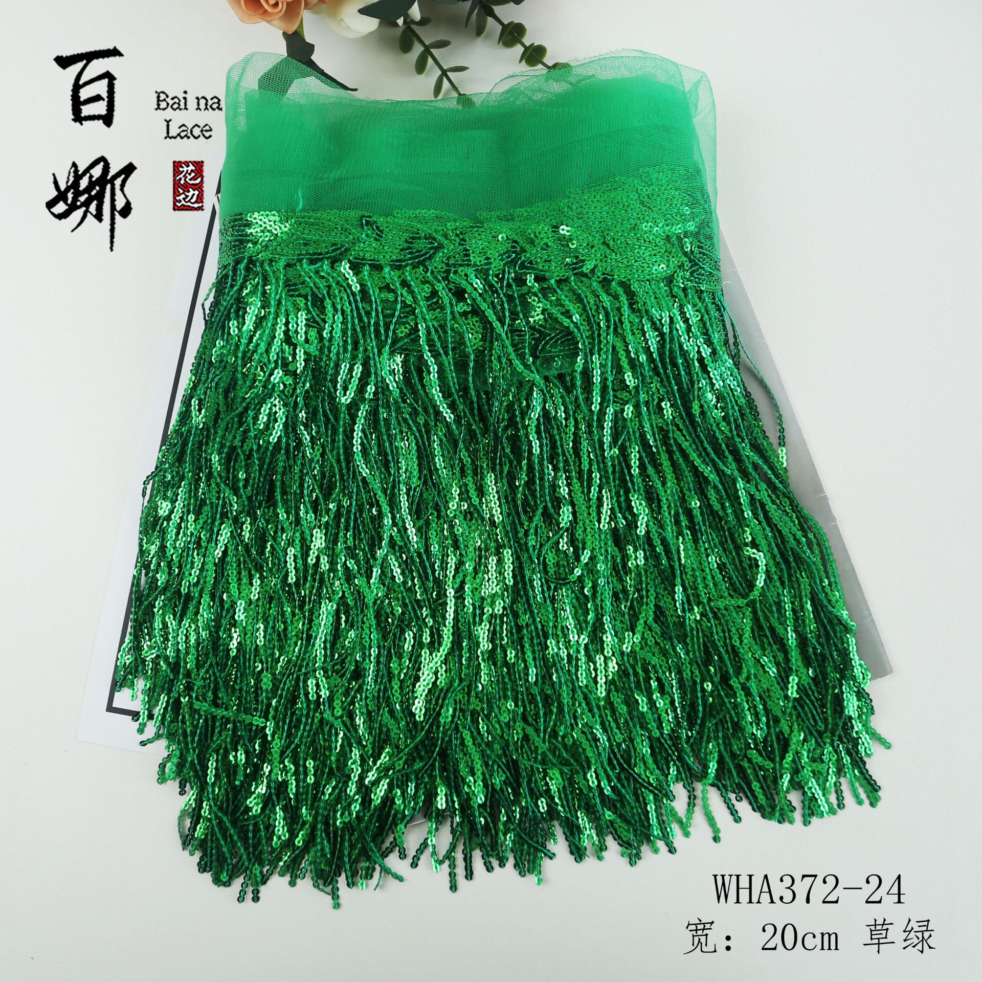 • 20cm*잔디 녹색*스팽글 술 레이스 10야드/롤