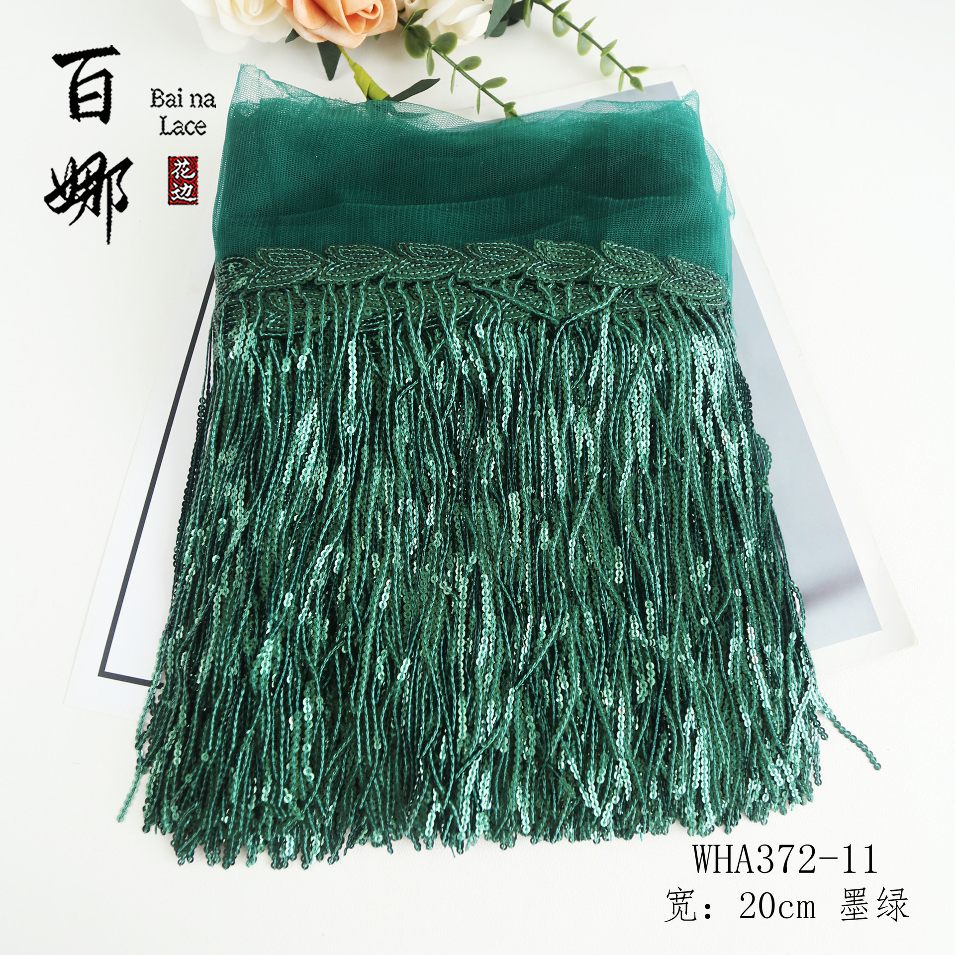 • 20cm*짙은 녹색*스팽글 술 레이스 10야드/롤