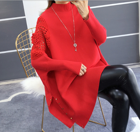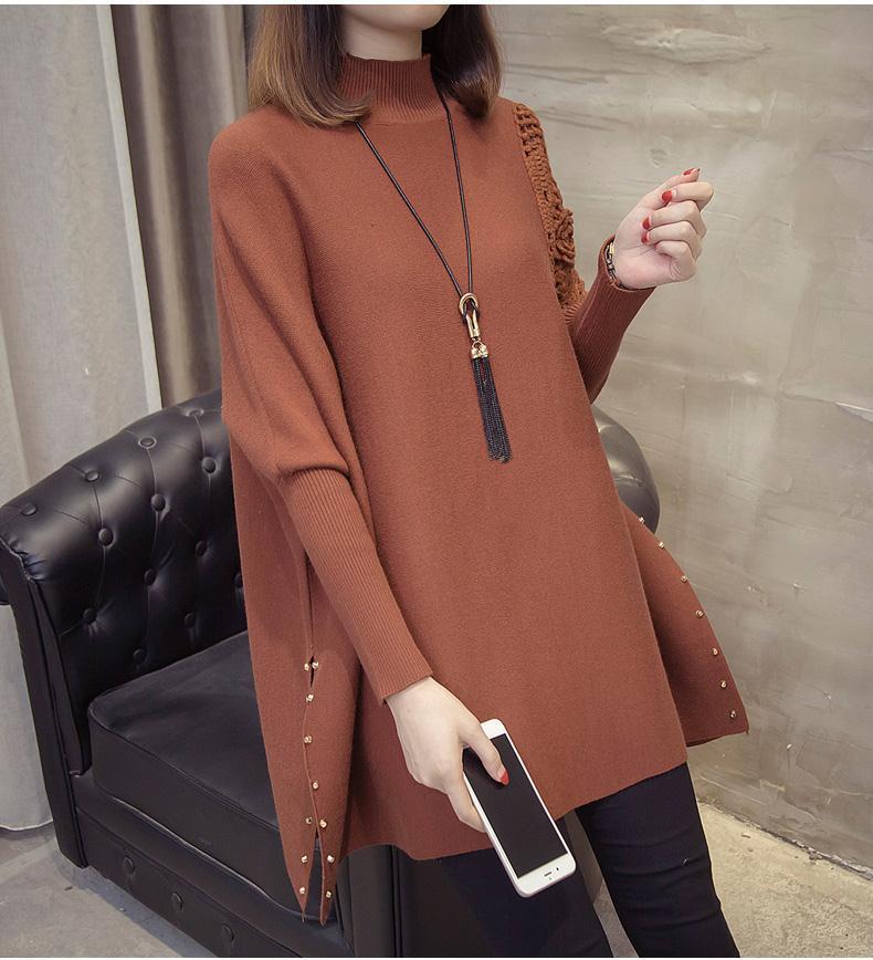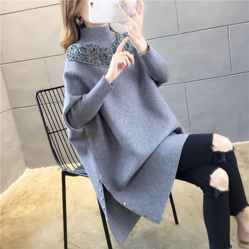 가을과 겨울 새로운 중간 길이 배트모빌 셔츠 반 터틀넥 스웨터 니트웨어 느슨한 플러스 사이즈 숄 판초 여성의 두꺼운 코트