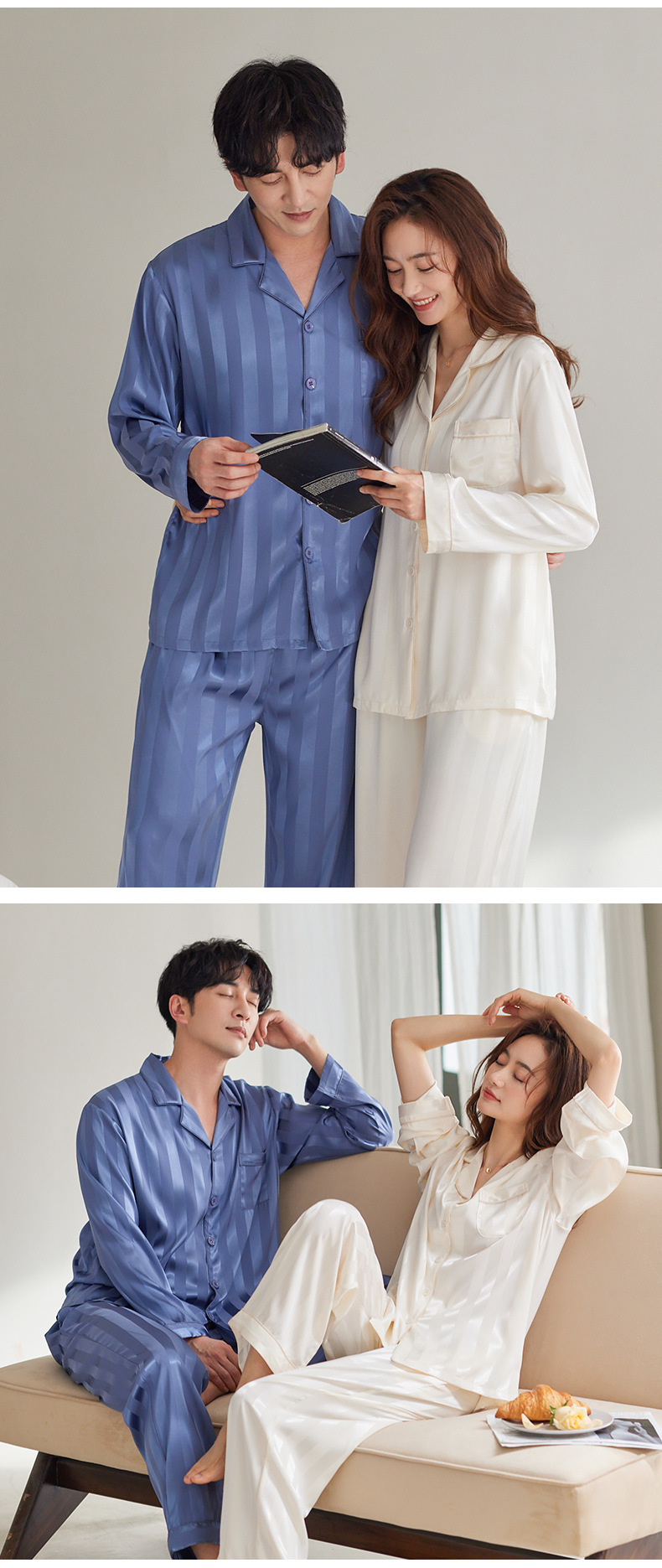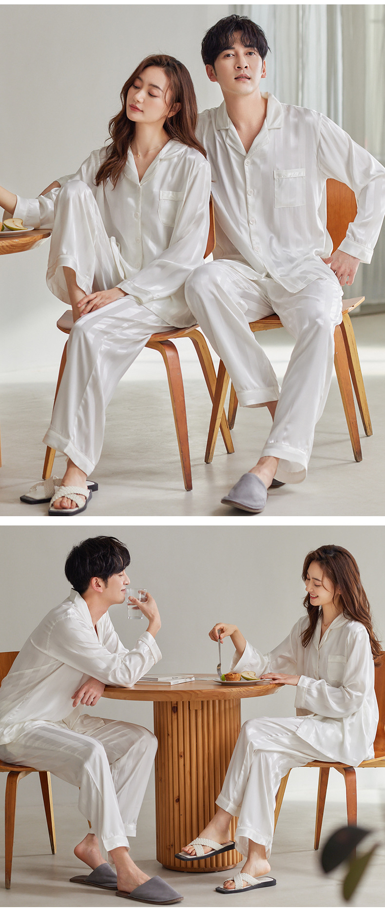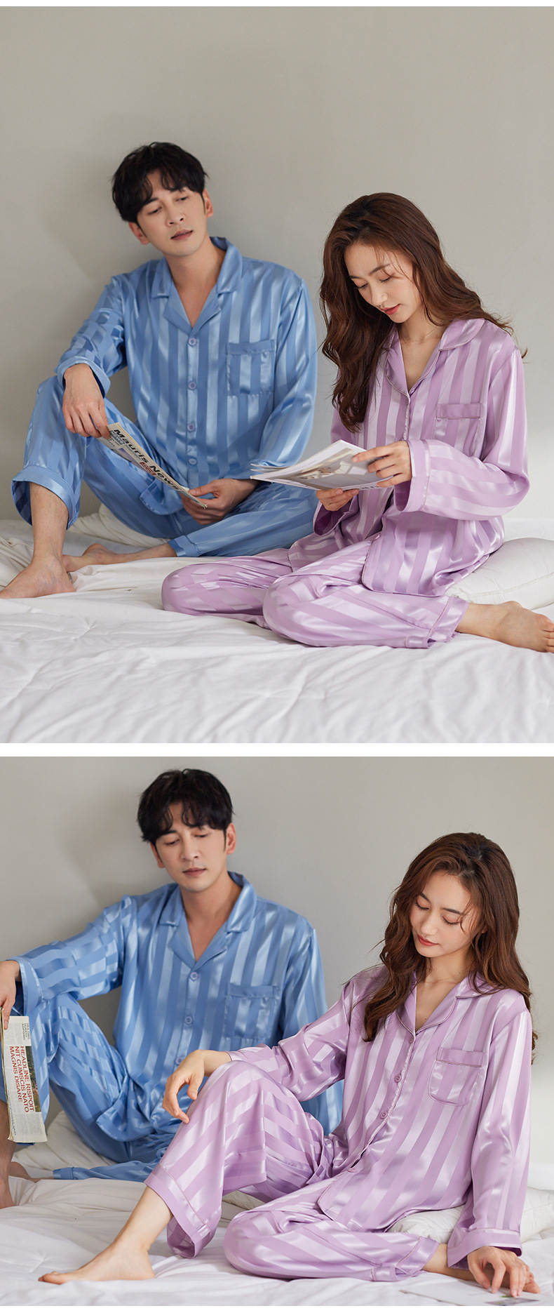 커플 아이스 실크 잠옷 남성과 여성의 고급 긴팔 봄과 가을 투피스 세트 여름 여성 모조 실크 가정복스토어 가기
