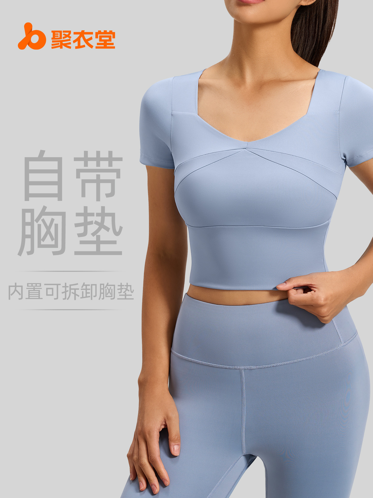 Juyitang 복숭아 스플 라이스 스포츠 반팔 여성용 가슴 패드 고탄성 슬림 러닝 요가 탑스토어 가기