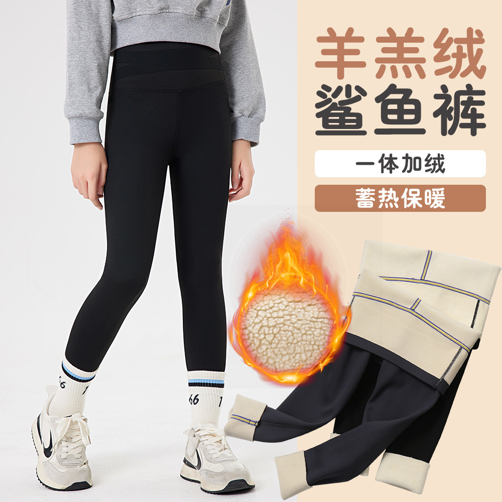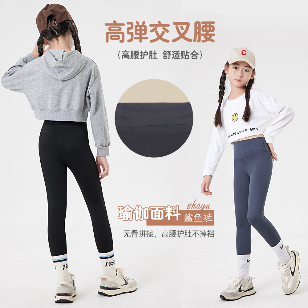 새로운 어린이 기모 따뜻한 상어 바지 교차 허리 떨어지지 않는 레깅스 대형 여아 겉옷 바지 요가 바지