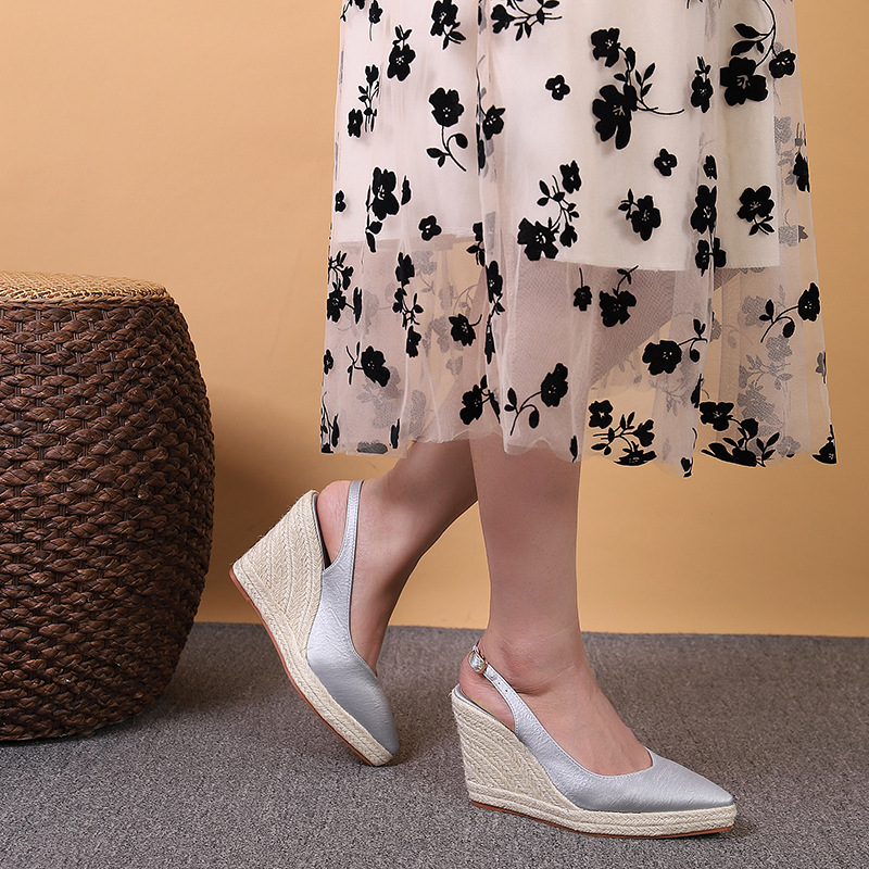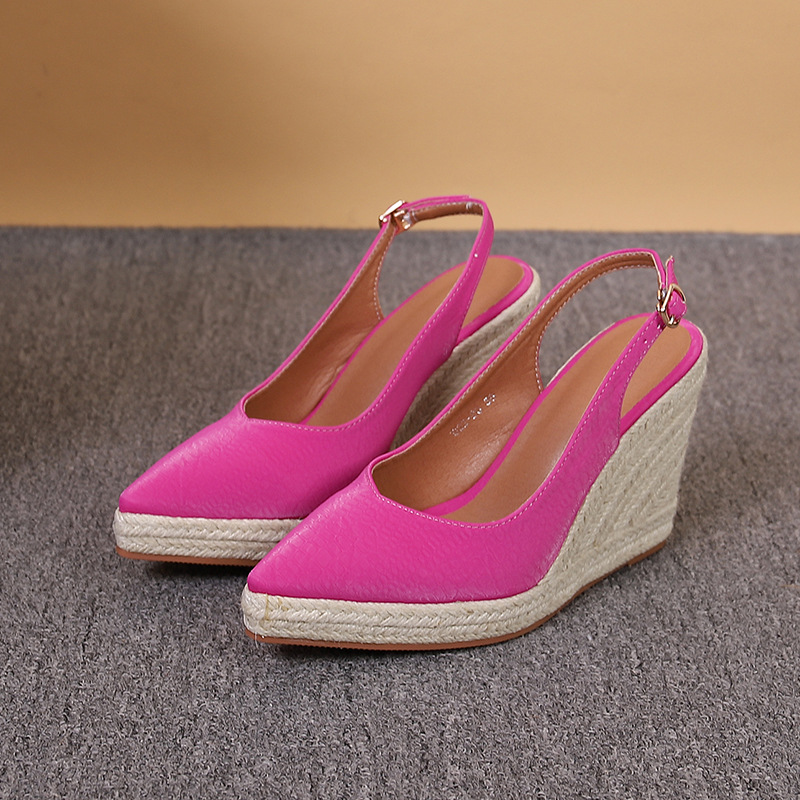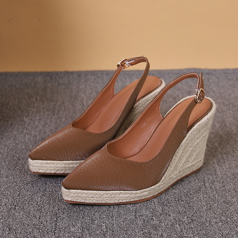 아마존 크로스 보더 웨지 두꺼운 밑창 하이힐 뾰족한 후면 빈 발가락 드래그 온 버클 샌들 여성용 밀짚 닦은 대마 로프 밑창 재고스토어 가기