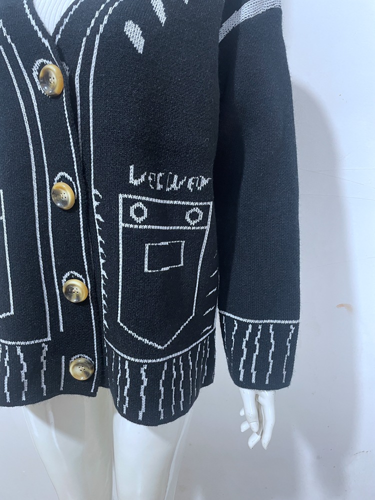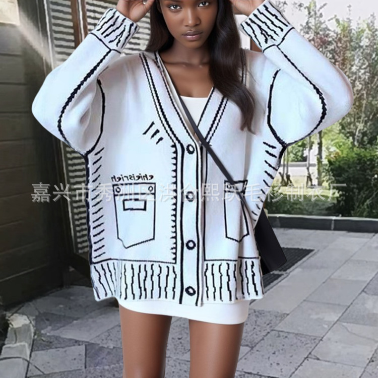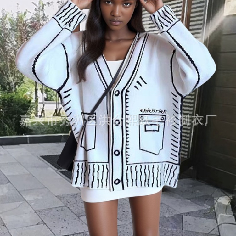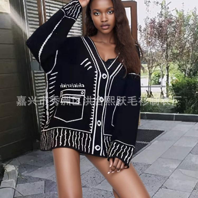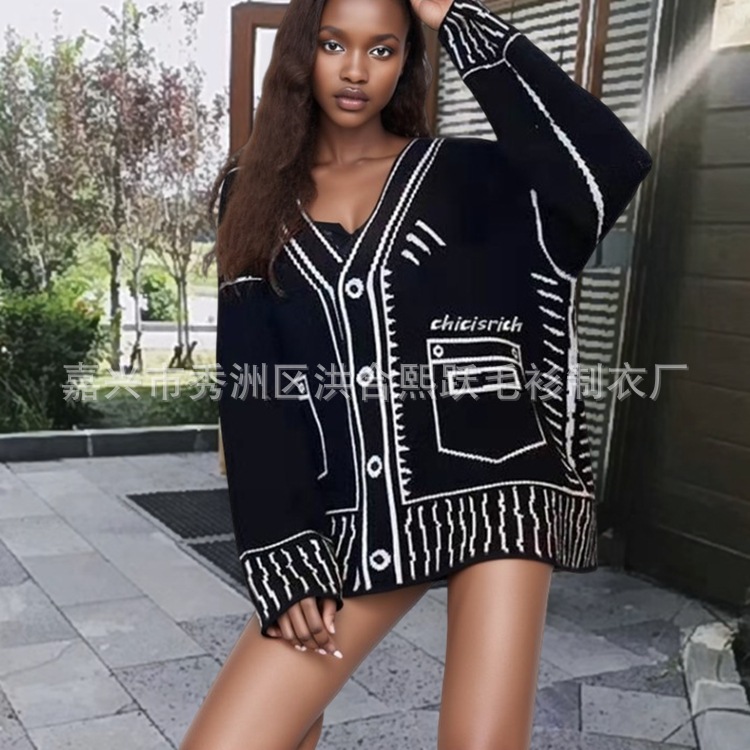 아마존 크로스 보더 새로운 유럽과 미국 코트 느슨한 색상 매칭 니트 버튼 카디건 해외 무역 장식 포켓 스웨터 여성스토어 가기