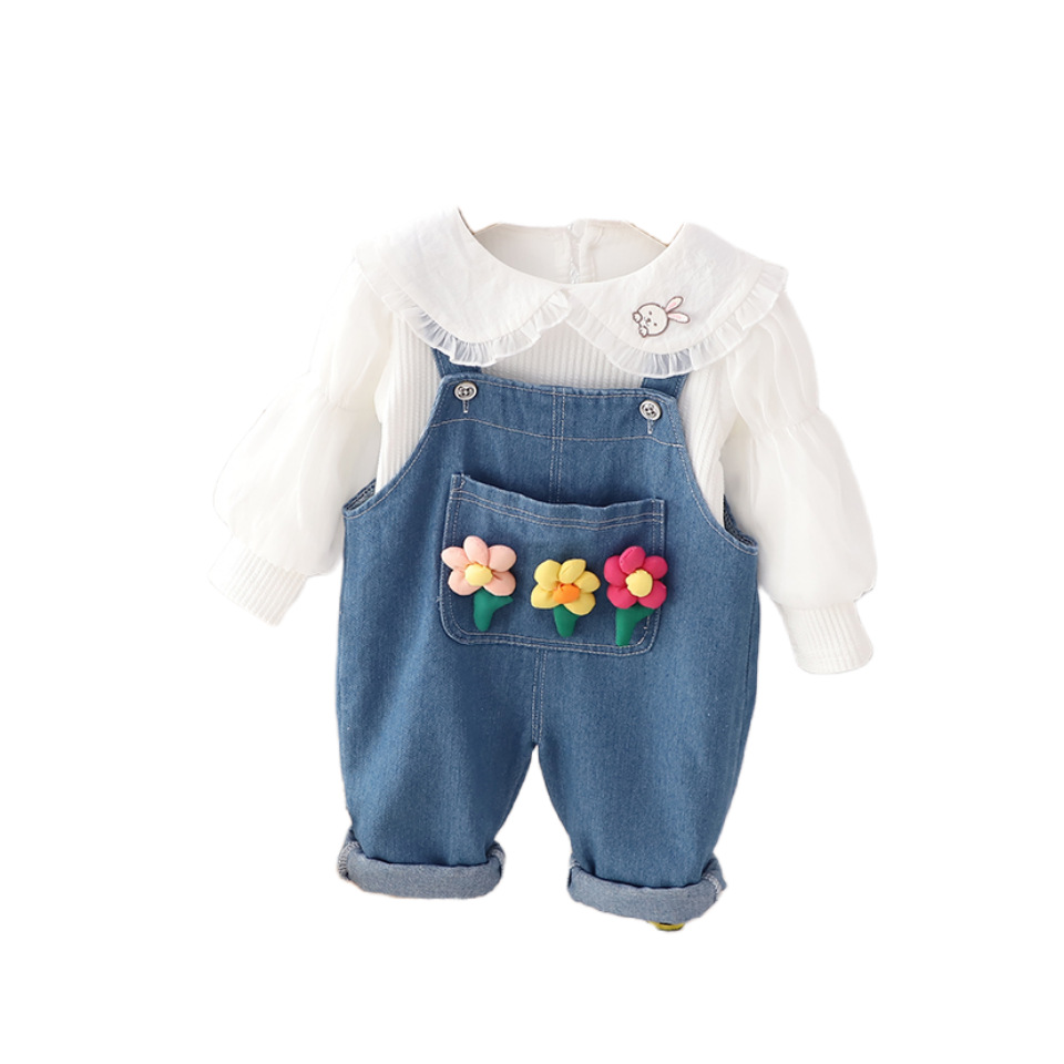 2024 가을 어린이 착용 카우보이 대형 옷깃 소녀의 귀여운 아기 스트랩 바지 긴 소매 봄 어린이 옷 2 조각 세트스토어 가기