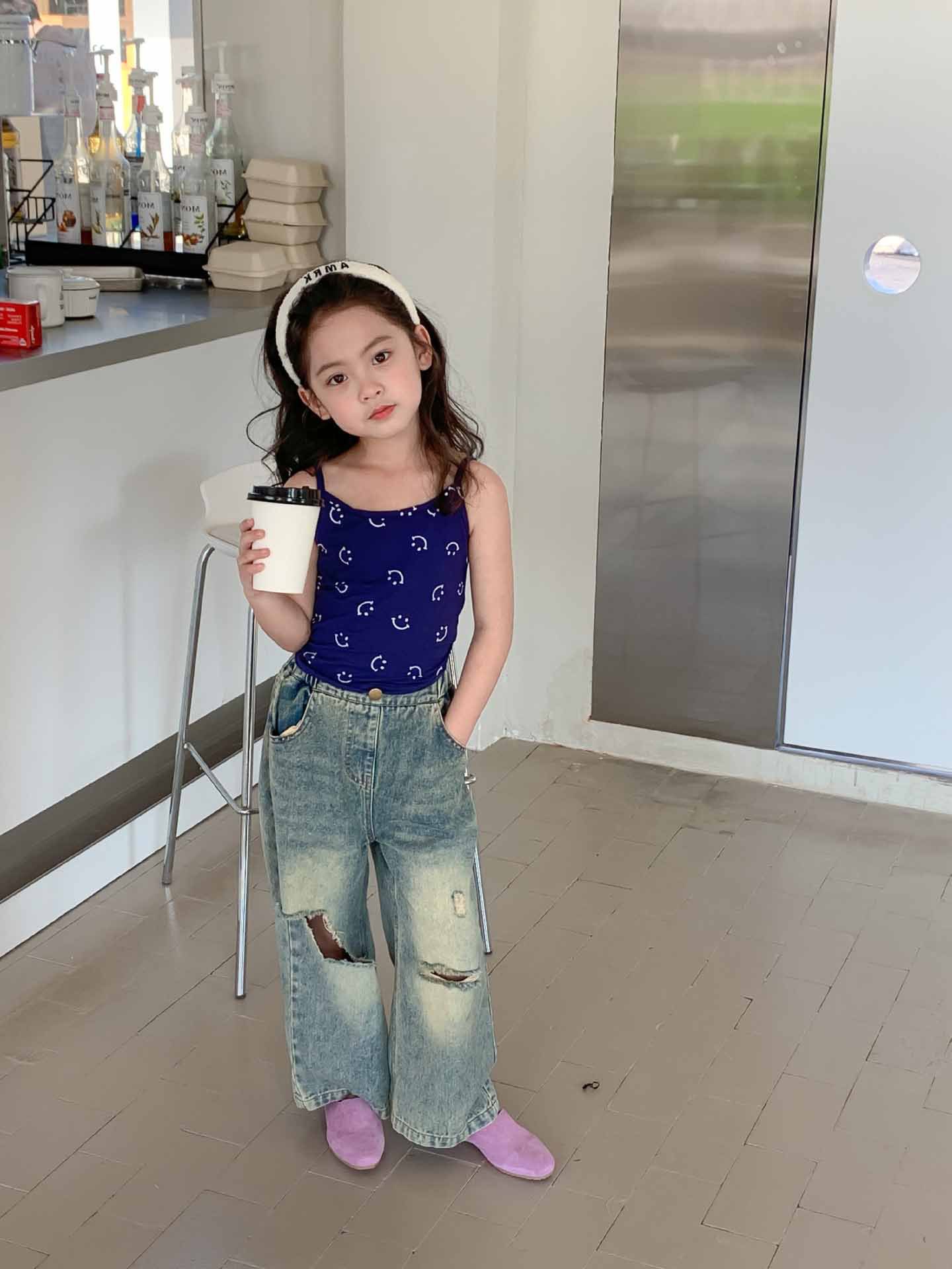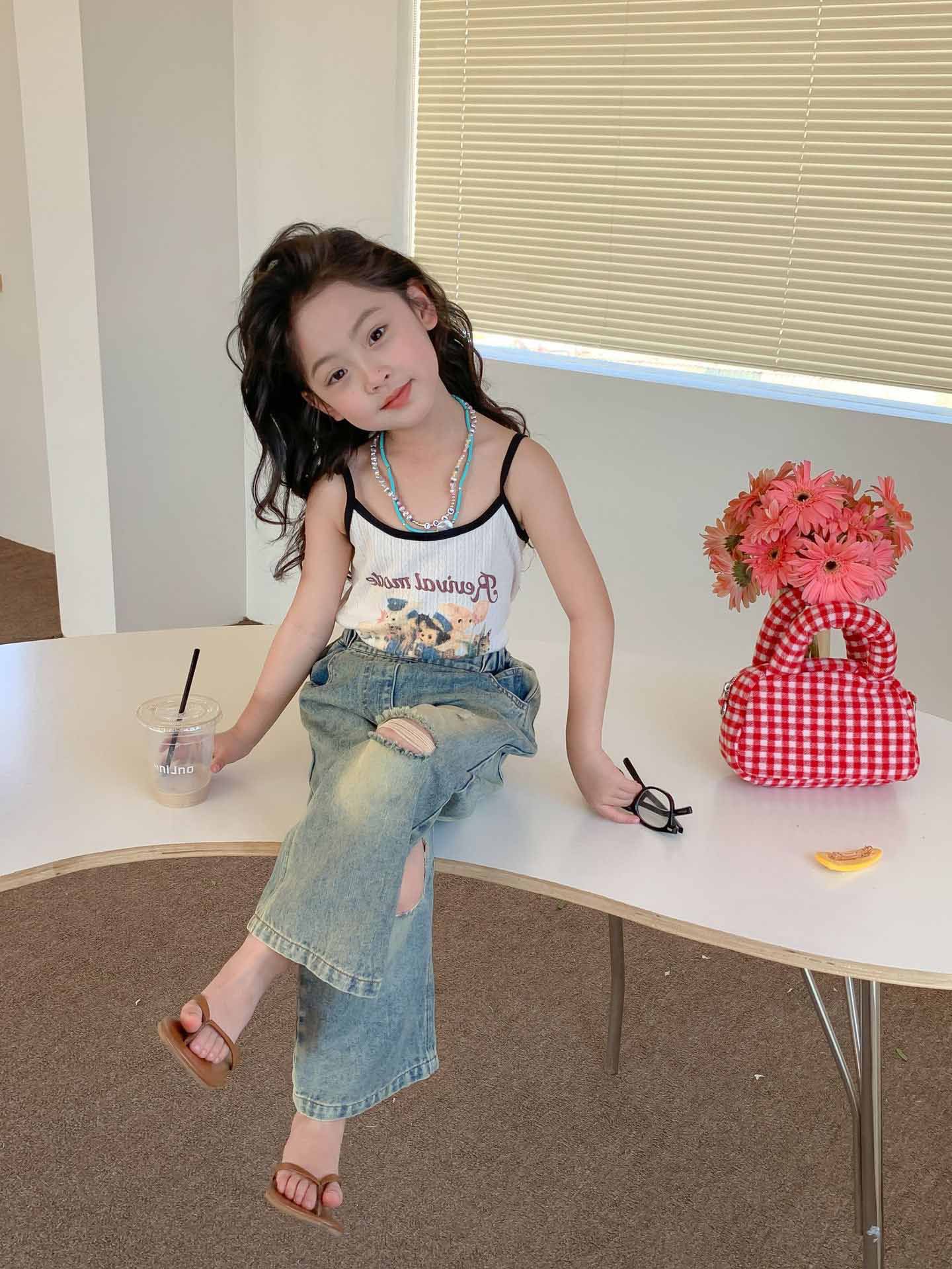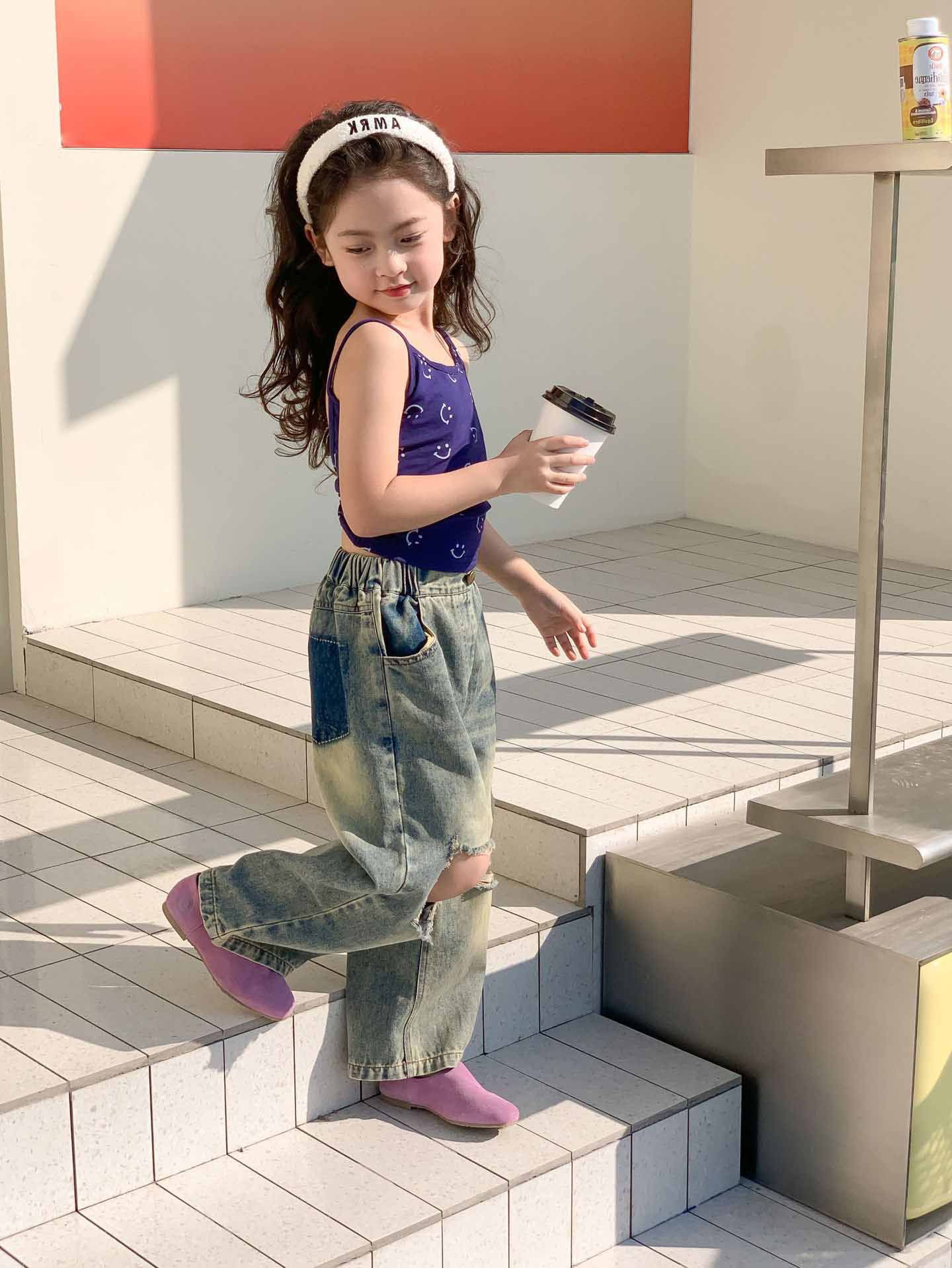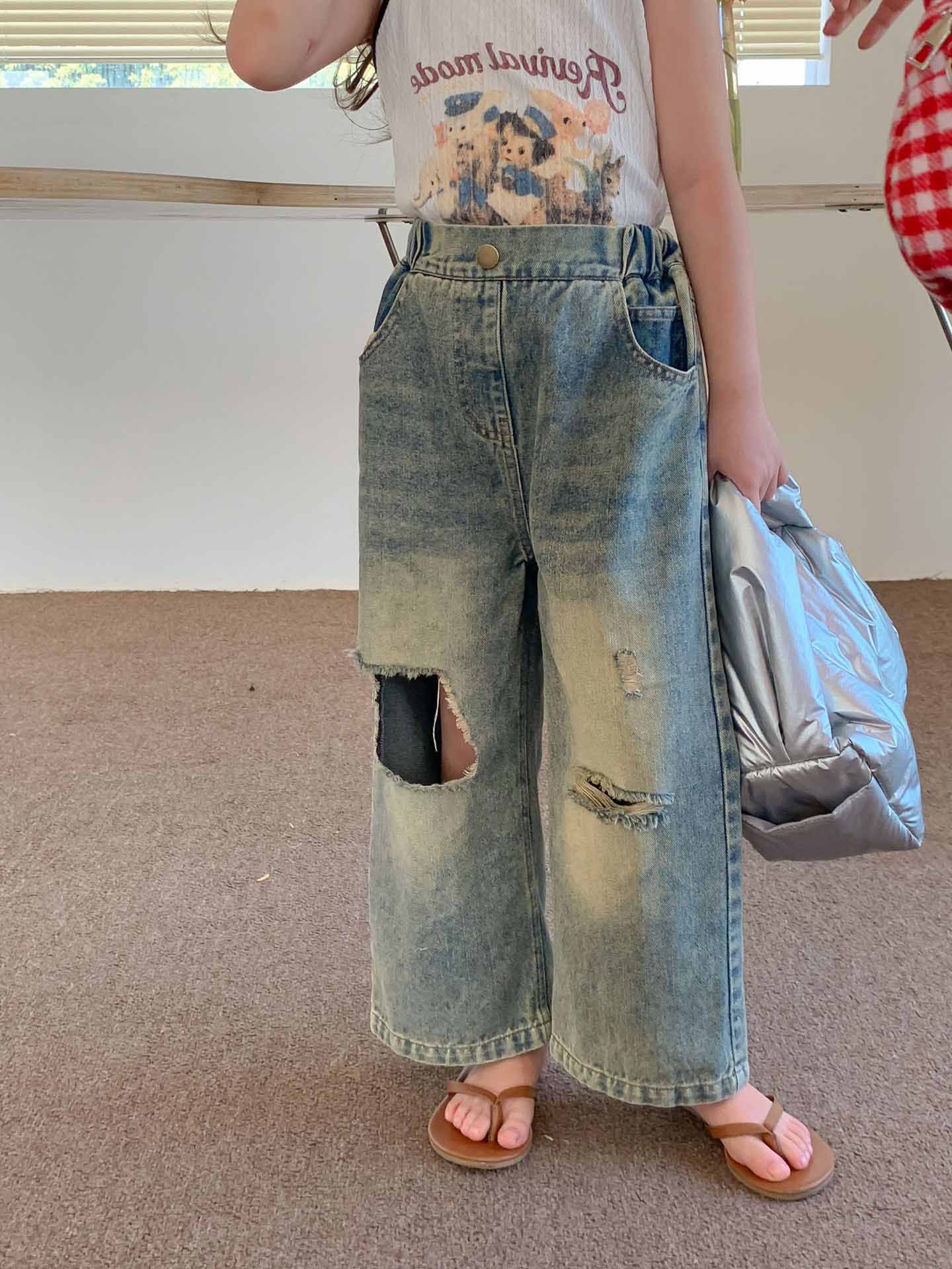 여자 찢어진 청바지 여름 새로운 어린이 성격 복고풍 스타일 넓은 다리 바지 어린이 세대의 머리카락스토어 가기
