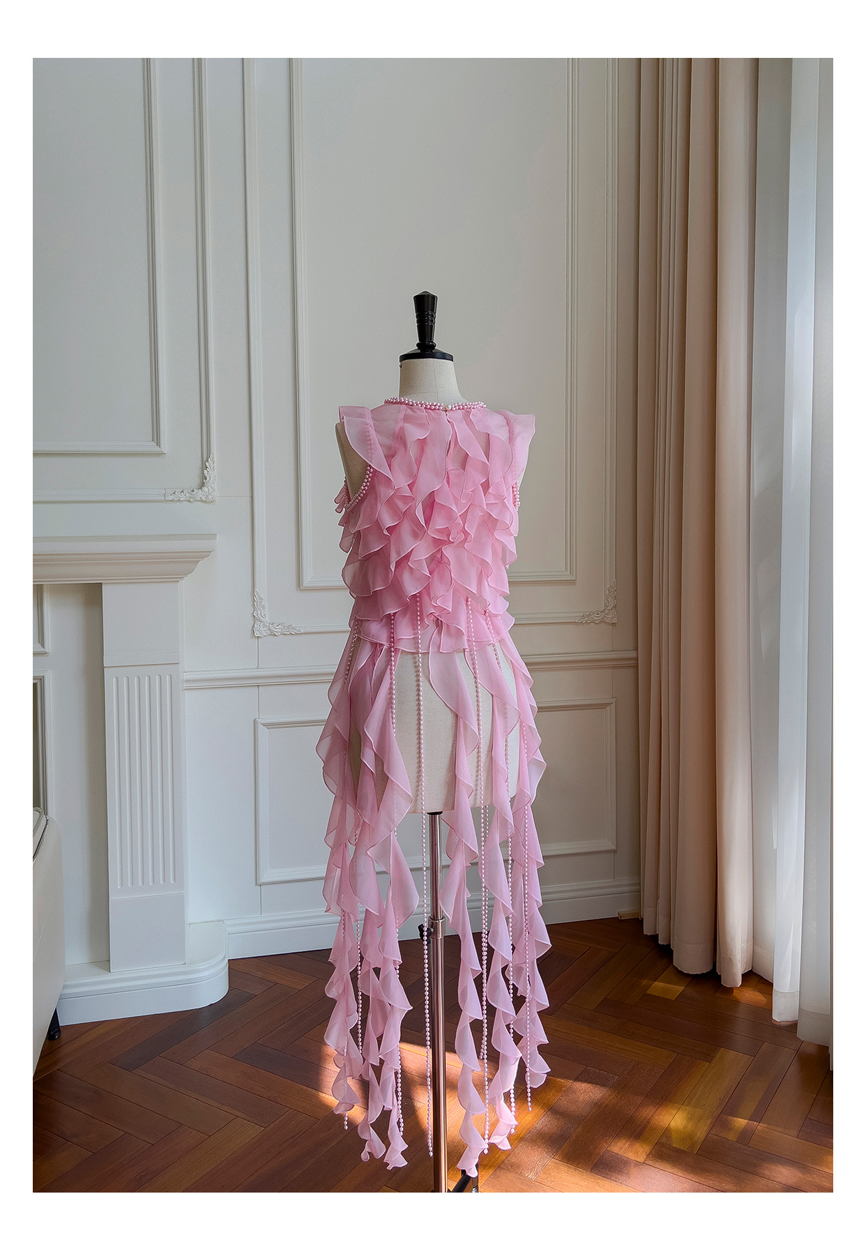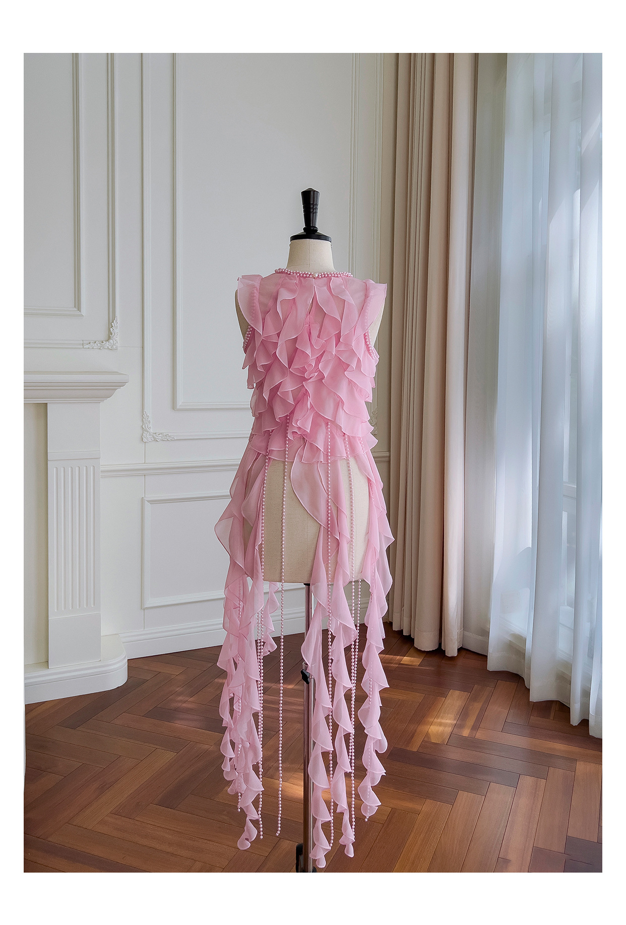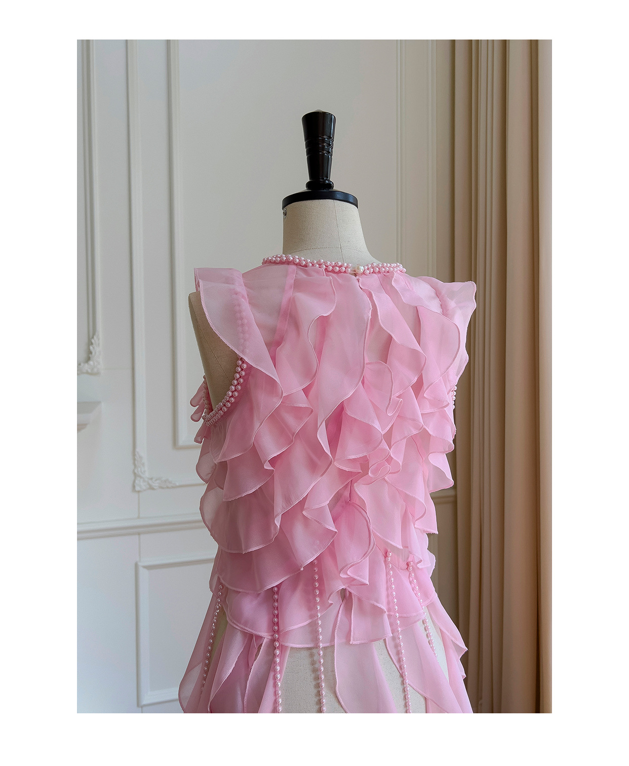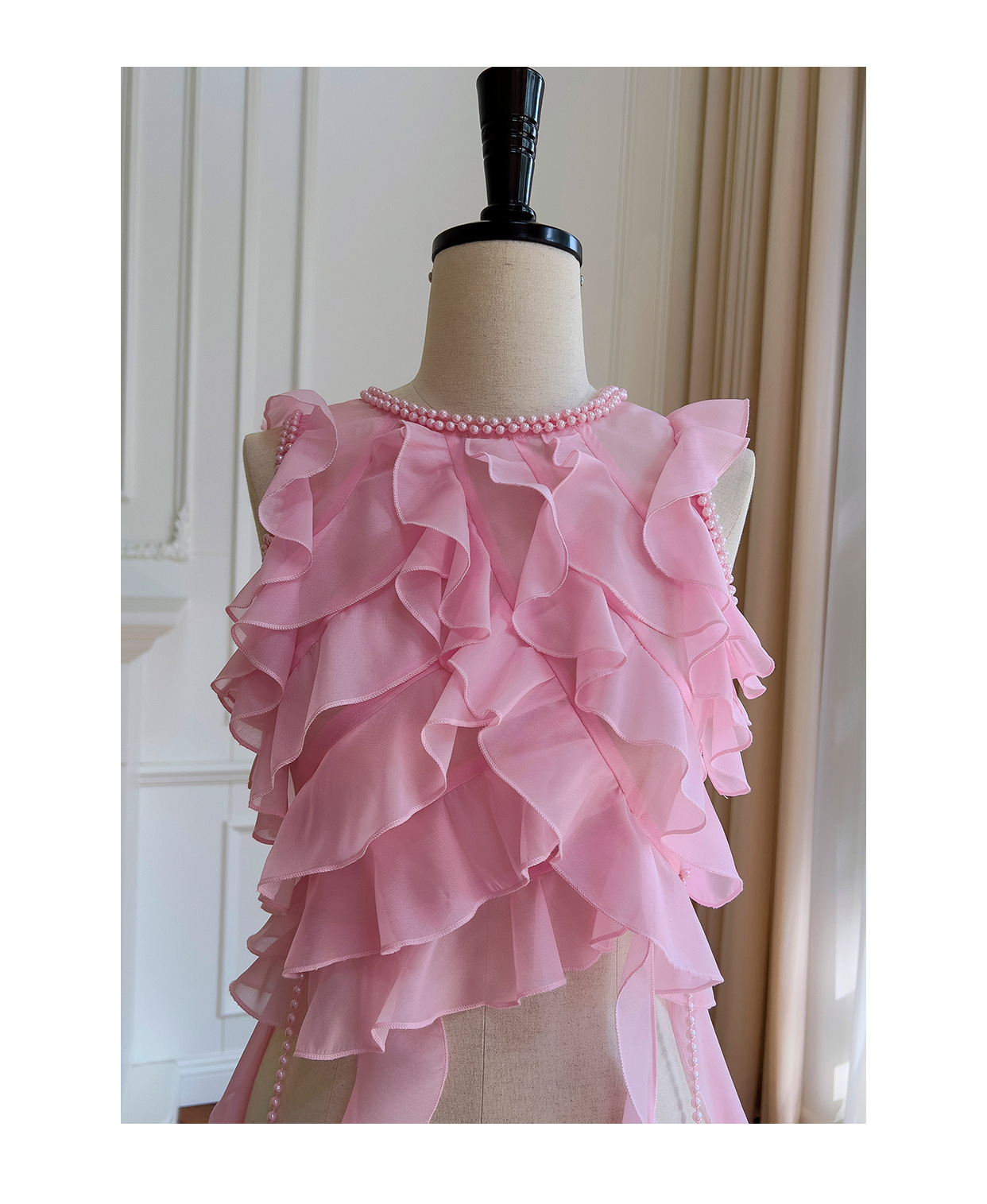 프랑스 달콤한 요정 핑크 진주 쉬폰 셔츠 프릴 불규칙한 술 민소매 셔츠 탑 71328스토어 가기