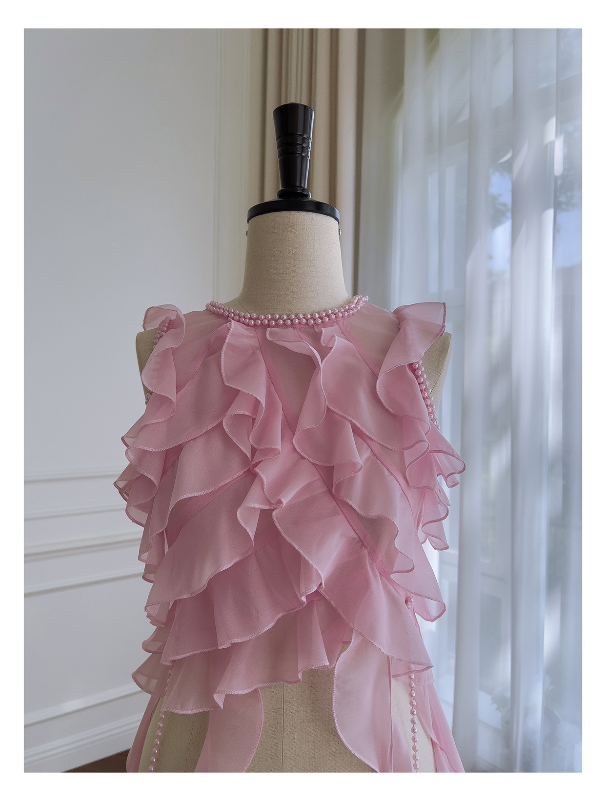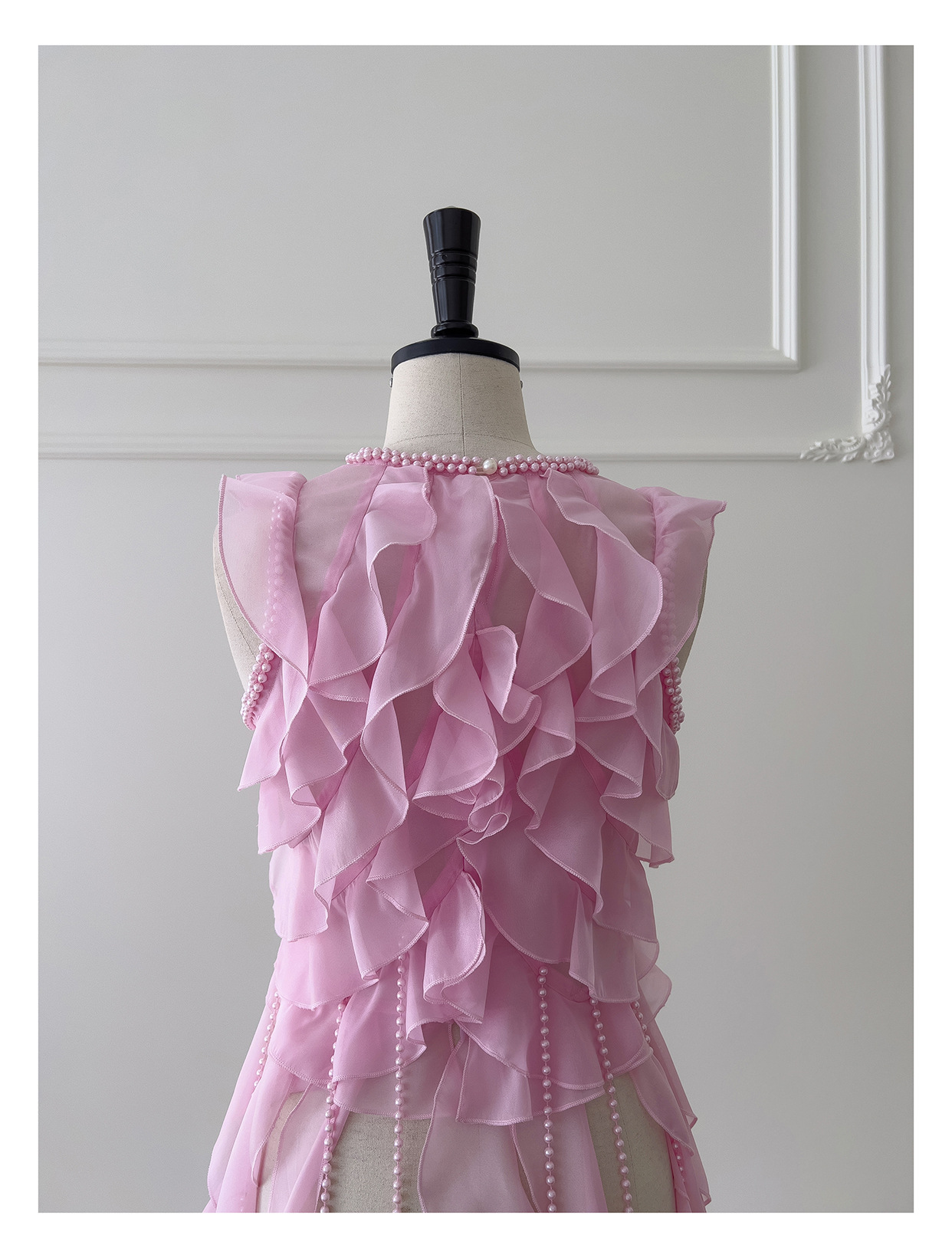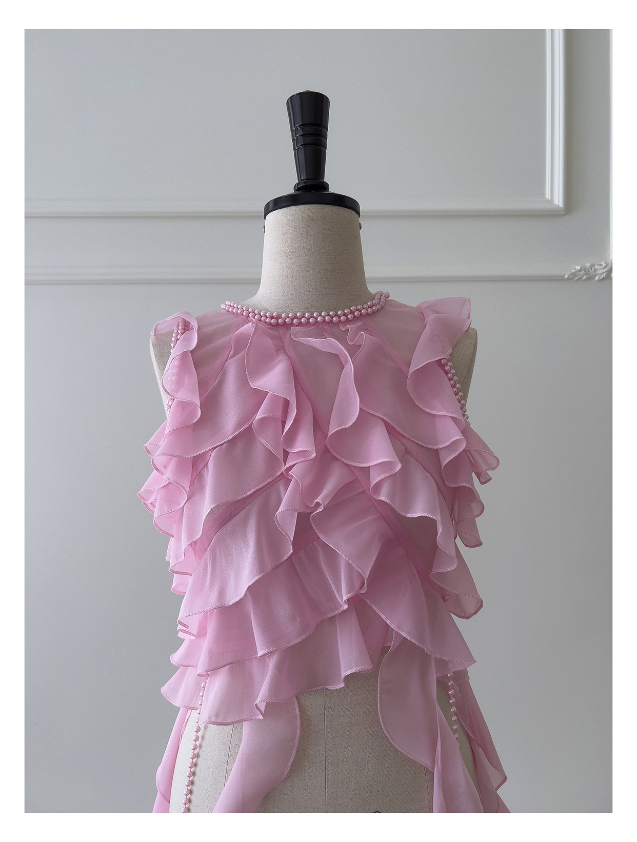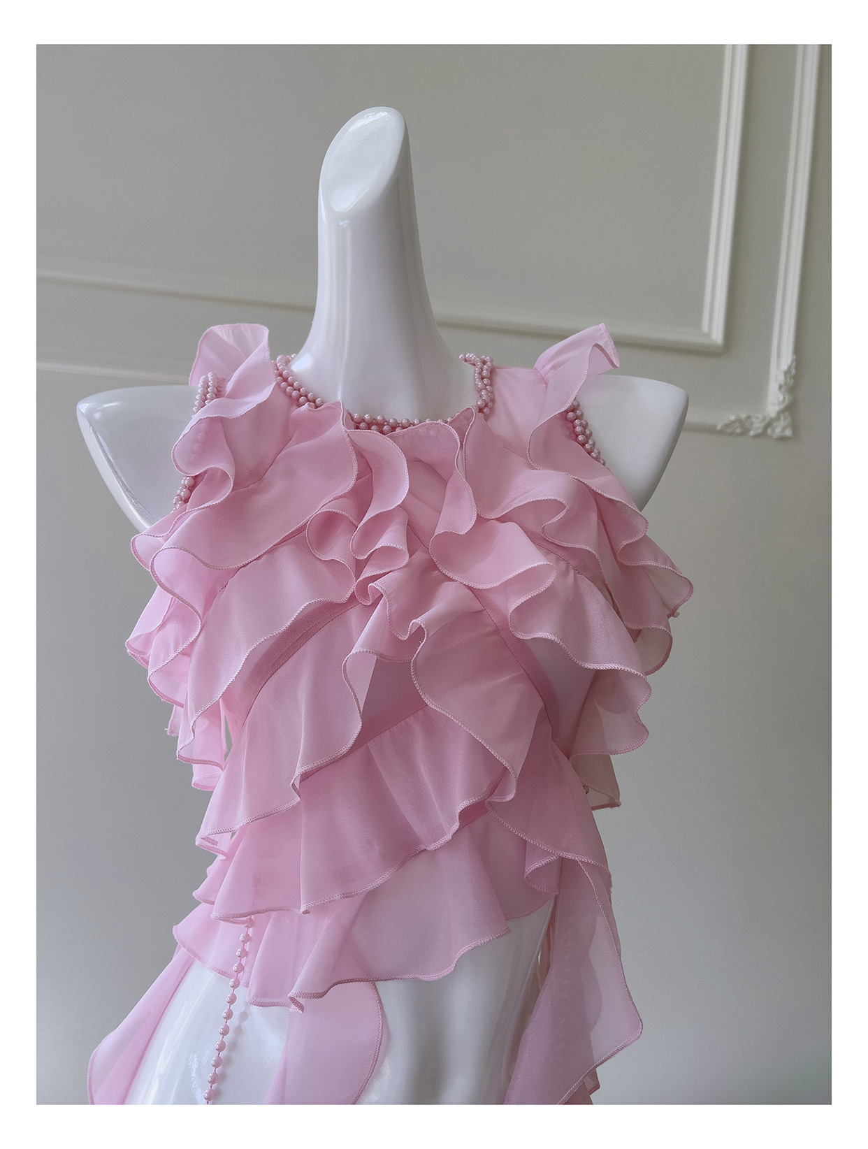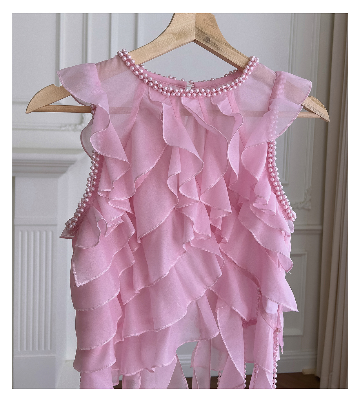프랑스 달콤한 요정 핑크 진주 쉬폰 셔츠 프릴 불규칙한 술 민소매 셔츠 탑 71328