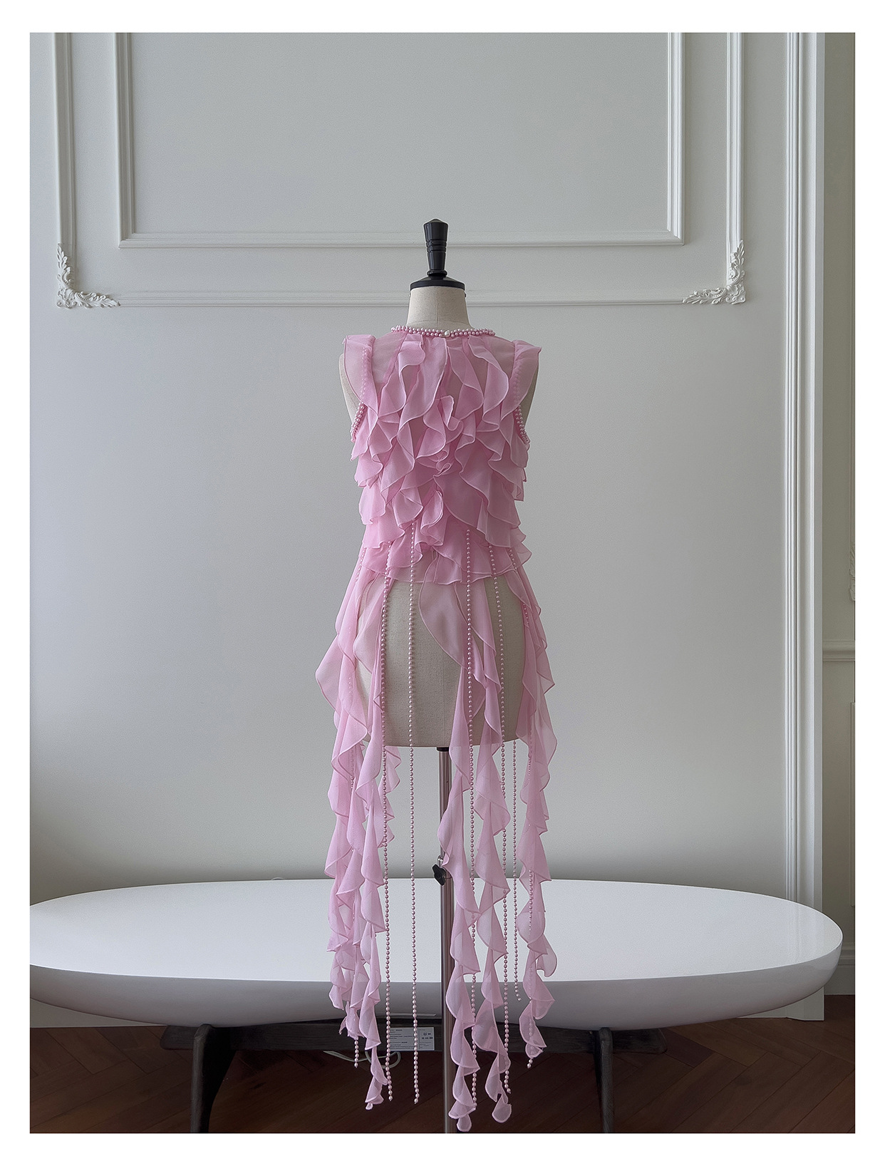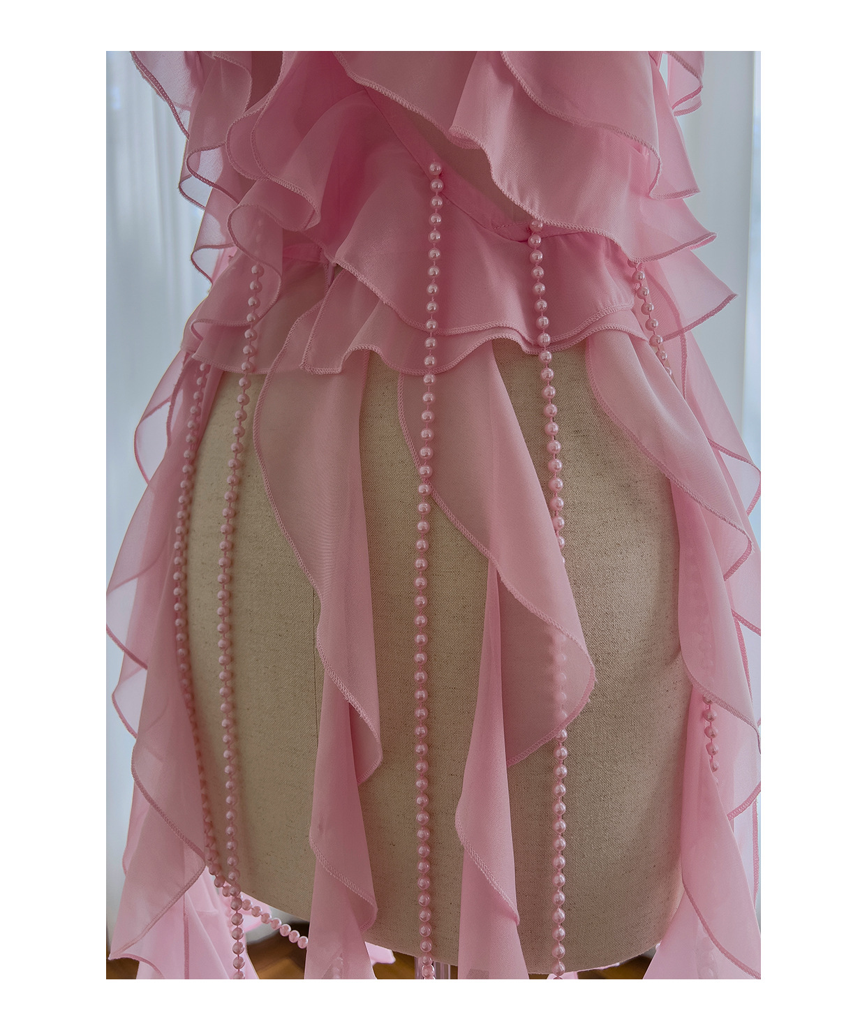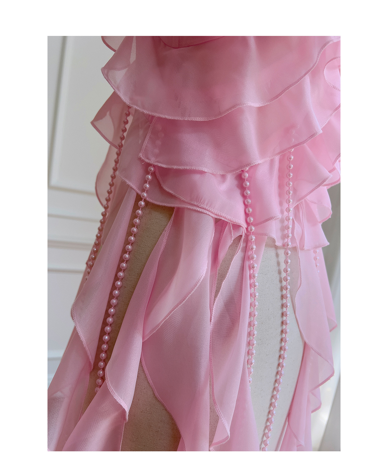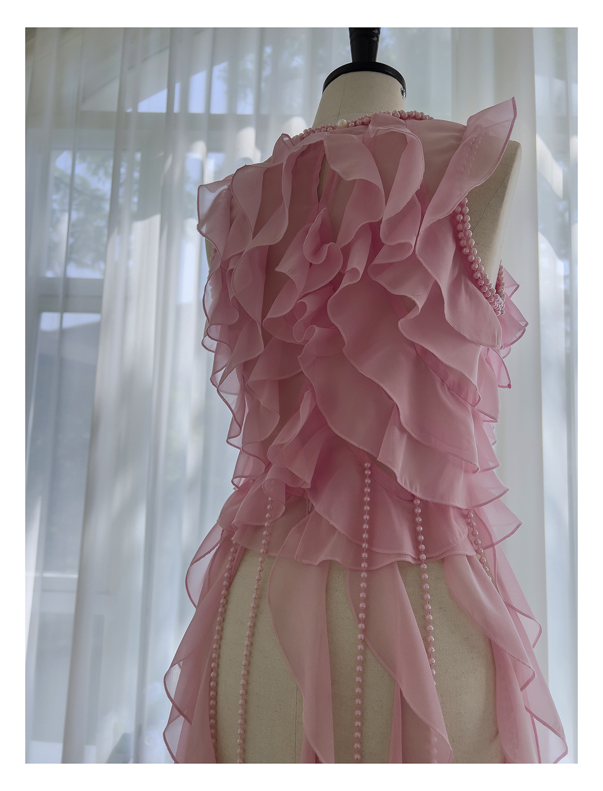 프랑스 달콤한 요정 핑크 진주 쉬폰 셔츠 프릴 불규칙한 술 민소매 셔츠 탑 71328