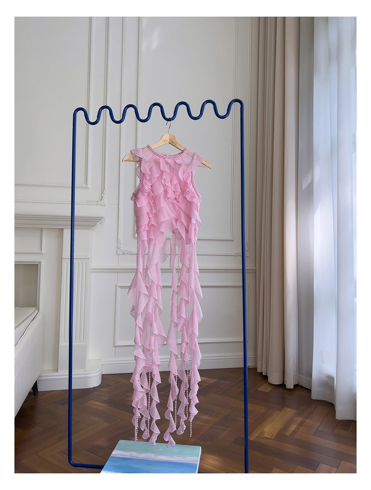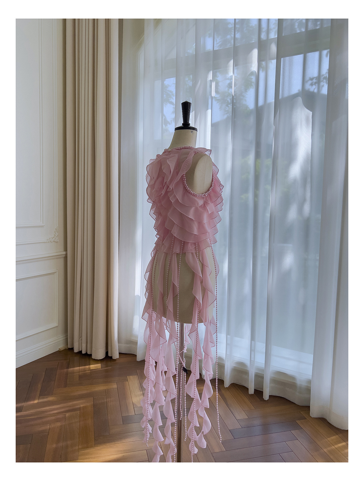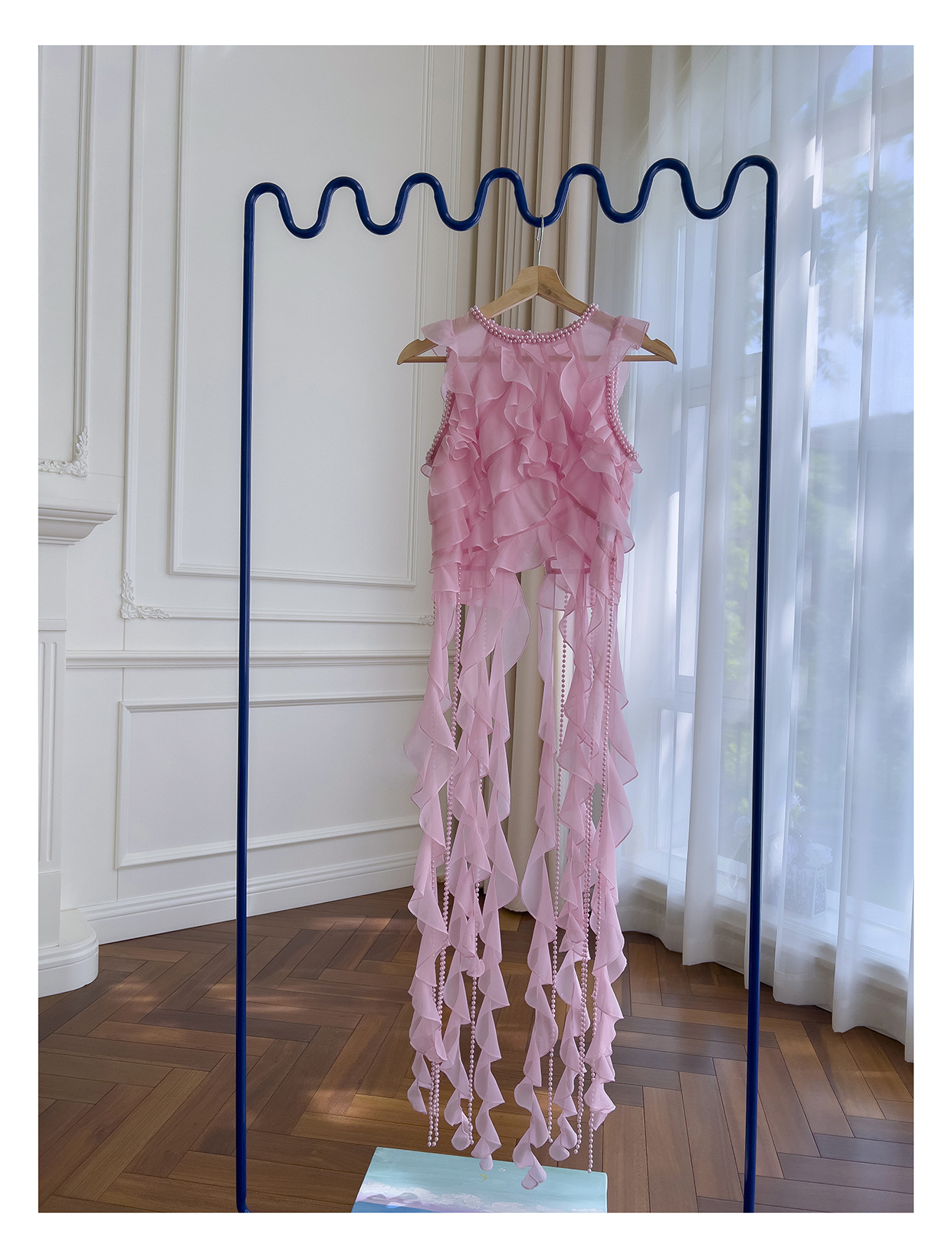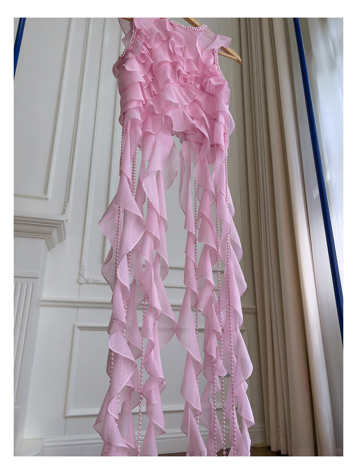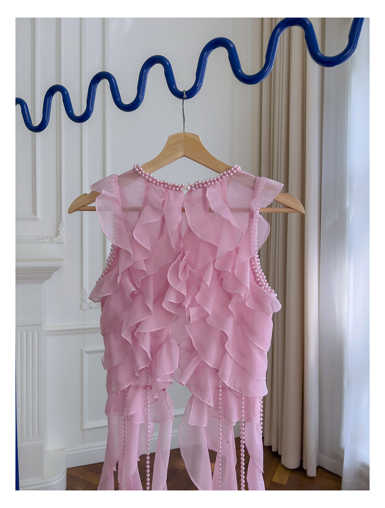 프랑스 달콤한 요정 핑크 진주 쉬폰 셔츠 프릴 불규칙한 술 민소매 셔츠 탑 71328