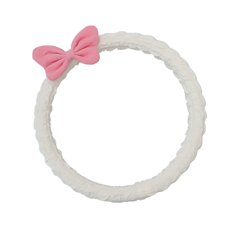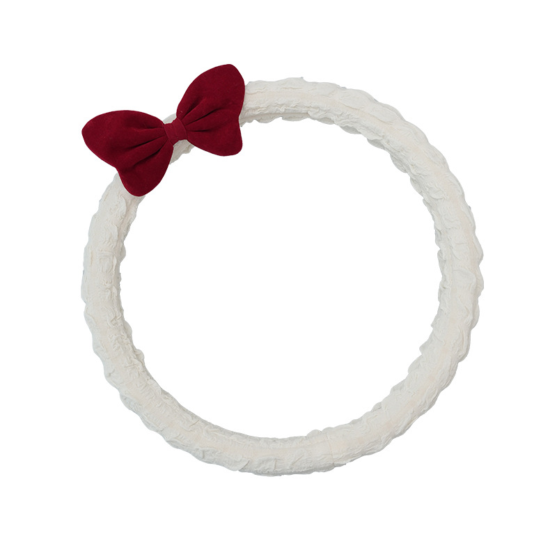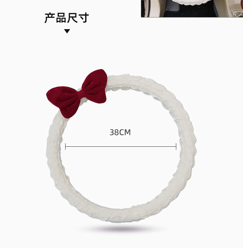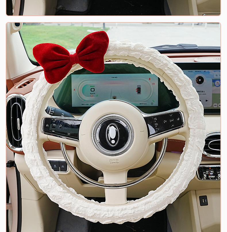 • 빨간 벨벳 활과 퍼프 베이지 스티어링 휠 커버