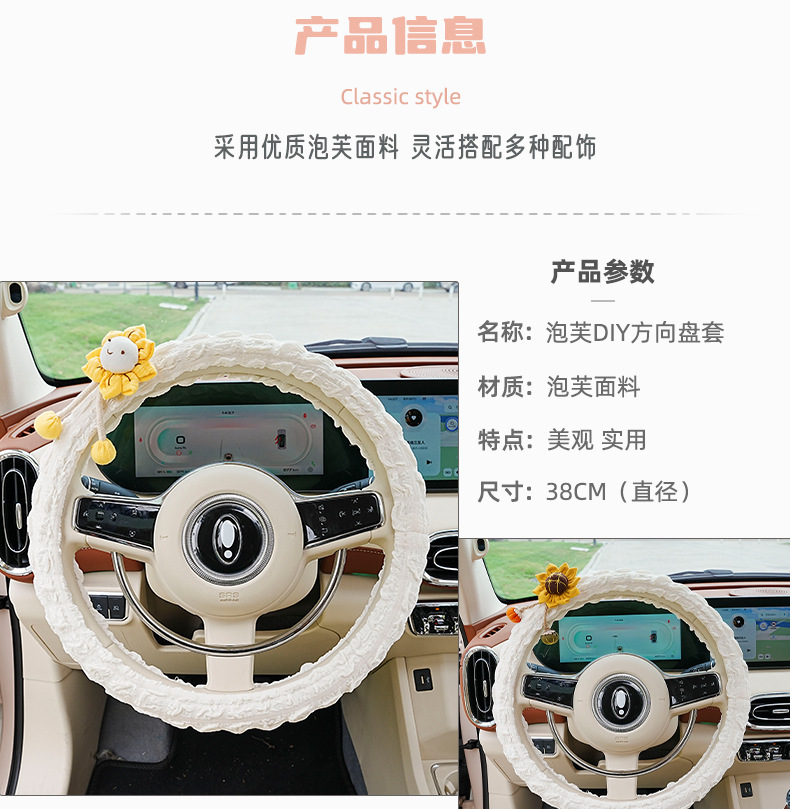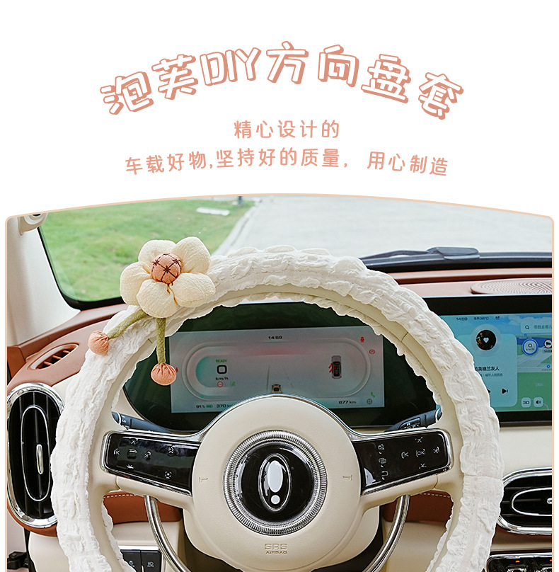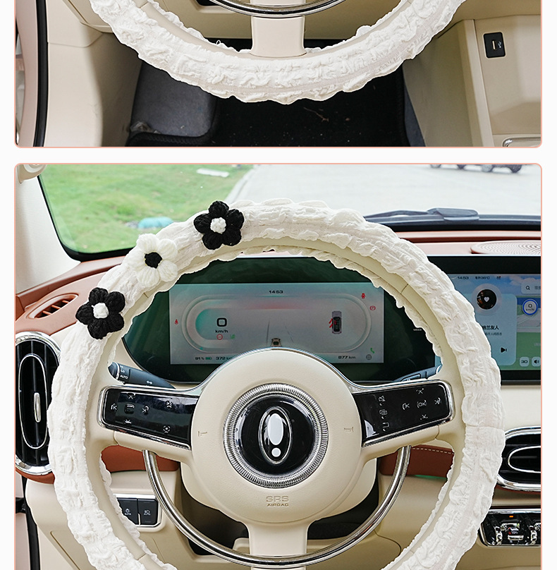 • 퍼프 지 베이지 스티어링 휠 커버 스티커 퍼프 플라워 미카