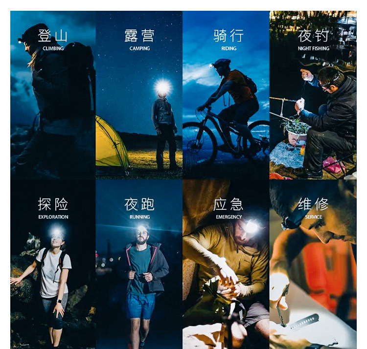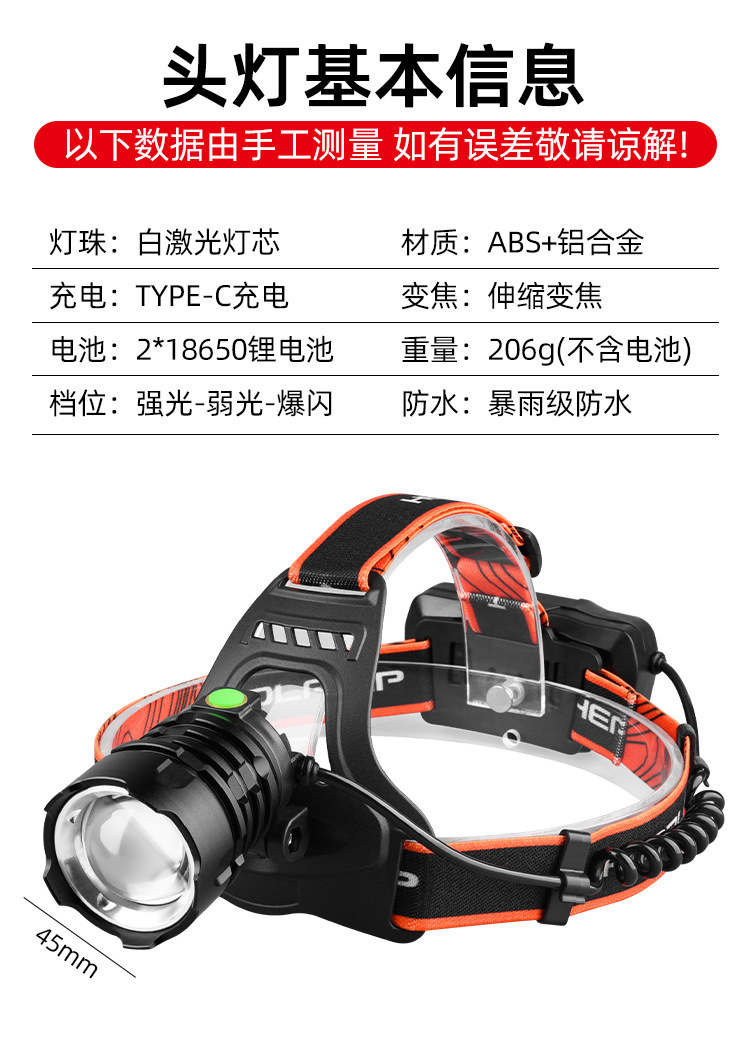• 유도 백색 레이저 헤드 라이트 없음 (18650 배터리 2 개) + Type-c 데이터 케이블 + 컬러 박스
