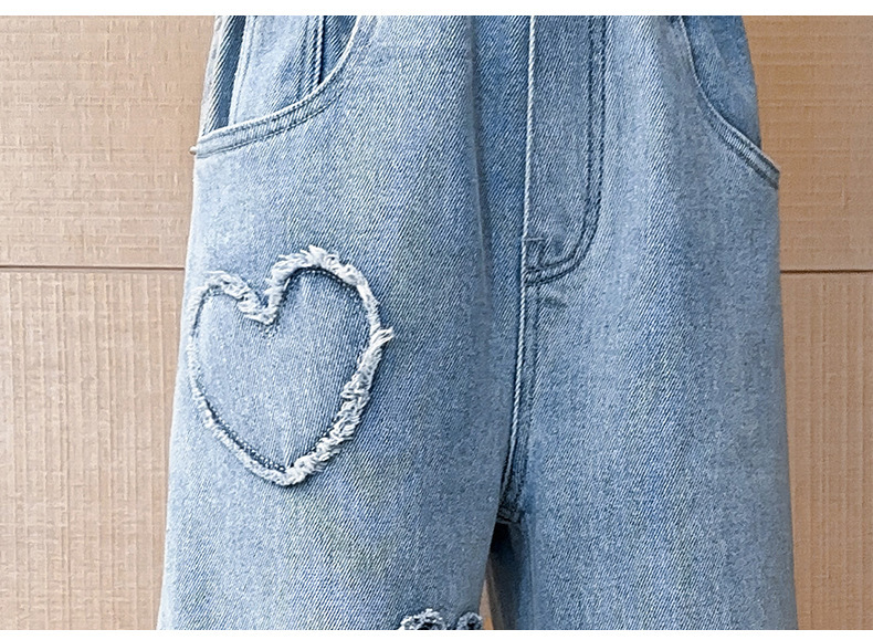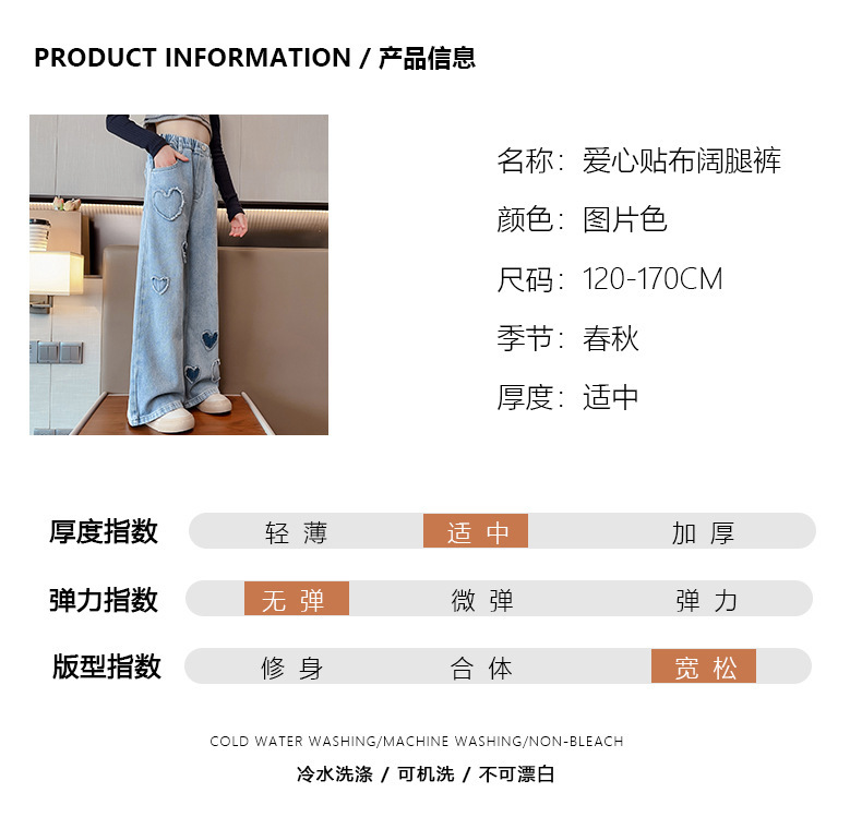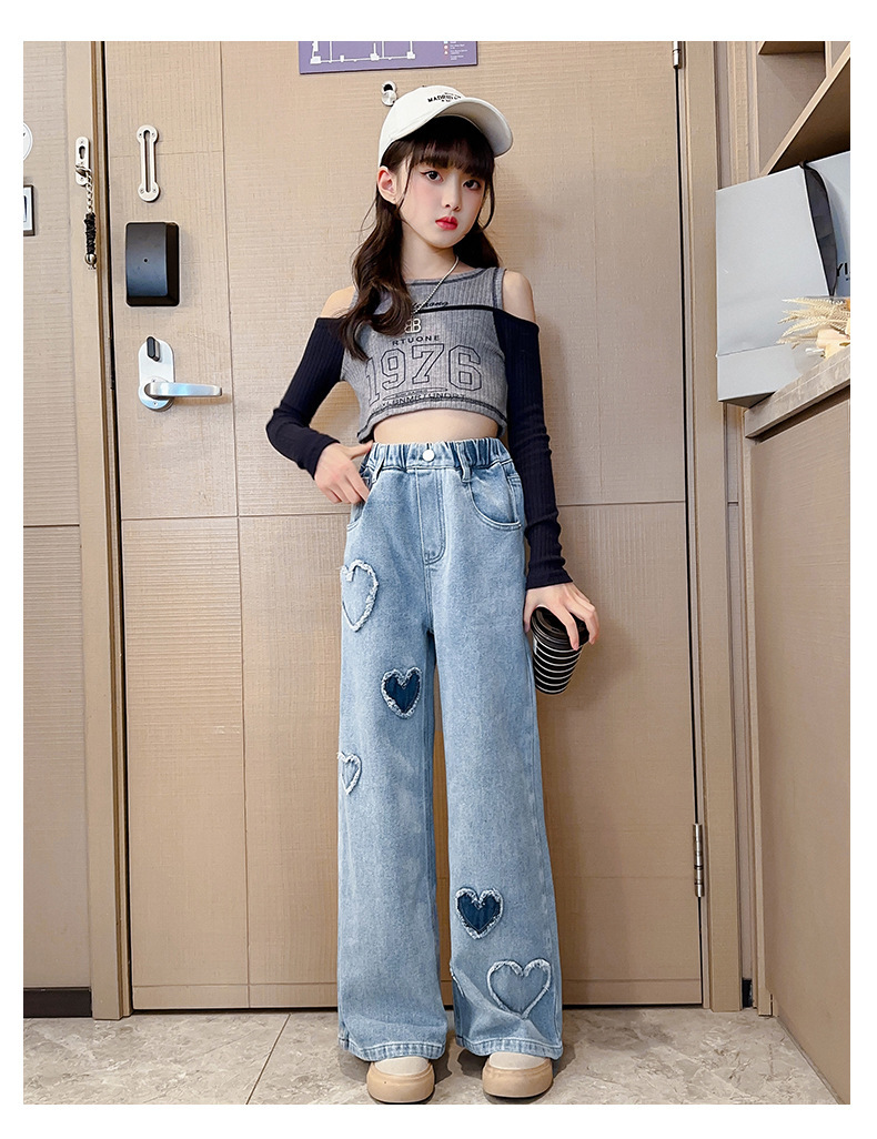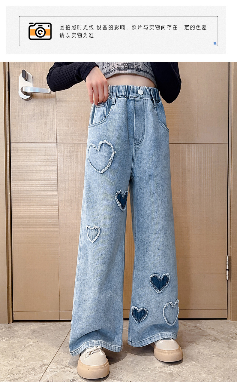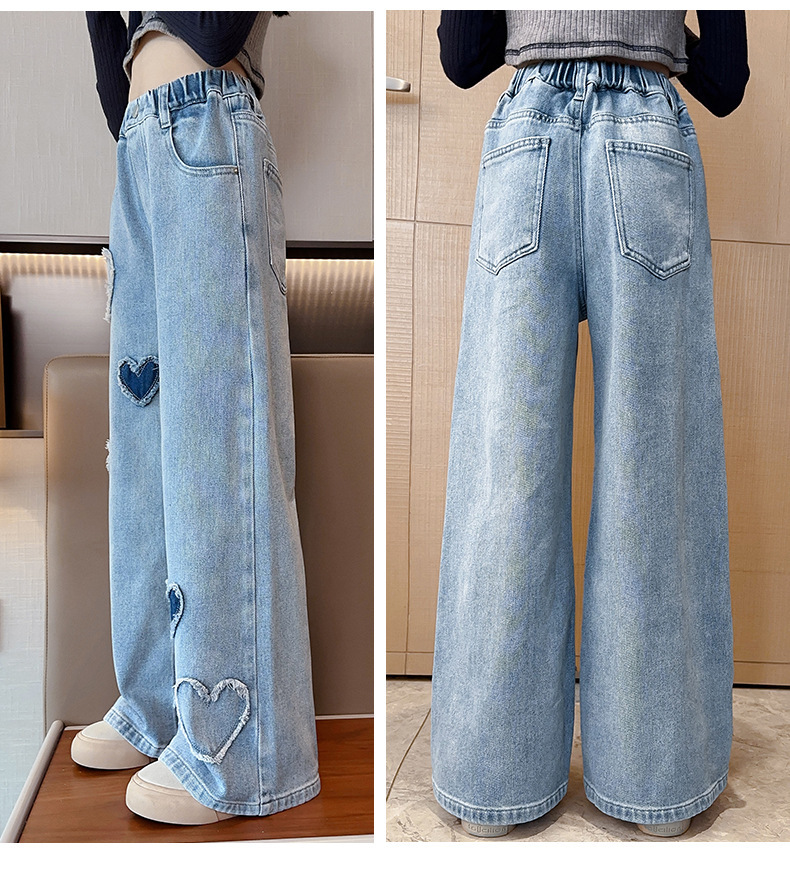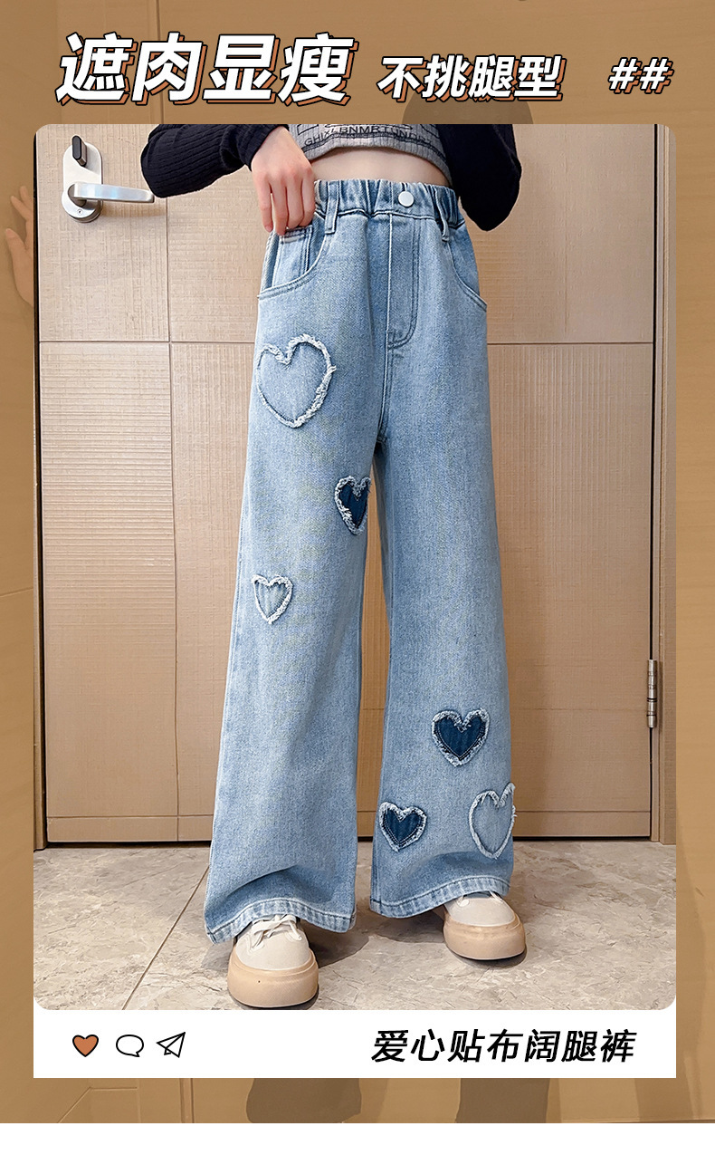 2025년 봄 가을 신상 여아 데님 팬츠, 중대형 아동용, 사랑스러운 하트 디자인의 와이드 팬츠, 루즈핏 롱 팬츠, 트렌디한 도매스토어 가기