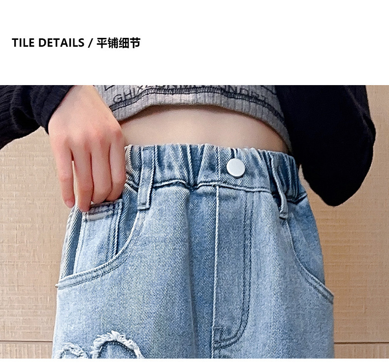 2025년 봄 가을 신상 여아 데님 팬츠, 중대형 아동용, 사랑스러운 하트 디자인의 와이드 팬츠, 루즈핏 롱 팬츠, 트렌디한 도매