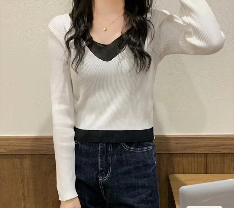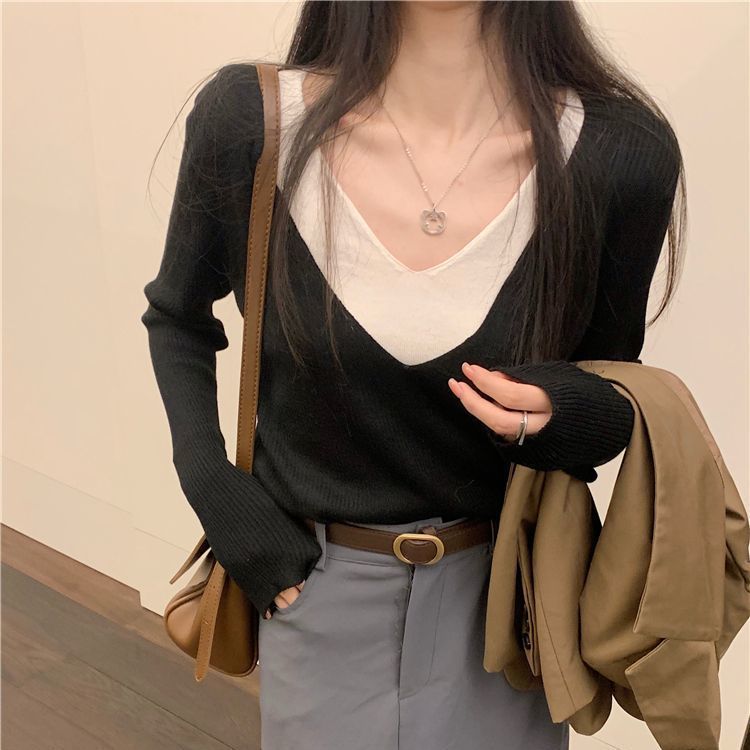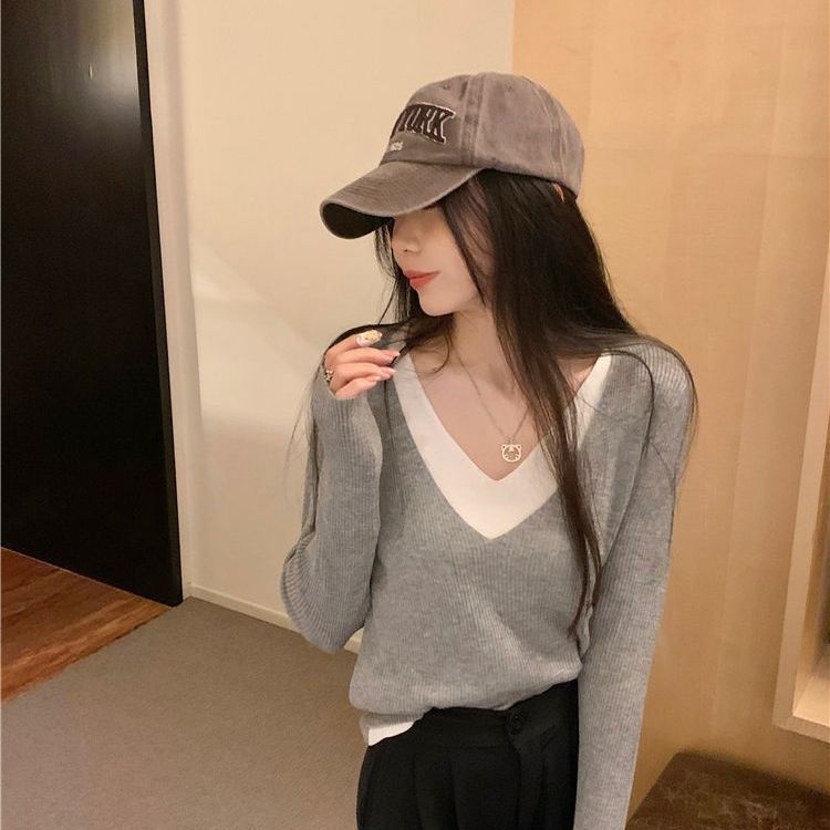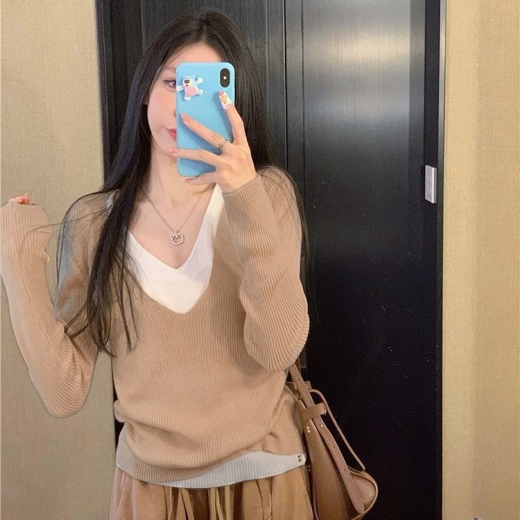 가짜 투피스 스타일 긴팔 니트 여성 가을 2025 신상 부드러운 스타일 브이넥 디자인 슬림핏 탑
