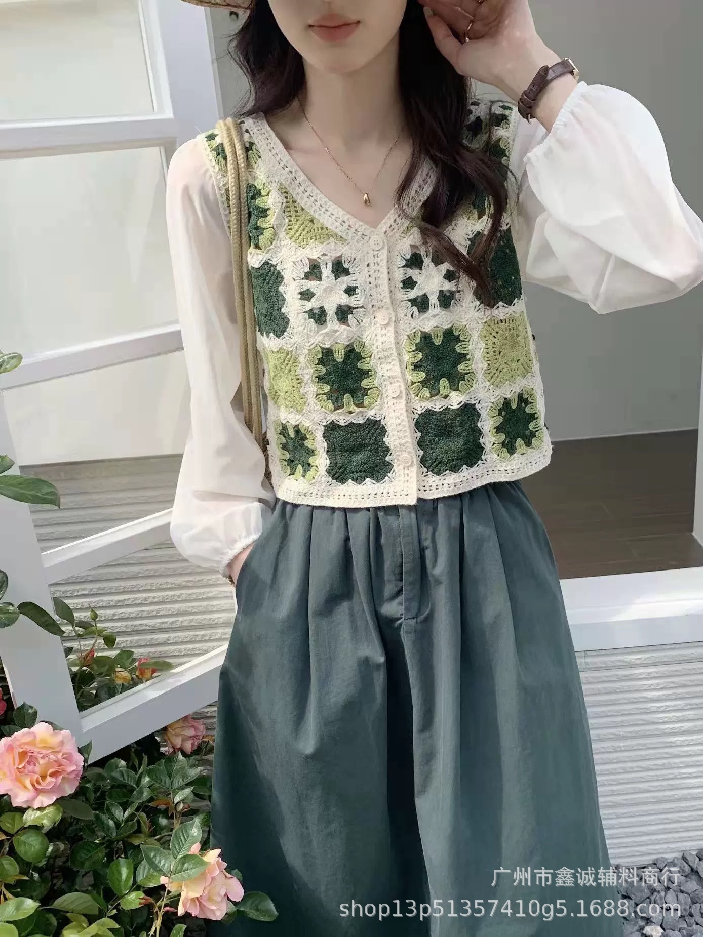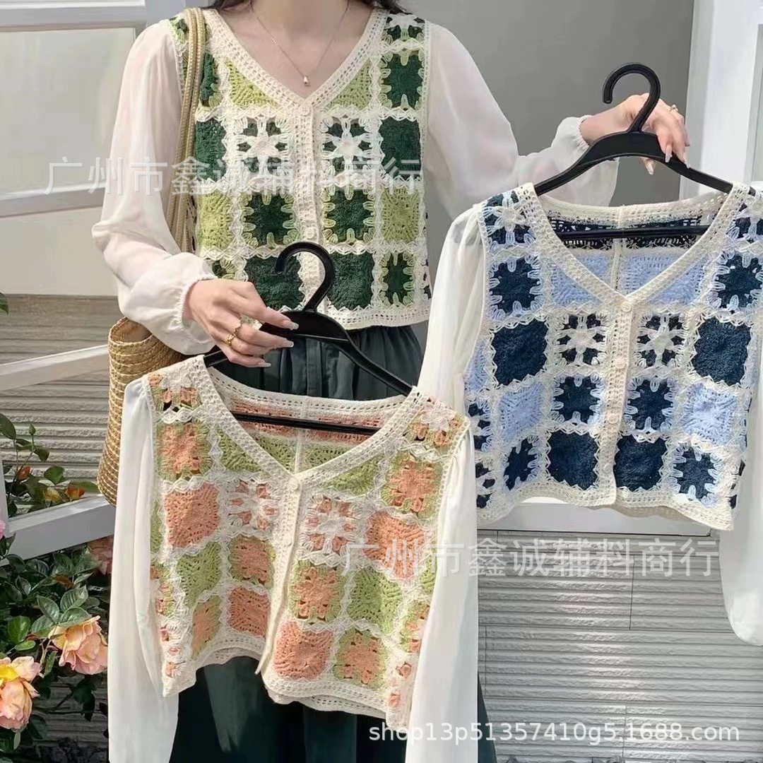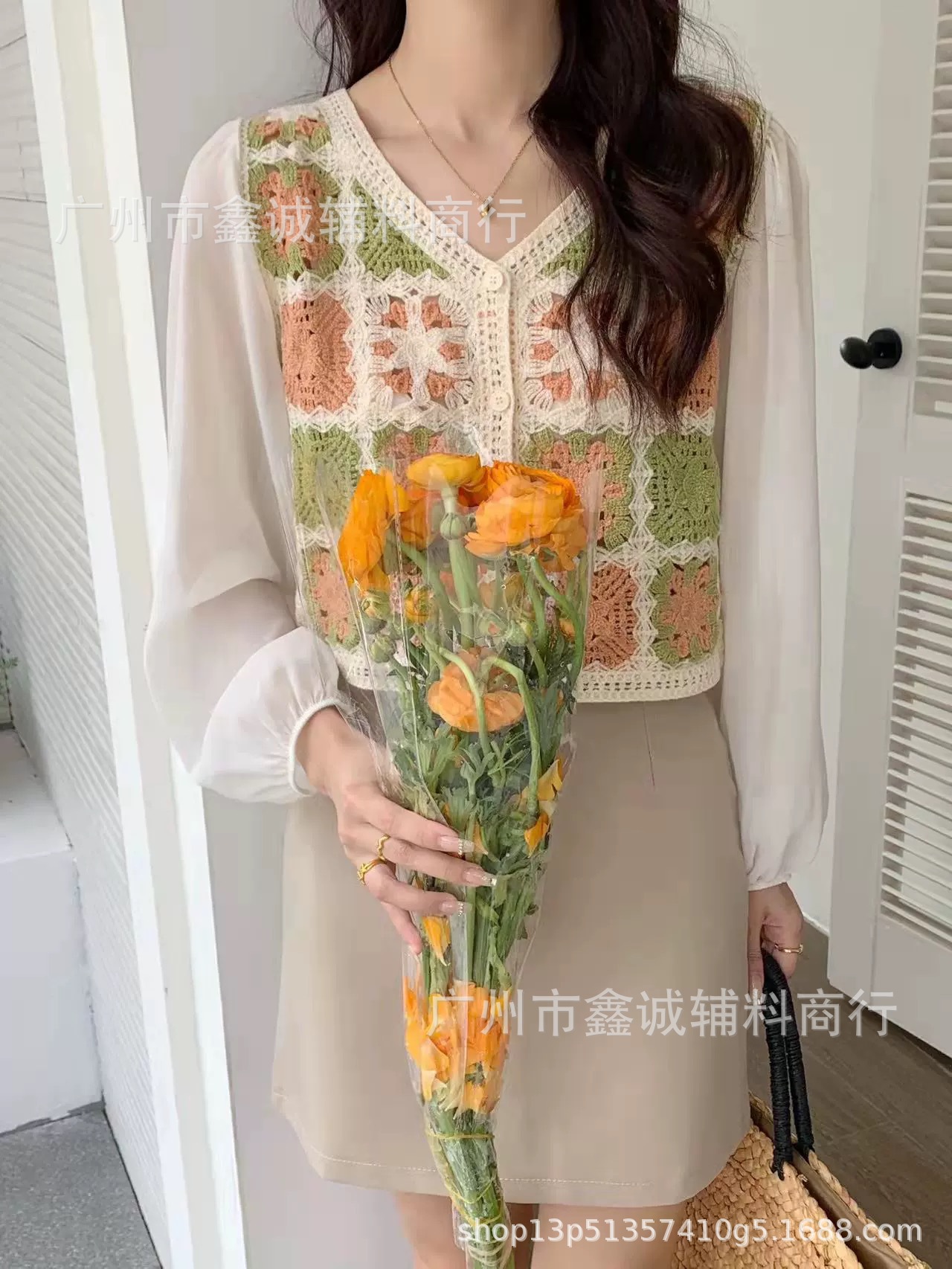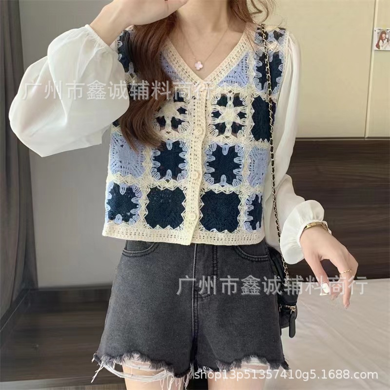 한국식 레트로 V-넥 중공 긴팔 쉬폰 셔츠 여성용 가을 크로 셰 뜨개질 틈새 퍼프 슬리브 달콤한 디자인 트렌디 탑스토어 가기