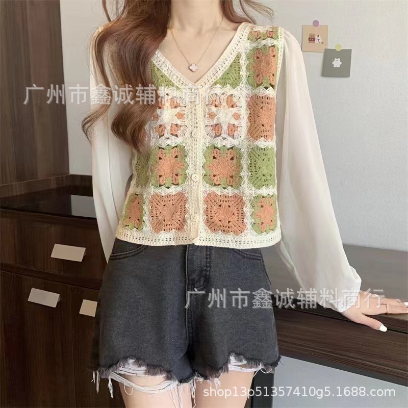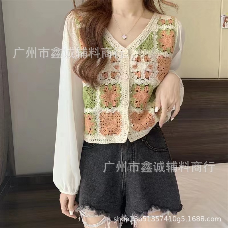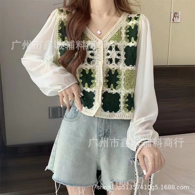 한국식 레트로 V-넥 중공 긴팔 쉬폰 셔츠 여성용 가을 크로 셰 뜨개질 틈새 퍼프 슬리브 달콤한 디자인 트렌디 탑