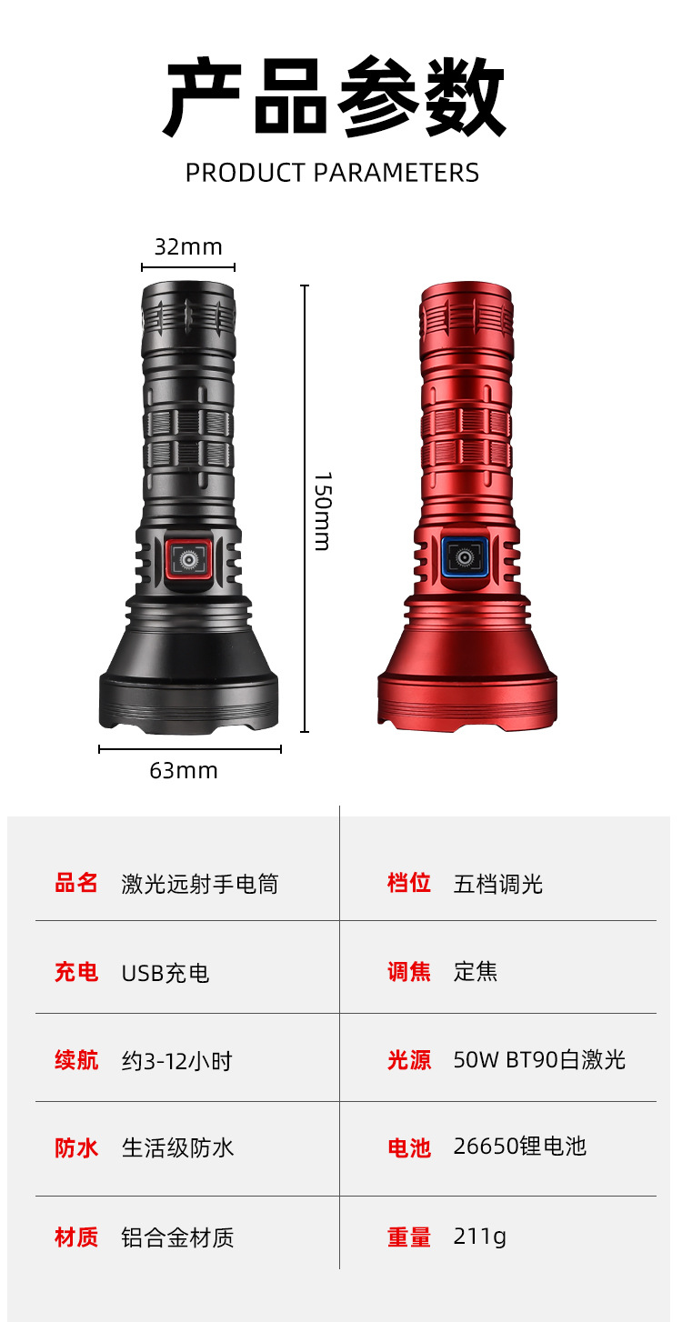 국경을 넘는 야외용 백색 레이저 강광 손전등 BT90 충전식 초강력 휴대용 일체형 98k 손전등