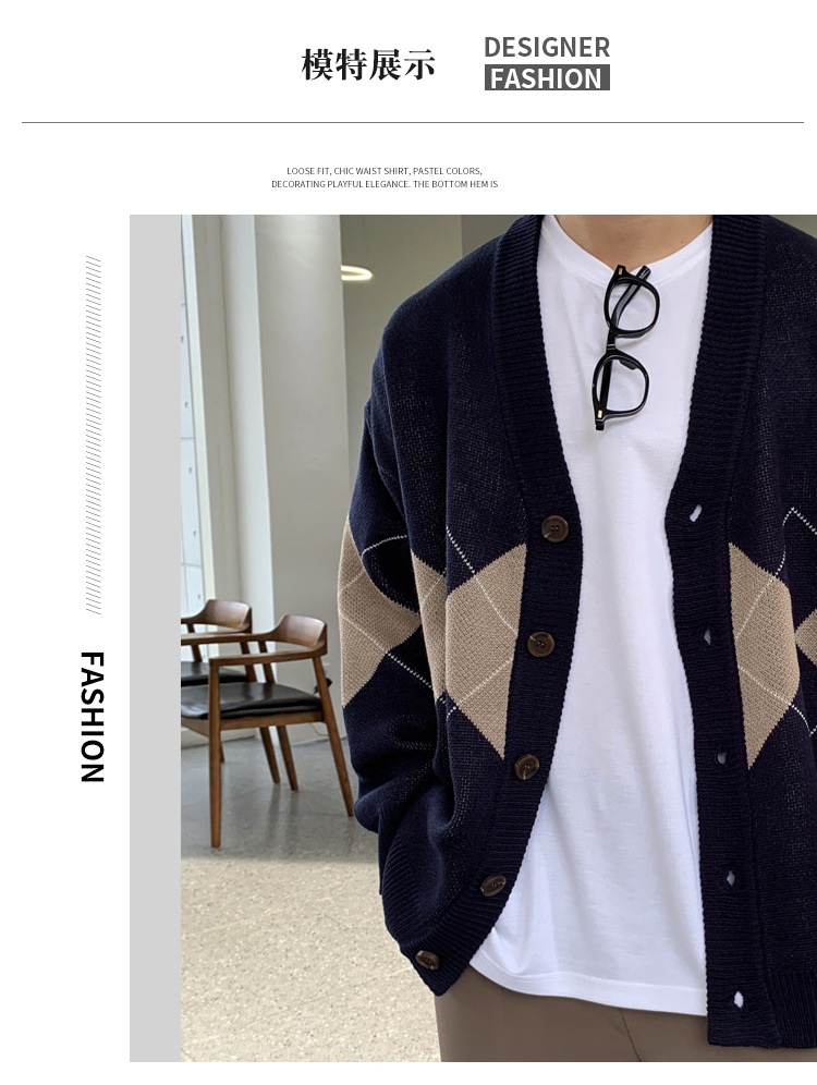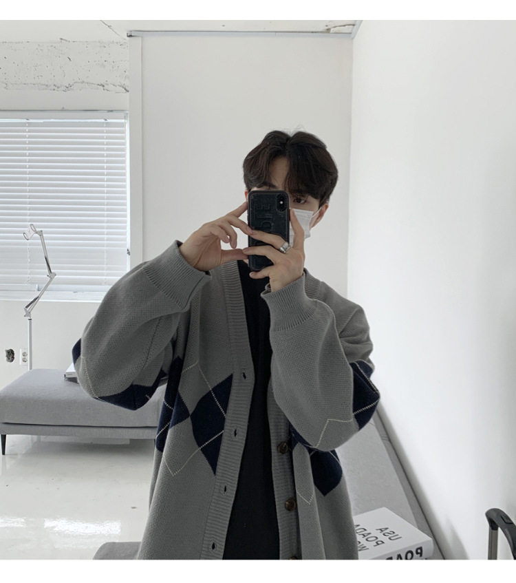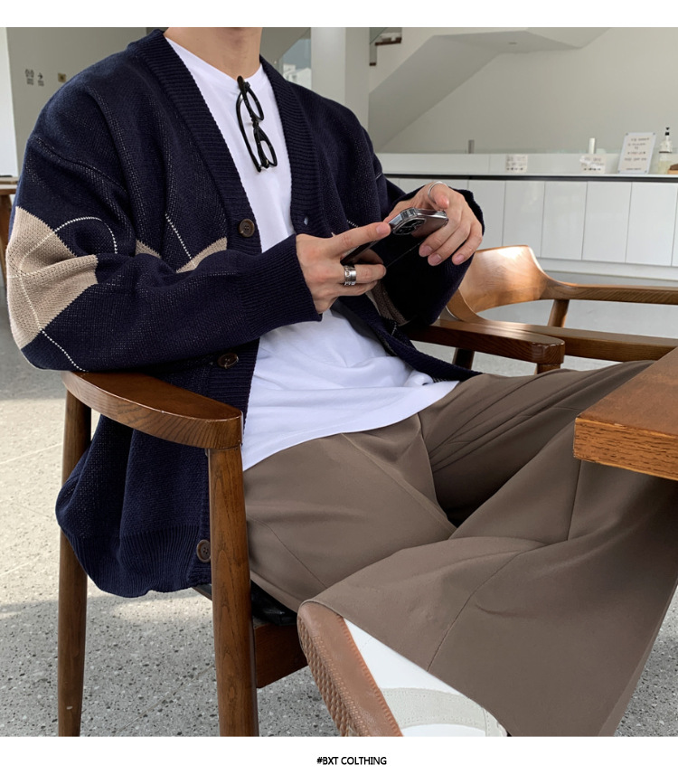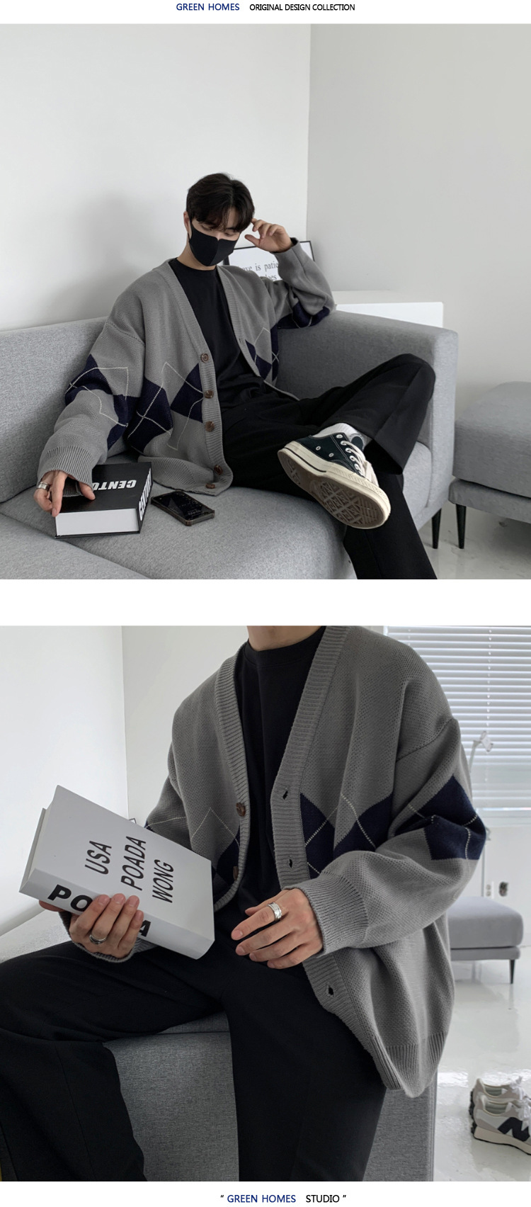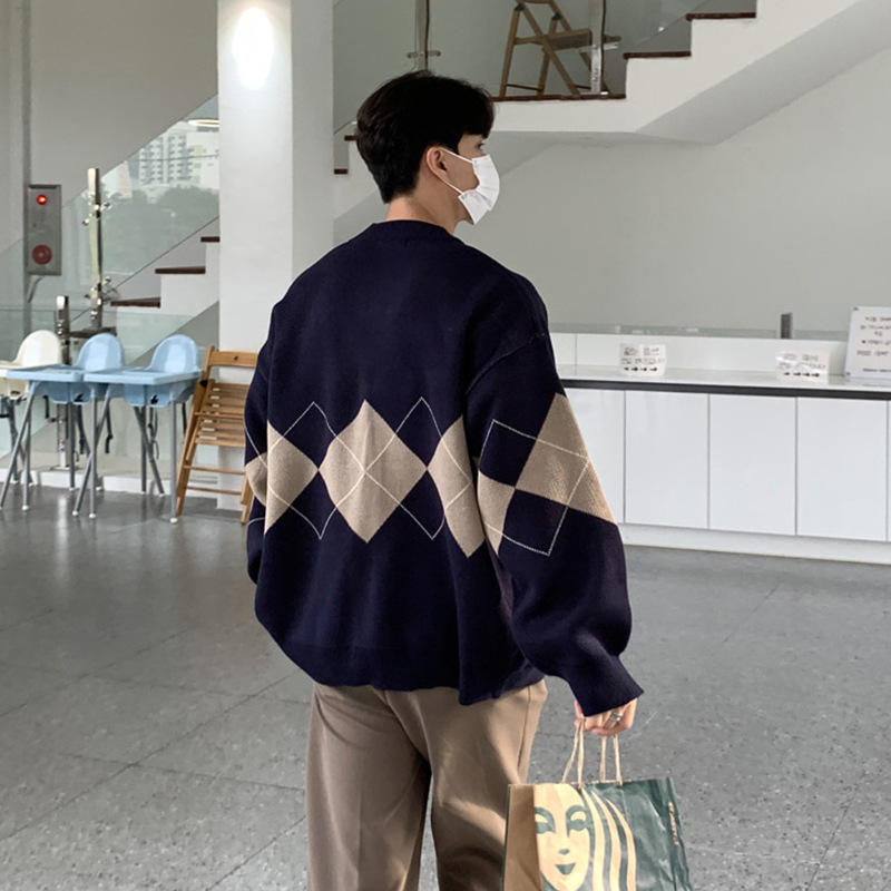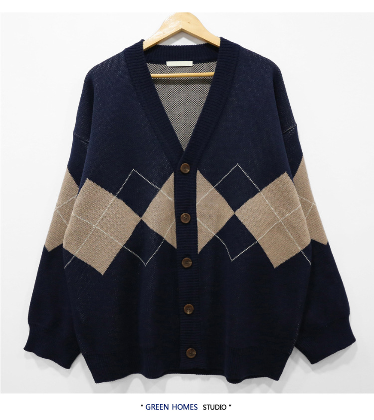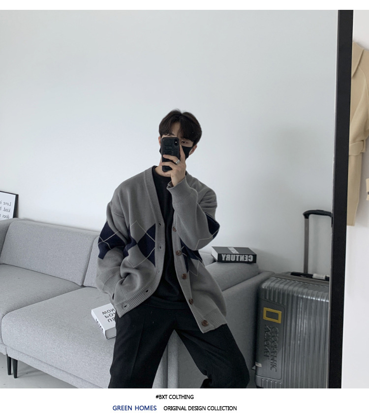 ASCLO 한국판 신상 루즈 니트 재킷 가을 겨울 남성용 멋스러운 디자인의 다이아몬드 무늬 스웨터 가디건 진한 파란색스토어 가기