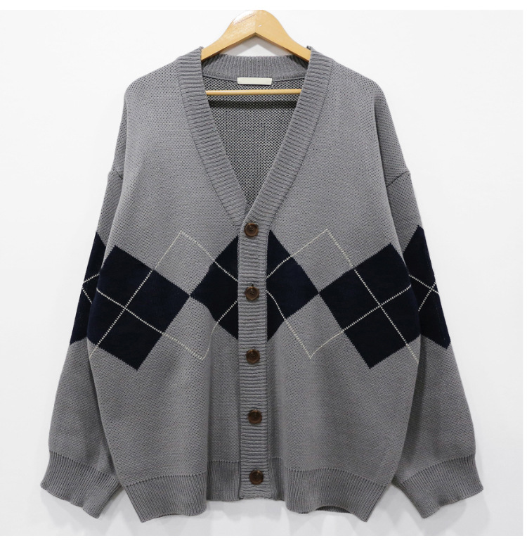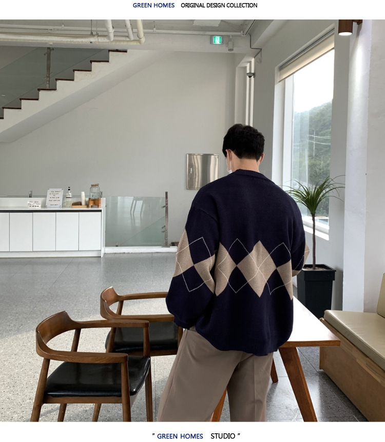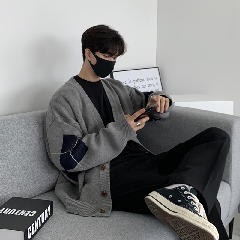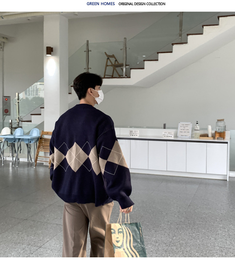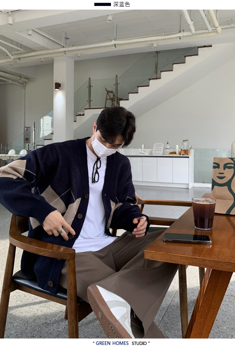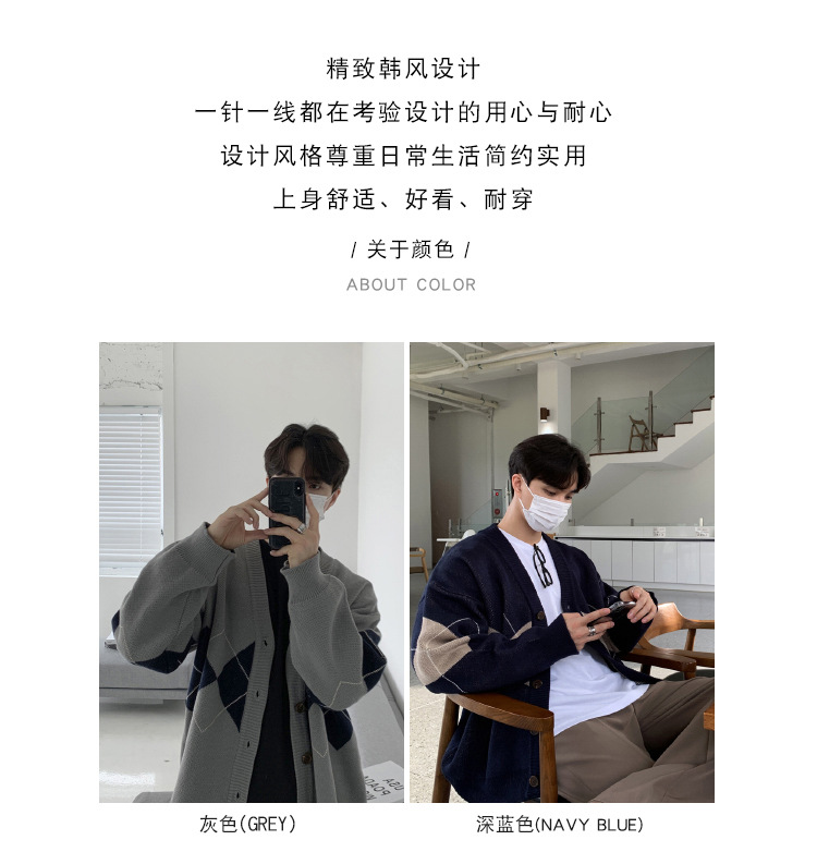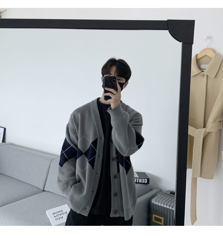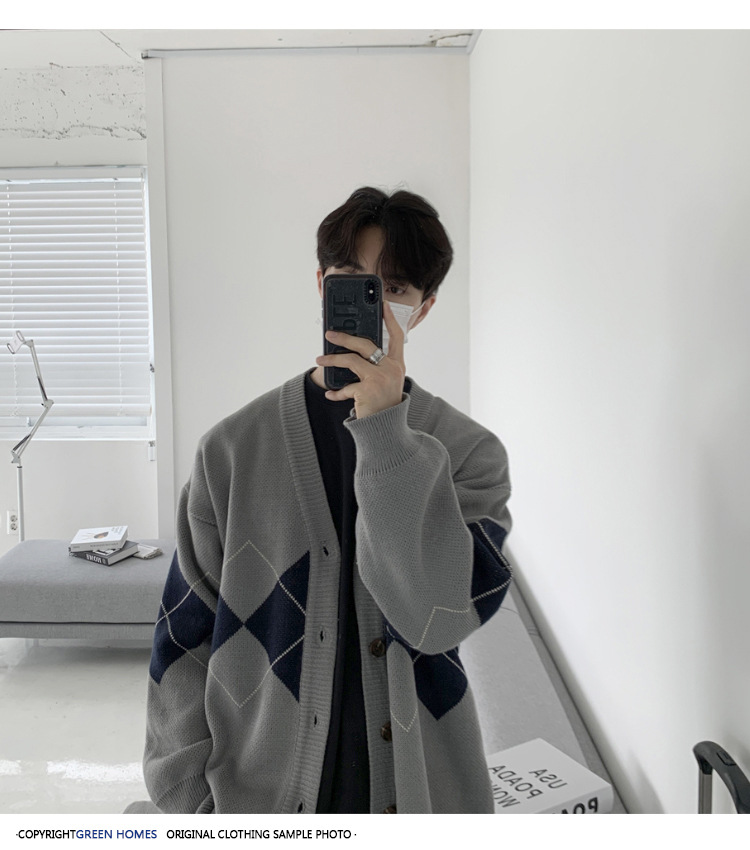 ASCLO 한국판 신상 루즈 니트 재킷 가을 겨울 남성용 멋스러운 디자인의 다이아몬드 무늬 스웨터 가디건 진한 파란색스토어 가기
