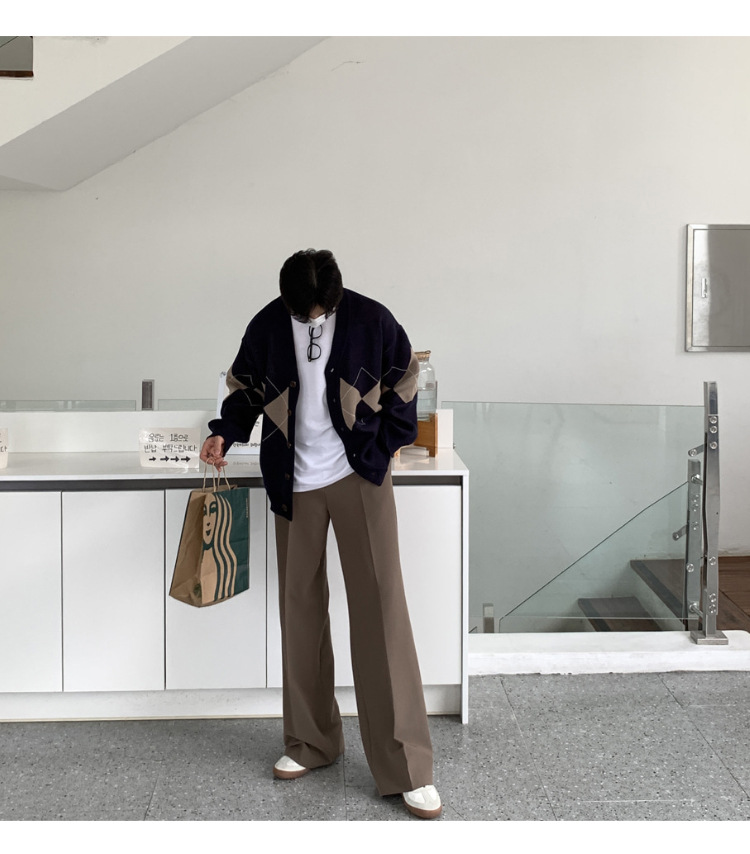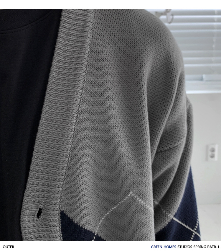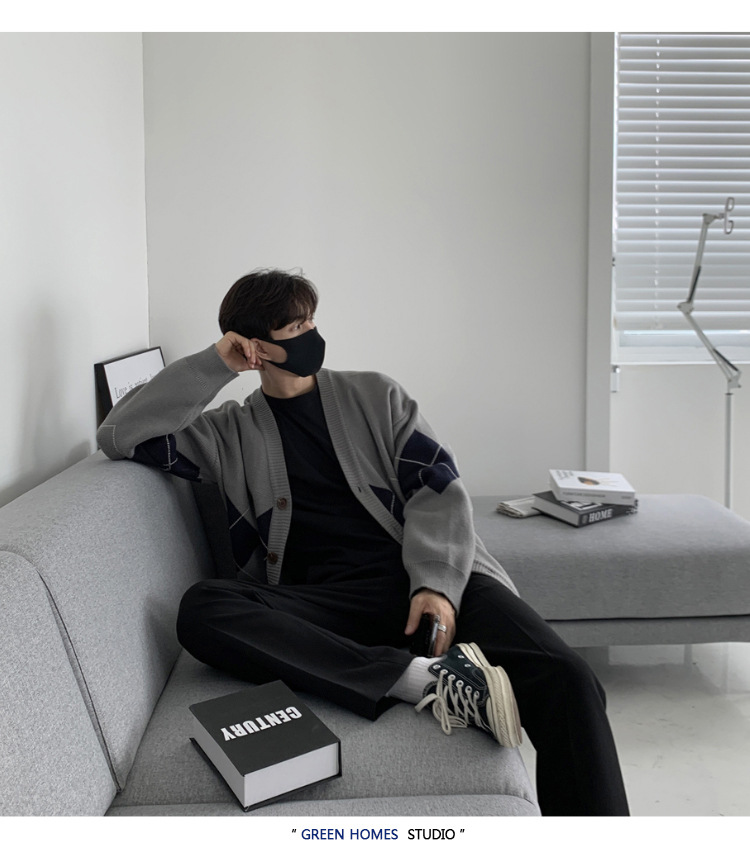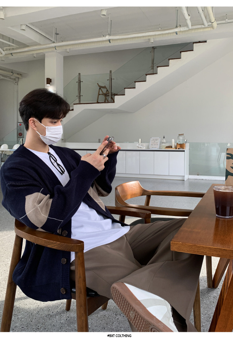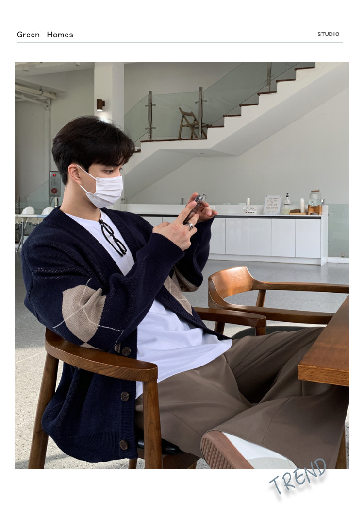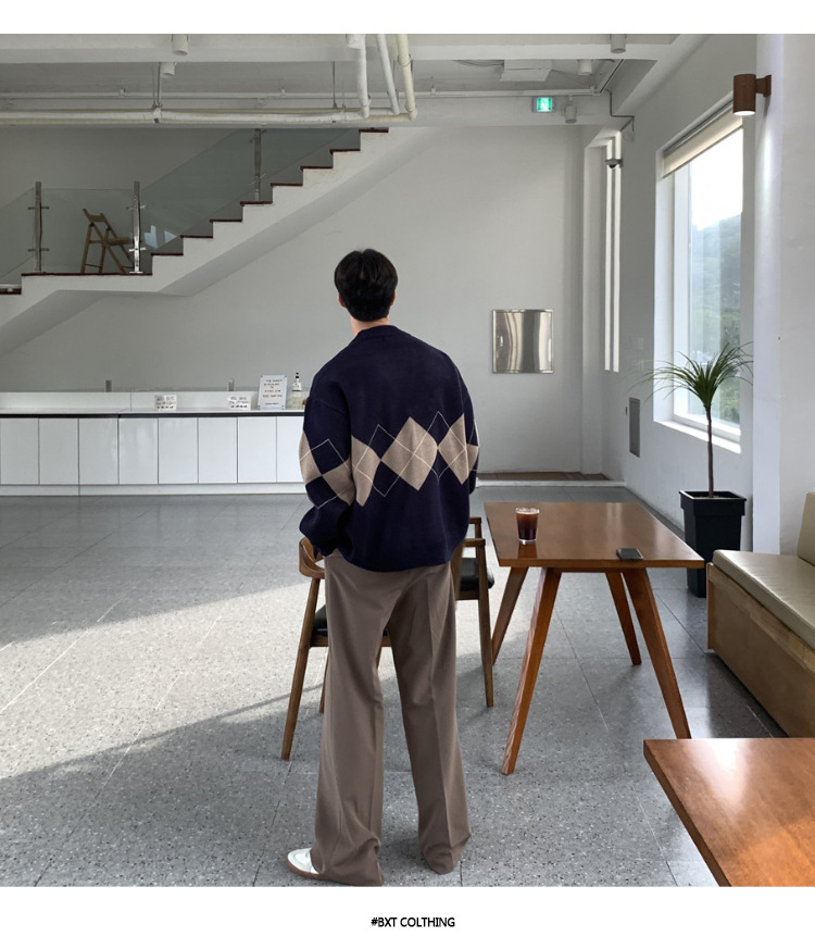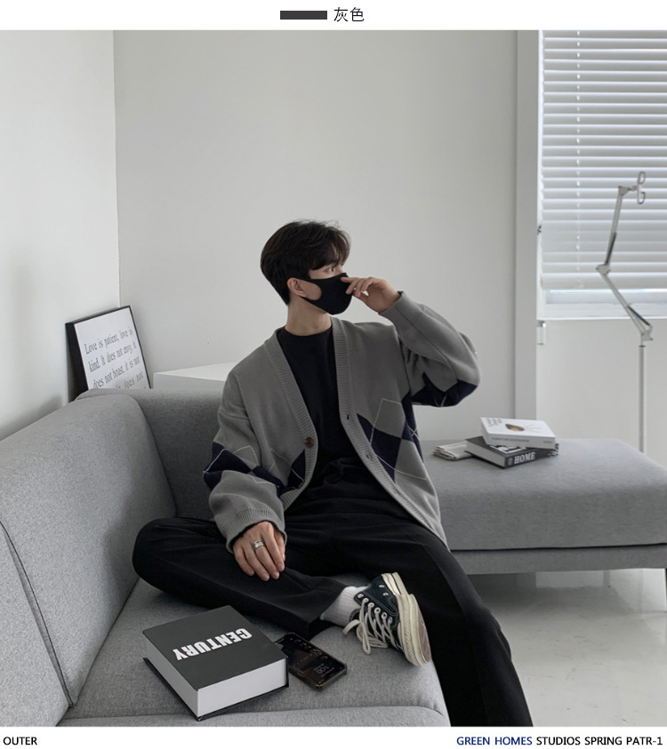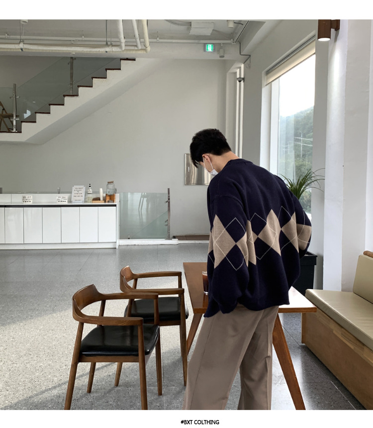 ASCLO 한국판 신상 루즈 니트 재킷 가을 겨울 남성용 멋스러운 디자인의 다이아몬드 무늬 스웨터 가디건 진한 파란색스토어 가기