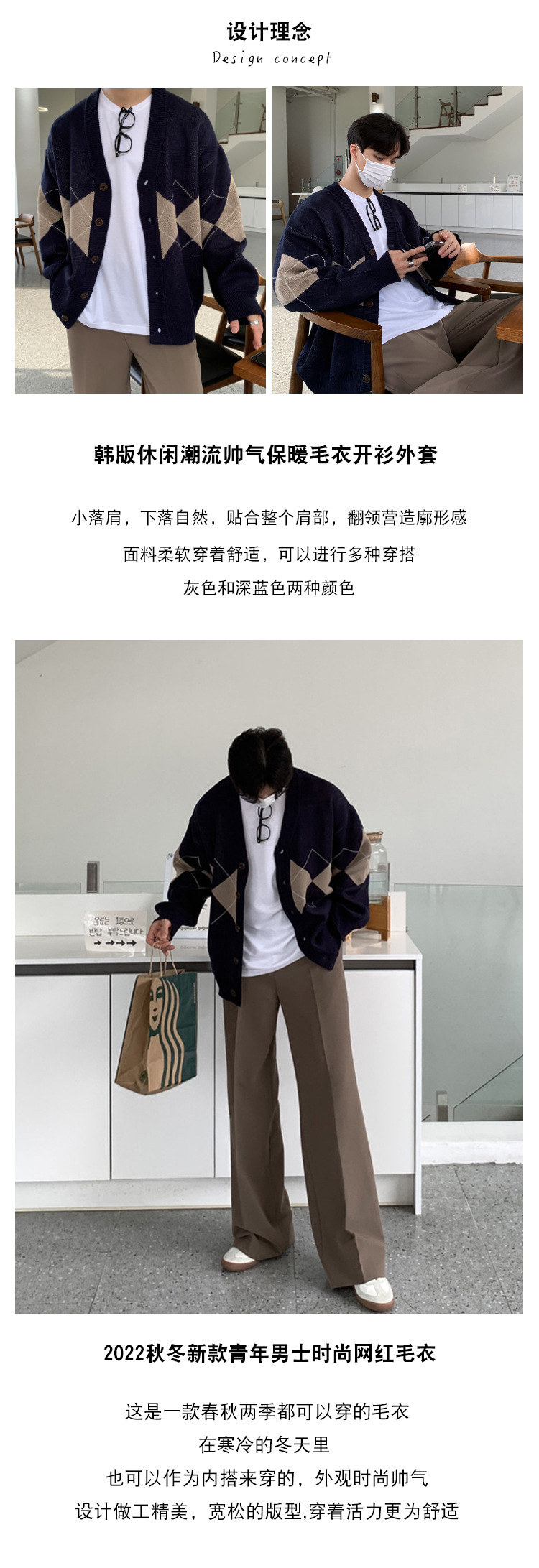 ASCLO 한국판 신상 루즈 니트 재킷 가을 겨울 남성용 멋스러운 디자인의 다이아몬드 무늬 스웨터 가디건 진한 파란색