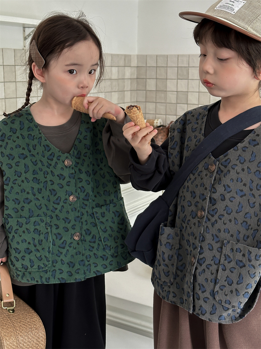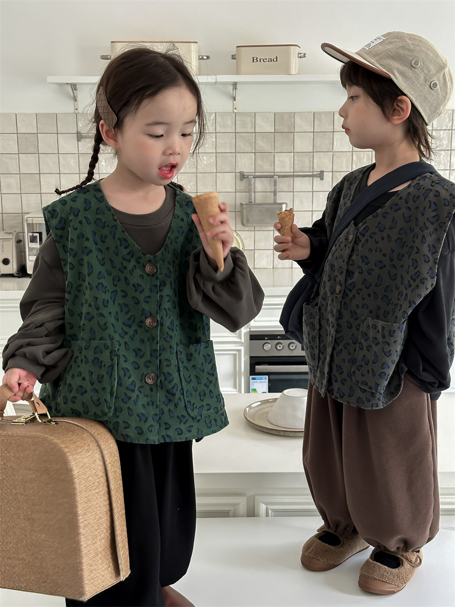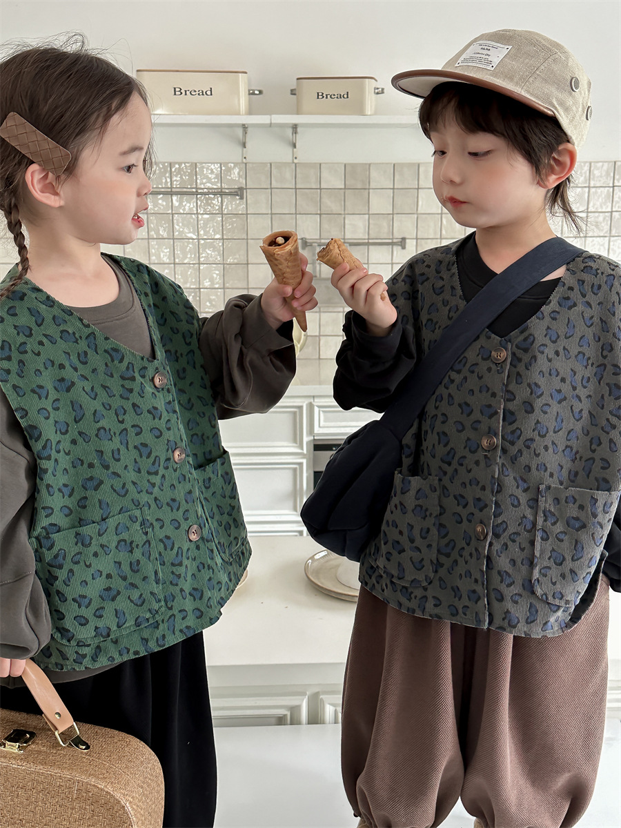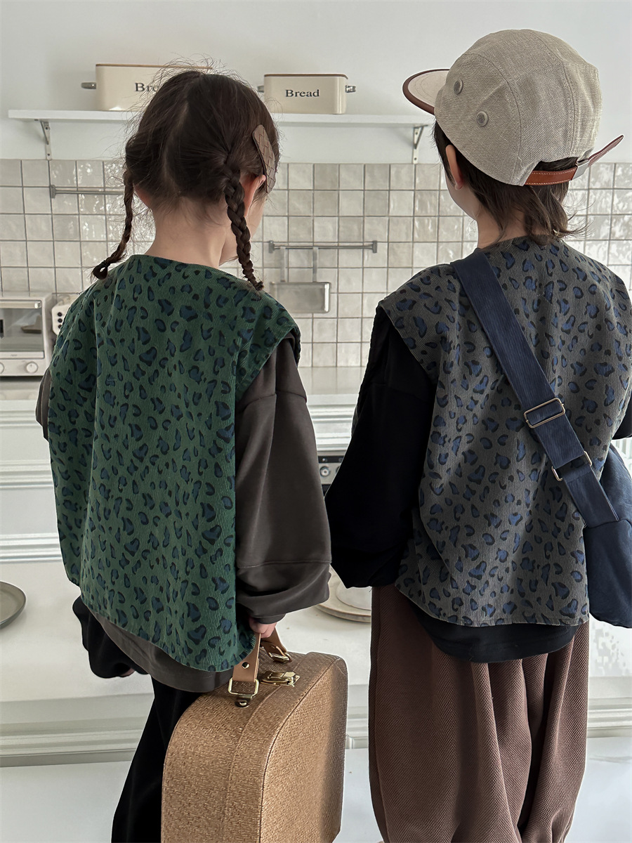 JiaYe 어린이 제품 2025 어린이 가을 레이온 레오파드 무늬 조끼 남녀 아기용 숲 스타일 루즈핏 코트 조끼